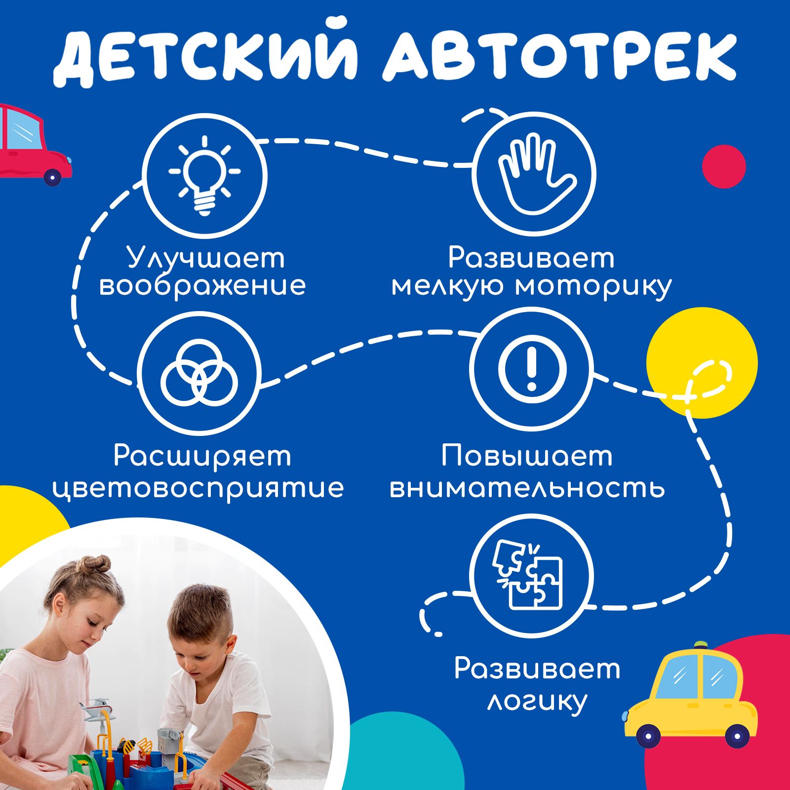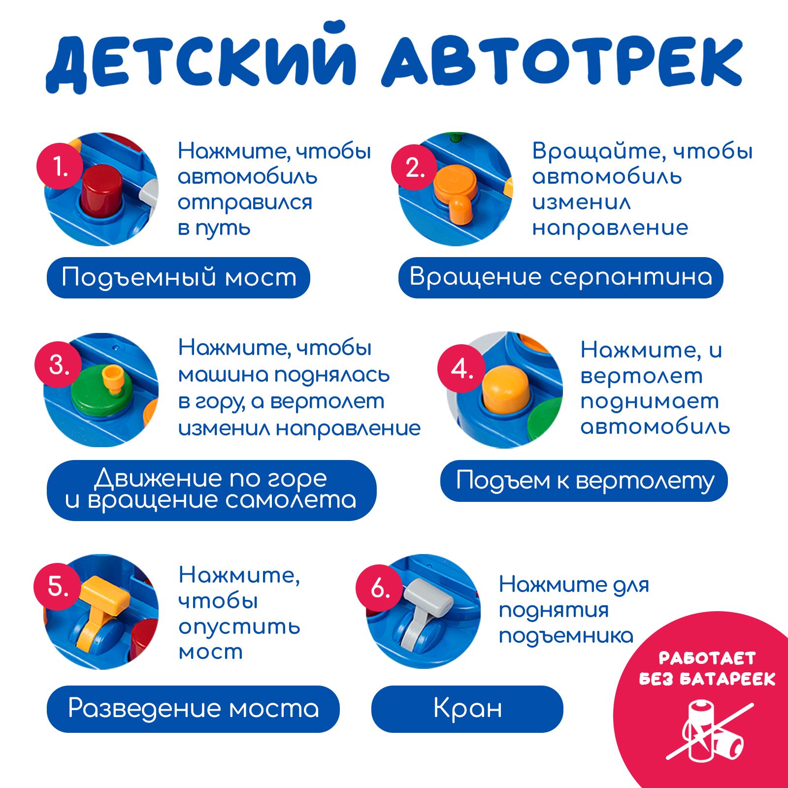 • ОписаниеРазвивающая интерактивная игра является автотреком и головоломкой одновременно и выполнена в виде красочного города. Цель - превратить в цепочку последовательных действий для свободного прохождения трассы машинками. Каждый цвет кнопок и рычагов соответствует своему элементу и приводит в движение один из механизмов. Таким образом, нужно задействовать все механизмы для прохождения препятствий. С помощью пускового устройства можно совершать различные трюки. Автотрек - это увлекательная игра, которая отлично развивает координацию, пространственное мышление, логику, память и скорость реакции! Играть можно как одному ребенку, так и нескольким сразу.