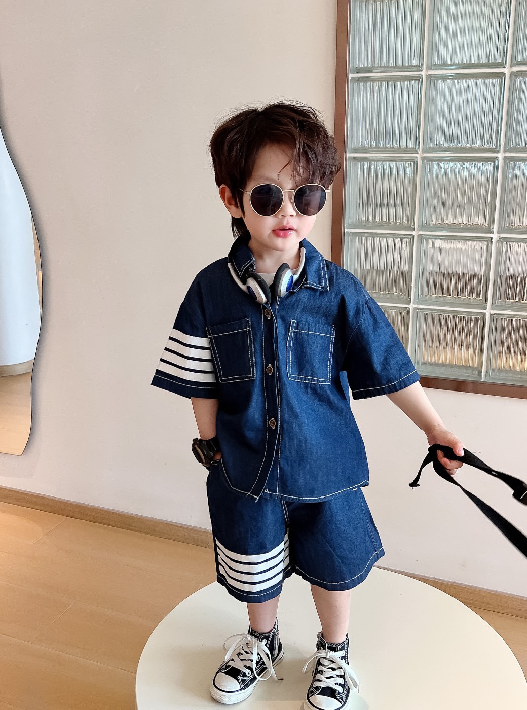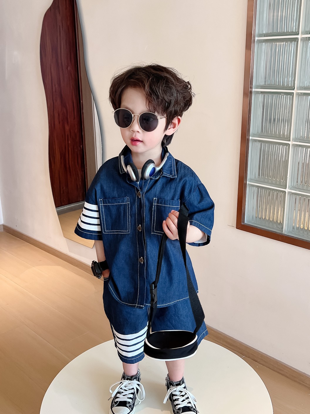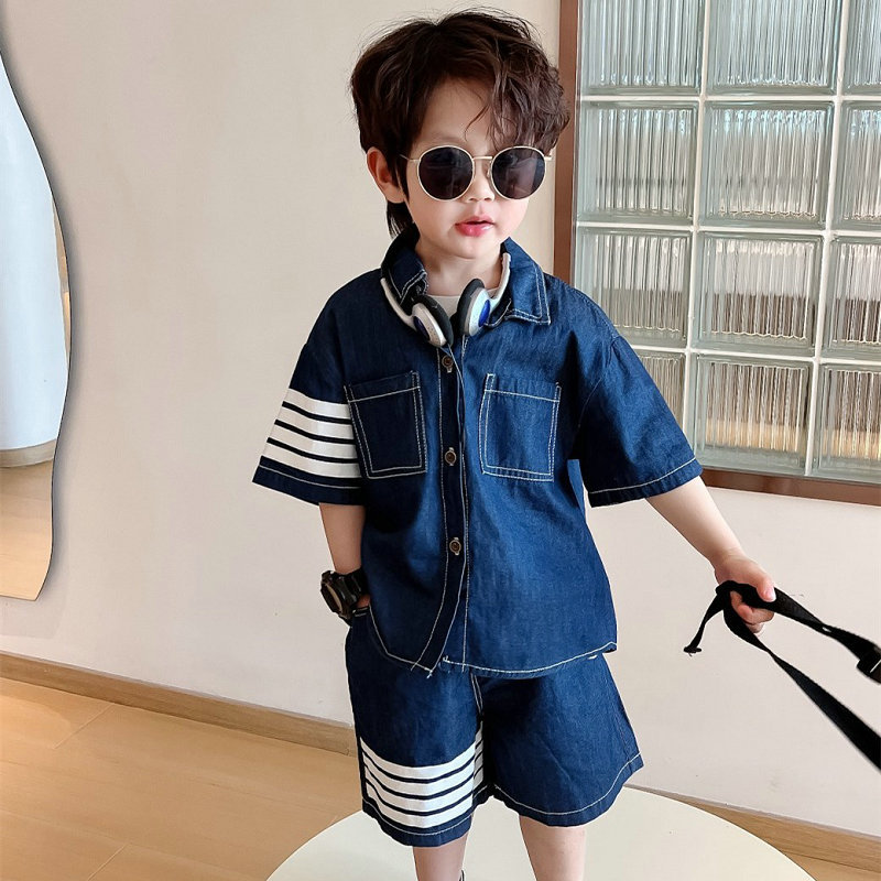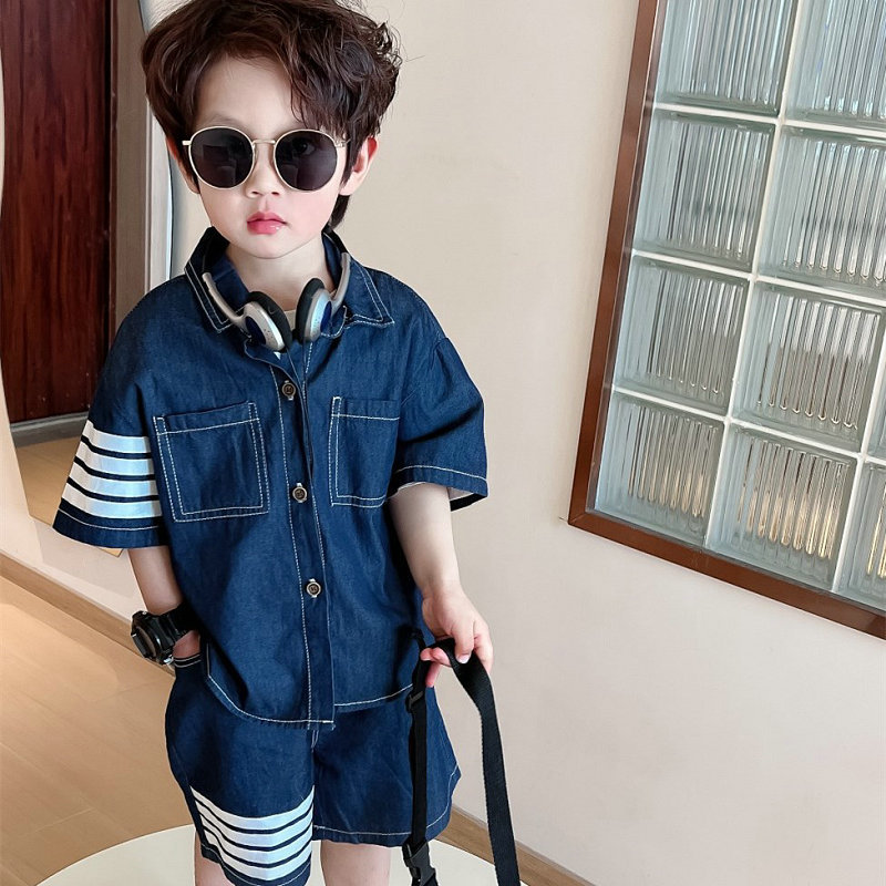 Детский джинсовый костюм для мальчиков, рубашка с коротким рукавом + шорты, комплект из двух предметов, одежда для мальчиков, детская одежда