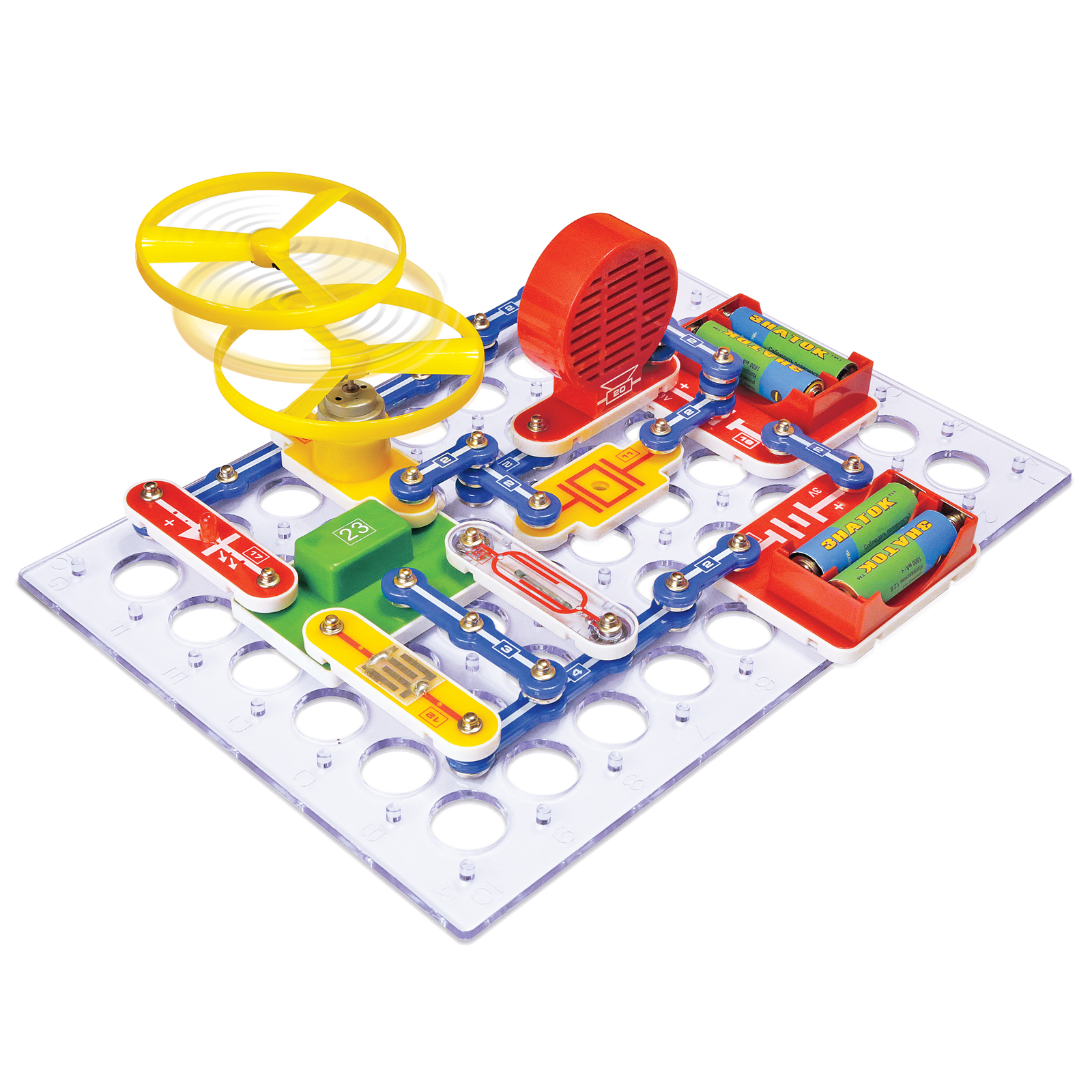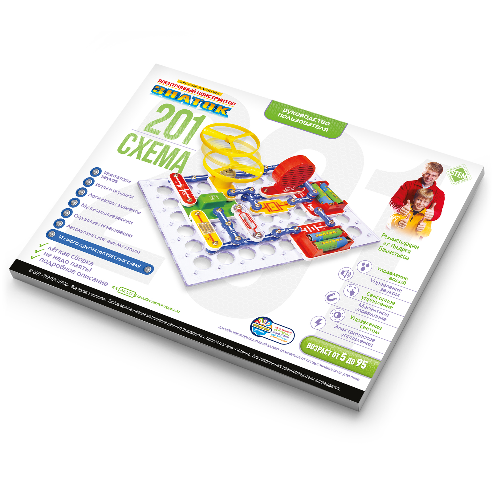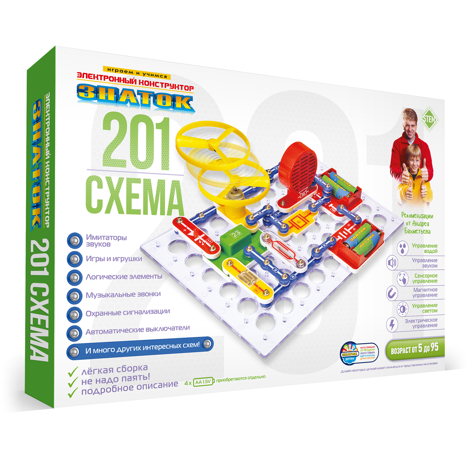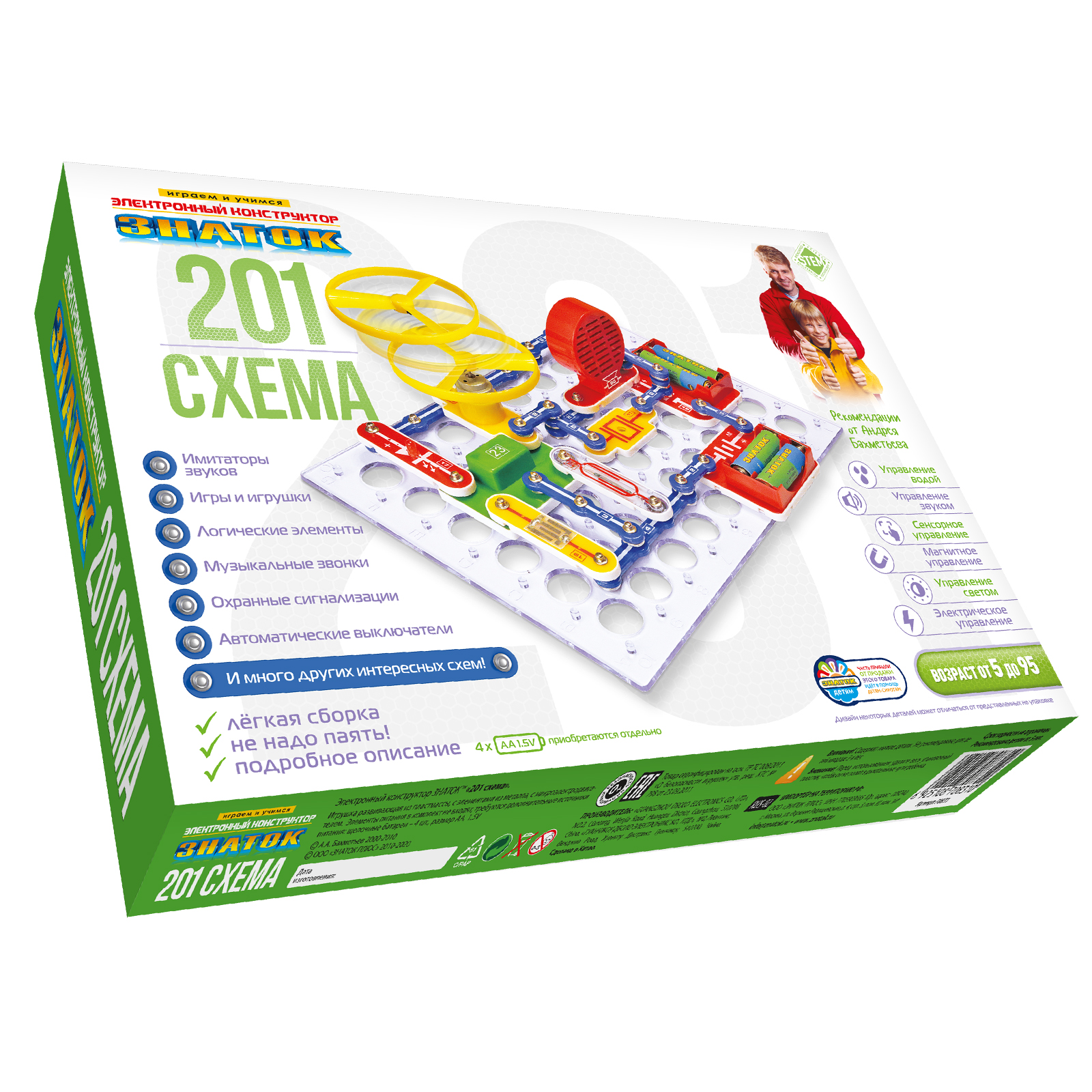 Электронный конструктор ЗНАТОК 201 схема начального уровня позволяет ребёнку познакомиться с удивительным миром электроники. Ребенок узнает принципы управления водой, звуком, светом и даже магнитом! Сможет самостоятельно собрать охранные сигнализации, музыкальные звонки! Поймет что такое логические элементы, интегральные схемы, фоторезистор и светодиод! Яркое и понятное руководство поможет ребёнку, всего за несколько минут, собрать и испытать любую схему! Абсолютная безопасность и простота сборки - не надо паять! Удовольствие получают не только дети, но и их родители! В комплекте руководство пользователя с перечнем элементов и их расположением. Для работы схем необходимы 4 батареи (приобретаются отдельно) размера АА, напряжением 1,5 V.