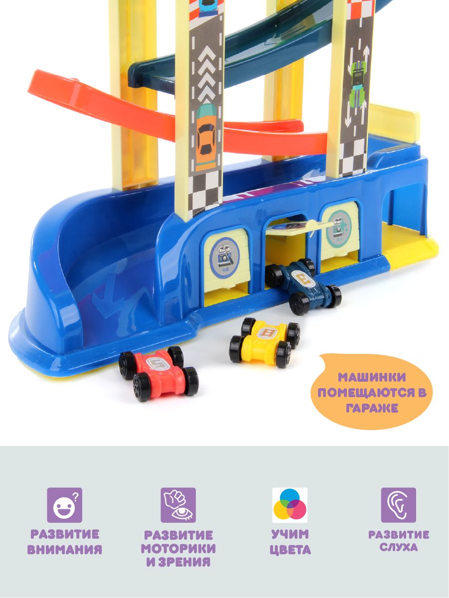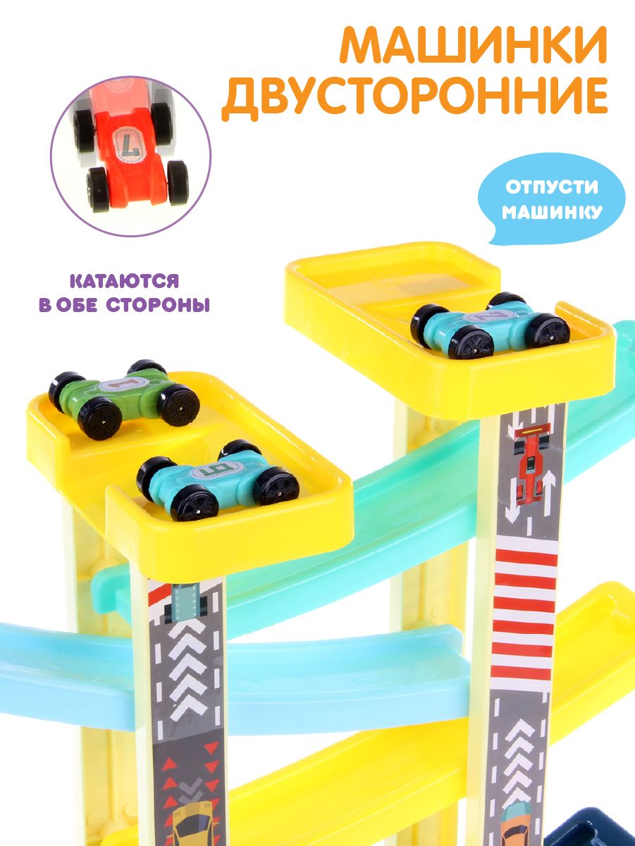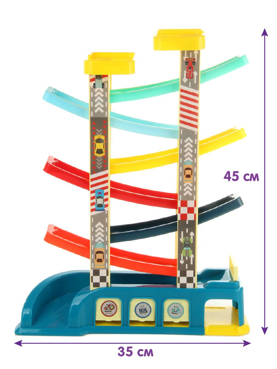 Горка для игрушечных машинок имеет 6 уровней, по которым скатывается игрушечный транспорт. Есть паркинг, куда помещаются двусторонние машинки, двери гаража открываются.