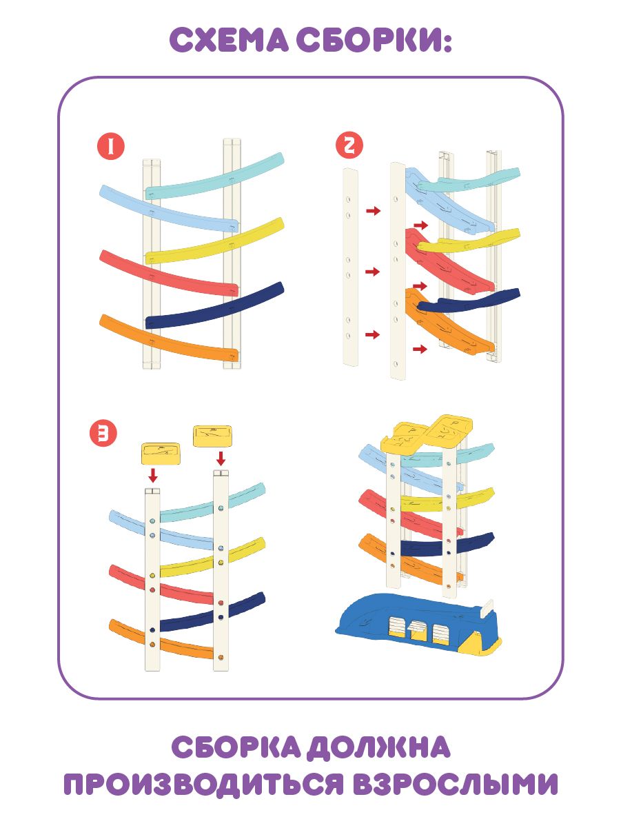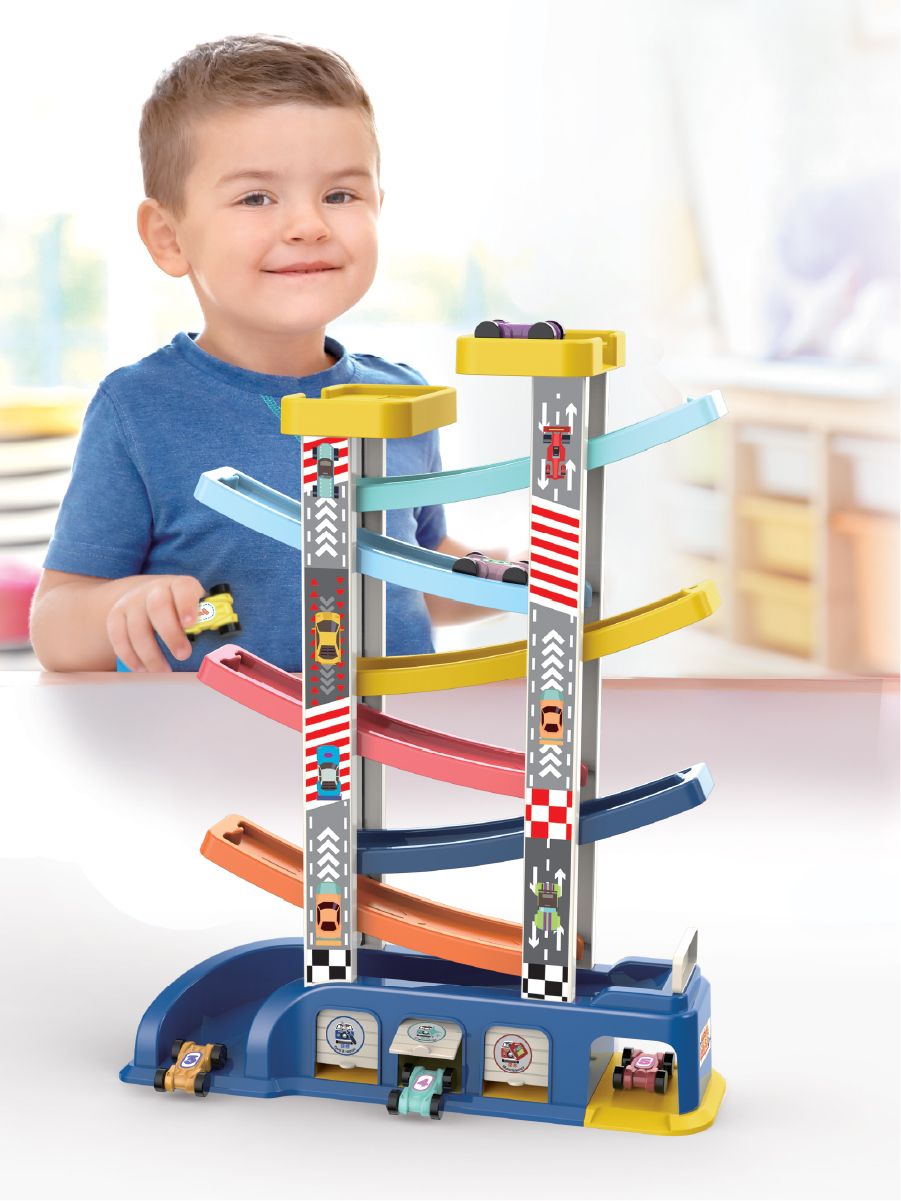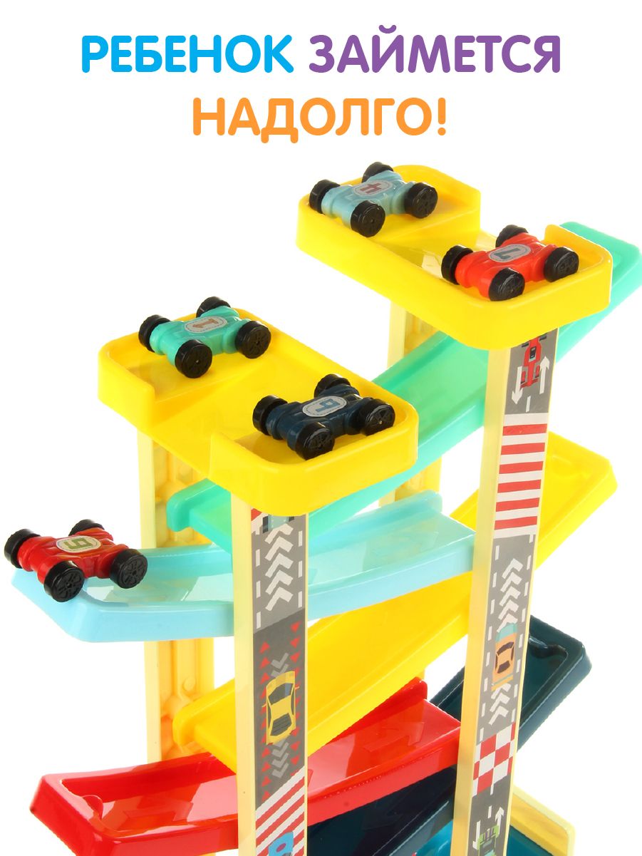 Горка для игрушечных машинок имеет 6 уровней, по которым скатывается игрушечный транспорт. Есть паркинг, куда помещаются двусторонние машинки, двери гаража открываются.