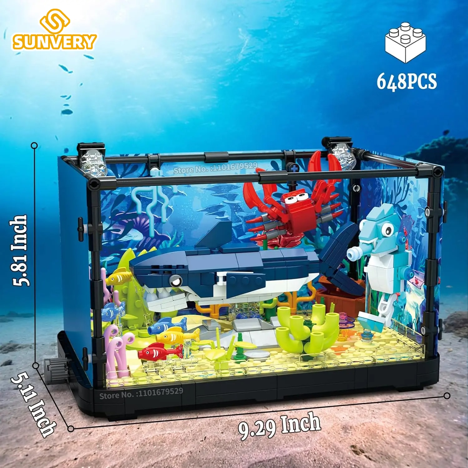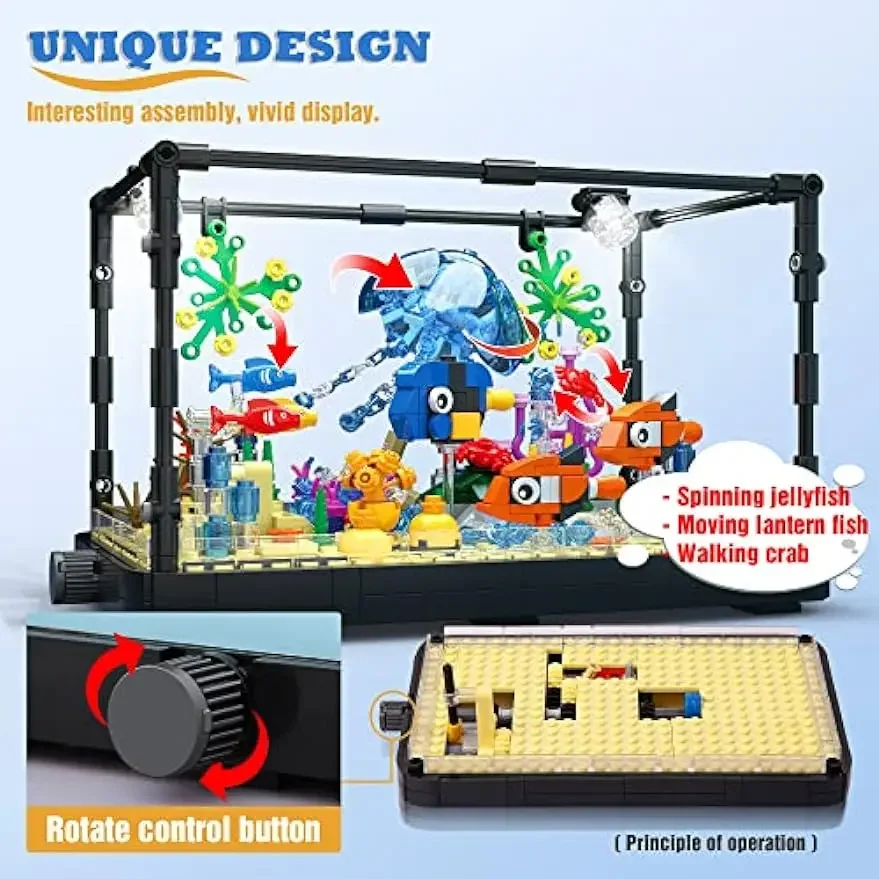 • 🐟【Интересные строительные игрушки】 Сбоку аквариума есть кнопка, которую можно повернуть, повернуть, и Медуза и рыба будут двигаться соответственно. В то же время оснащен съемной океанической фоновой доской, которая делает аквариум более обильным.