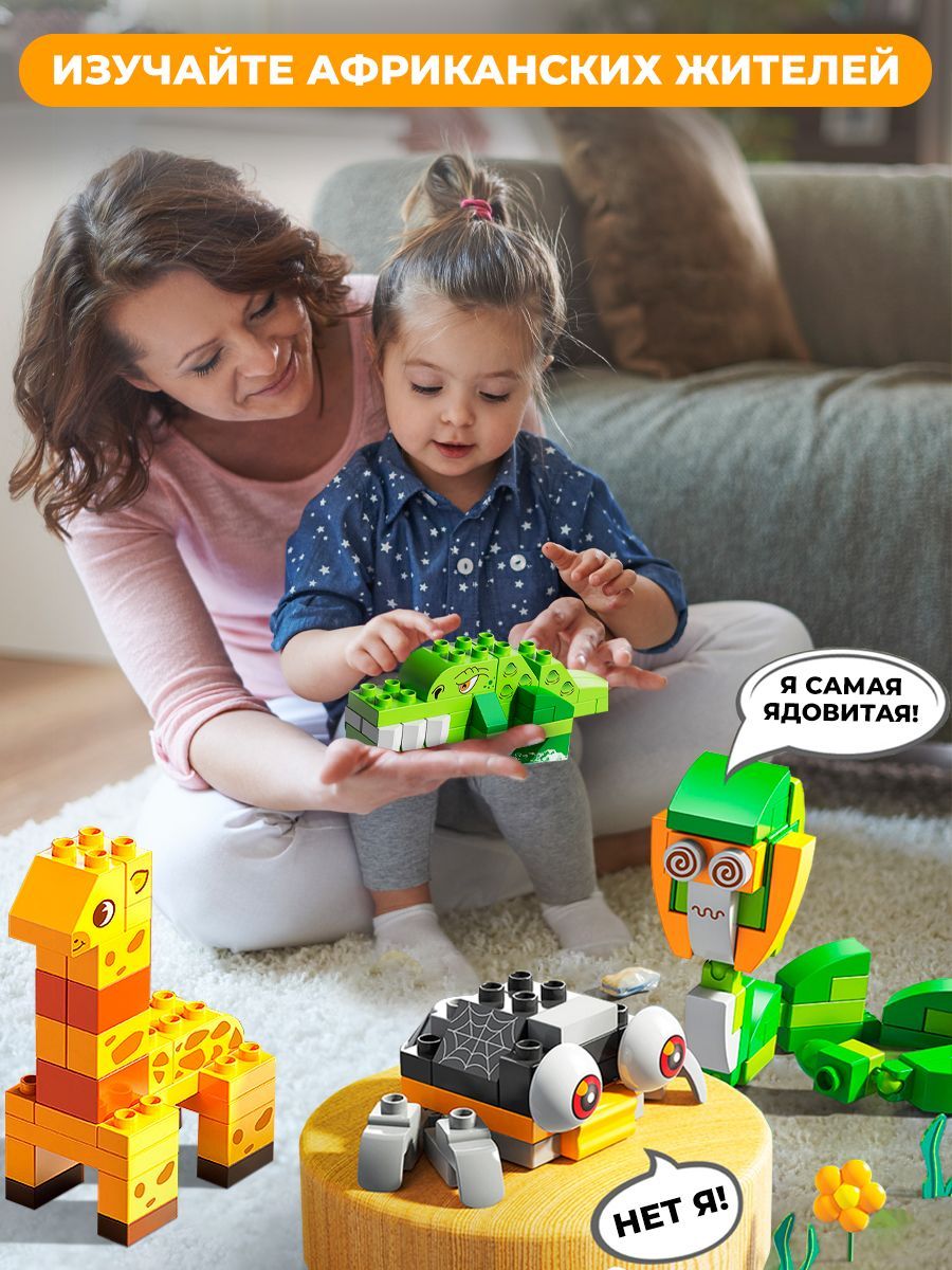 Описание: Конструктор зоопарк крупный для малышей, животные Африки Развивающий игровой набор 3д конструктор зоопарк с крупными деталями приведет в восторг и станет самой любимой игрушкой мальчиков и девочек. Сборная модель конструктор для самых маленьких подойдет для игр детям от одного года и позволит собрать фигурки животных Африки из разноцветных больших деталей, которые формируют полезные навыки ребенка. Обязательно привлекут к себе внимание и помогут придумать интересный сюжет игры, где малыш сможет самостоятельно построить мини зоопарк для диких зверей, домашних и морских животных и птиц.