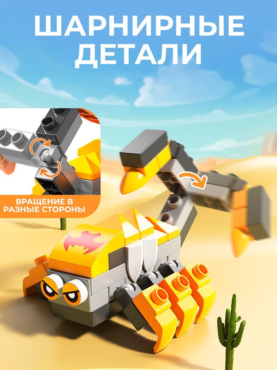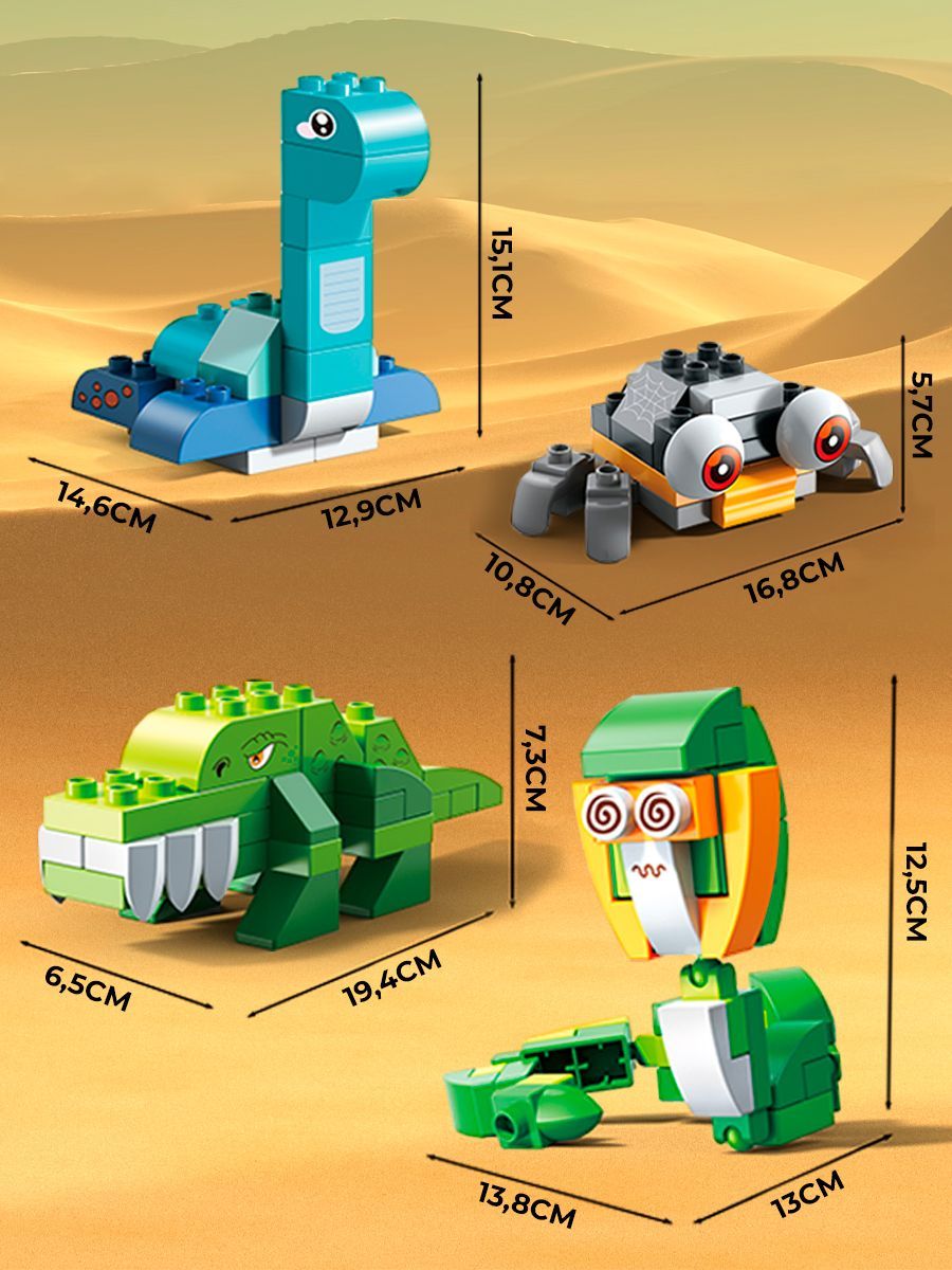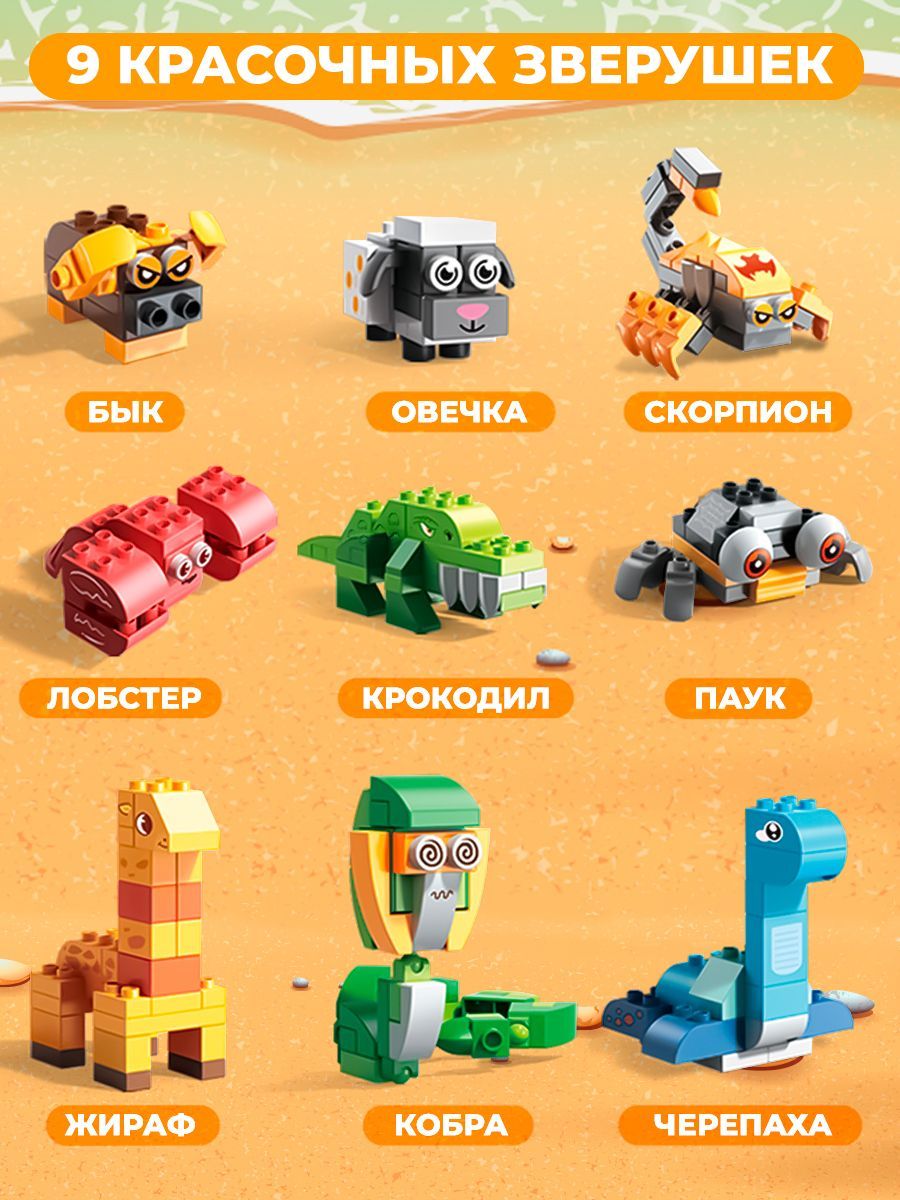 Динамический конструктор с крупными кирпичиками состоит из 239 деталей разнообразных форм, с помощью которых малыш сможет собрать фигурки жирафа, паучка, быка, овечки, лобстера, крокодила, змеи, скорпиона и черепашек.
