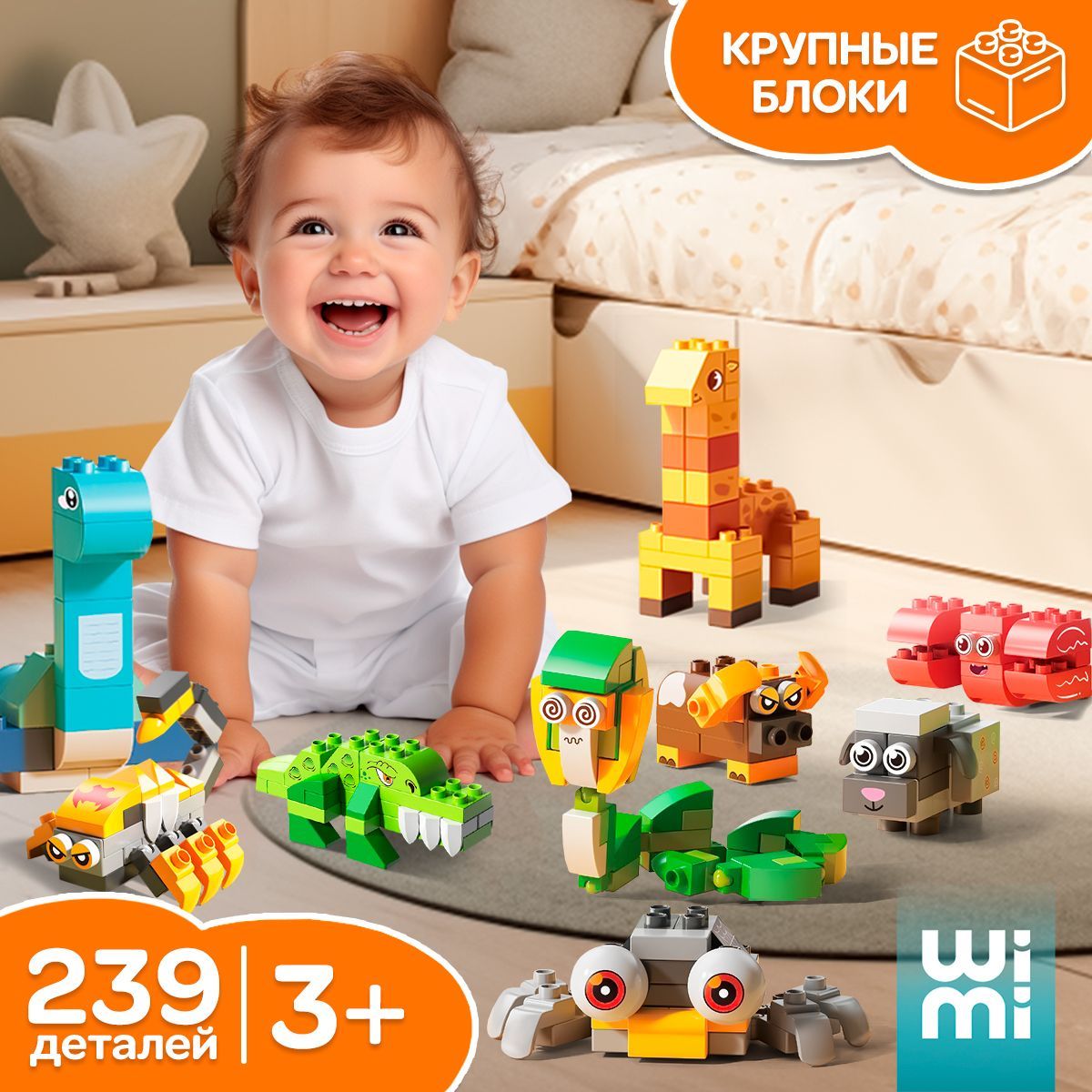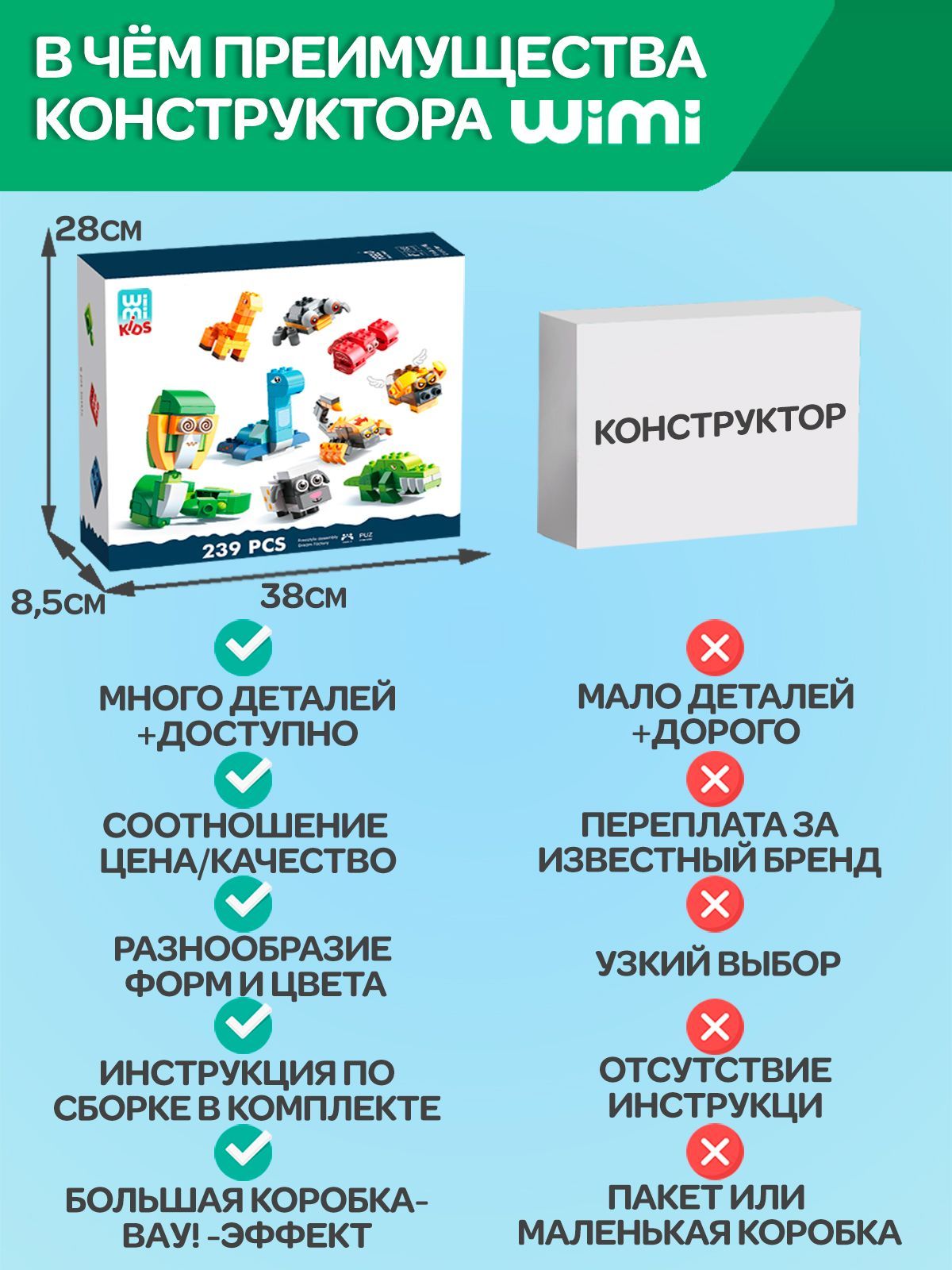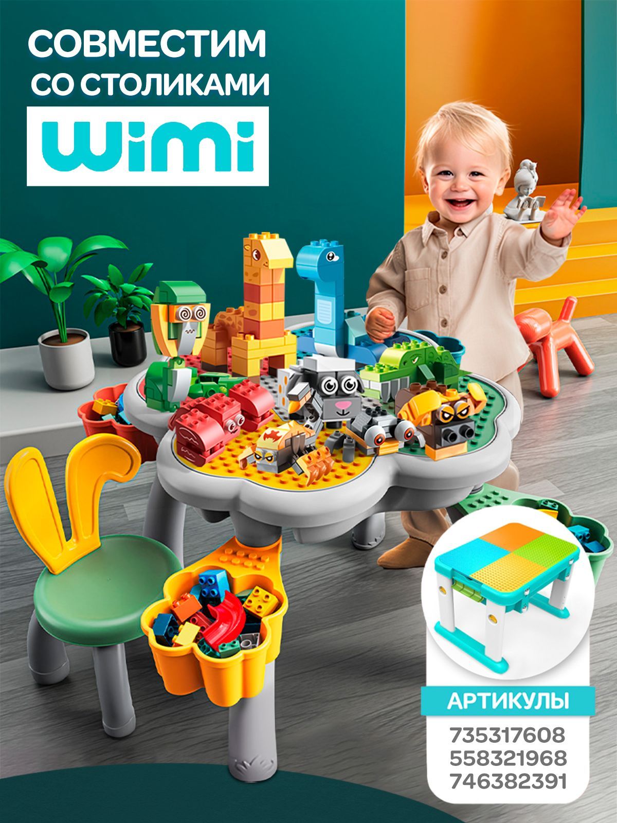 Наборы совместимы с другими конструктами известных брендов, а также с развивающими столиками для творчества WiMi.