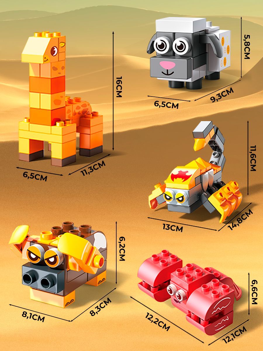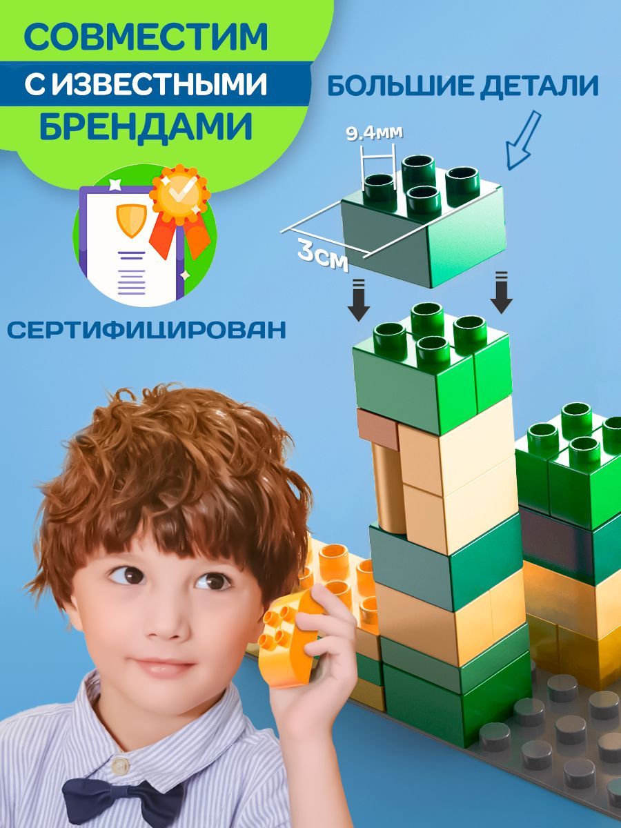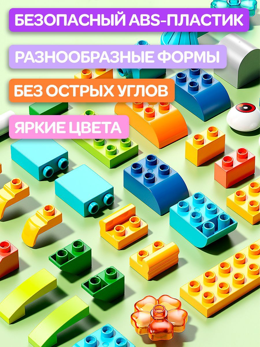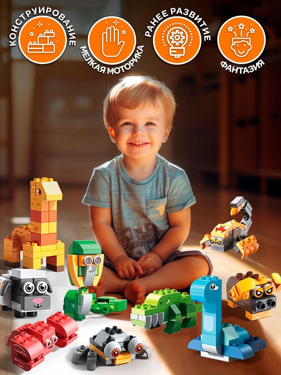 Ребенку понравится собирать новые модельки зверушек, развивая сенсорику, мелкую моторику рук, интеллект по методике Монтессори. Красочные крупные кирпичики станут лучшим первым конструктором для малыша. Красивые разноцветные детали формируют полезные навыки ребенка. Обязательно привлекут к себе внимание и помогут придумать интересную игру, где малыш сможет самостоятельно построить большую игровую площадку.Занятия с конструктором способствует развитию у детей логического и пространственного мышления, и конструкторских способностей. Учит создавать невероятные сооружения из разнообразных элементов, заодно улучшает фантазию и логику. Яркие и насыщенные цвета крупных блоков формируют правильное цветовосприятие. Большие блоки идеально ложатся в маленькую детскую ладошку. Без труда соединяются между собой и разъединяются при небольшом усилии.