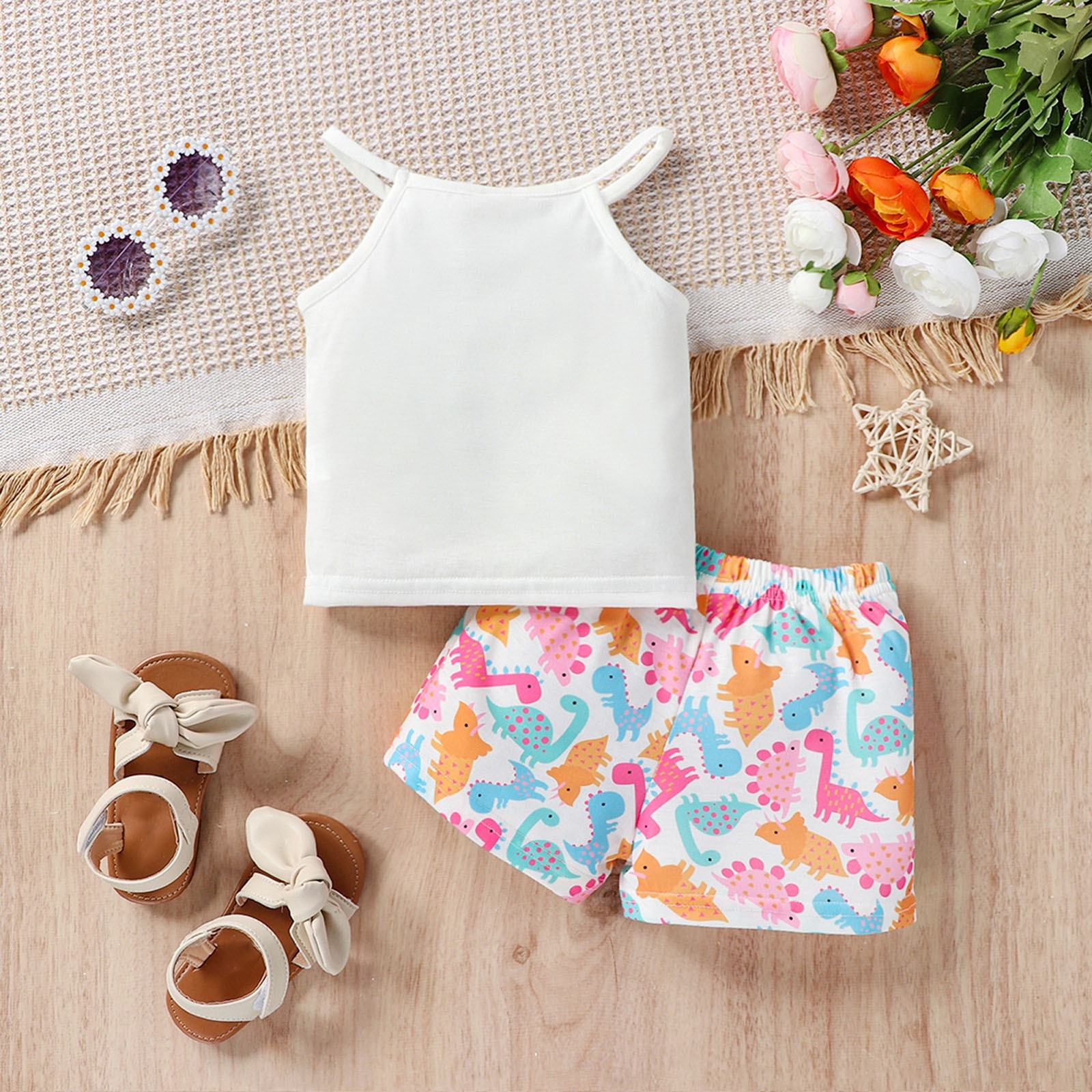 Костюм для маленьких девочек Топ без рукавов Брюки с динозаврами Буквы на подтяжках Многоцветный набор из двух предметов с принтом динозавров для девочек