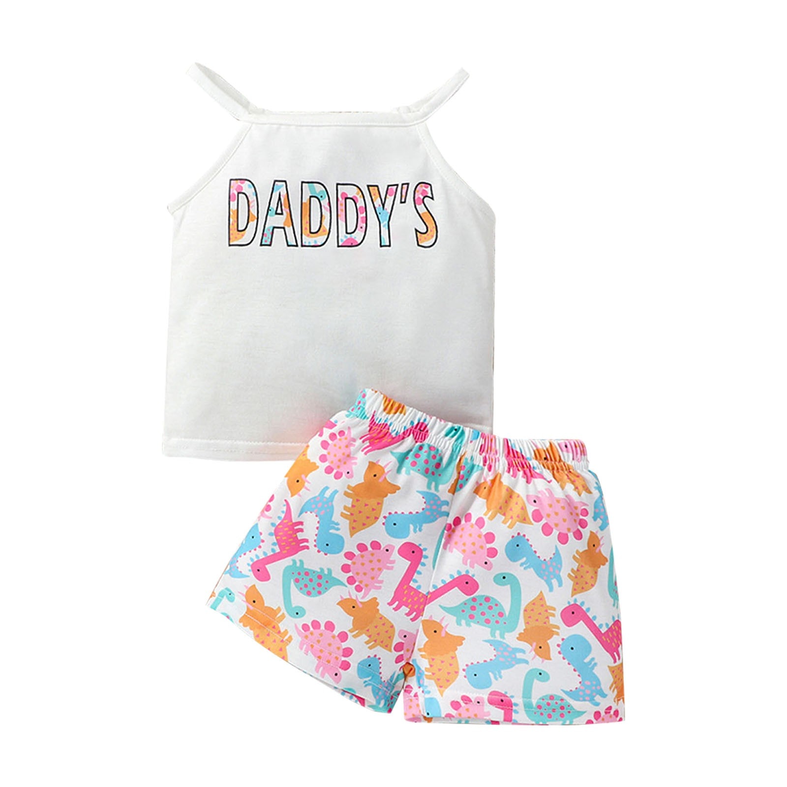 Костюм для маленьких девочек Топ без рукавов Брюки с динозаврами Буквы на подтяжках Многоцветный набор из двух предметов с принтом динозавров для девочек