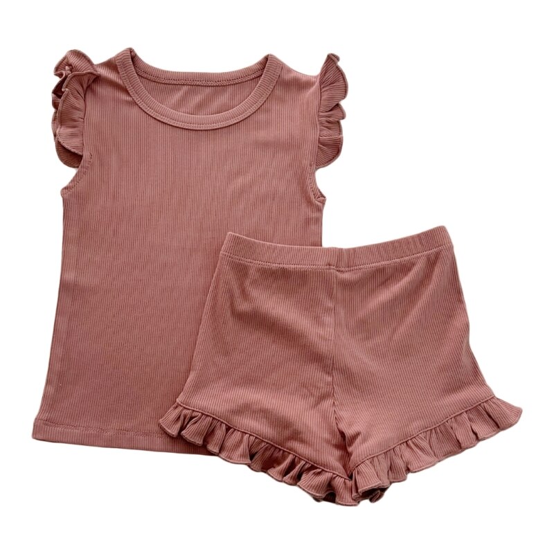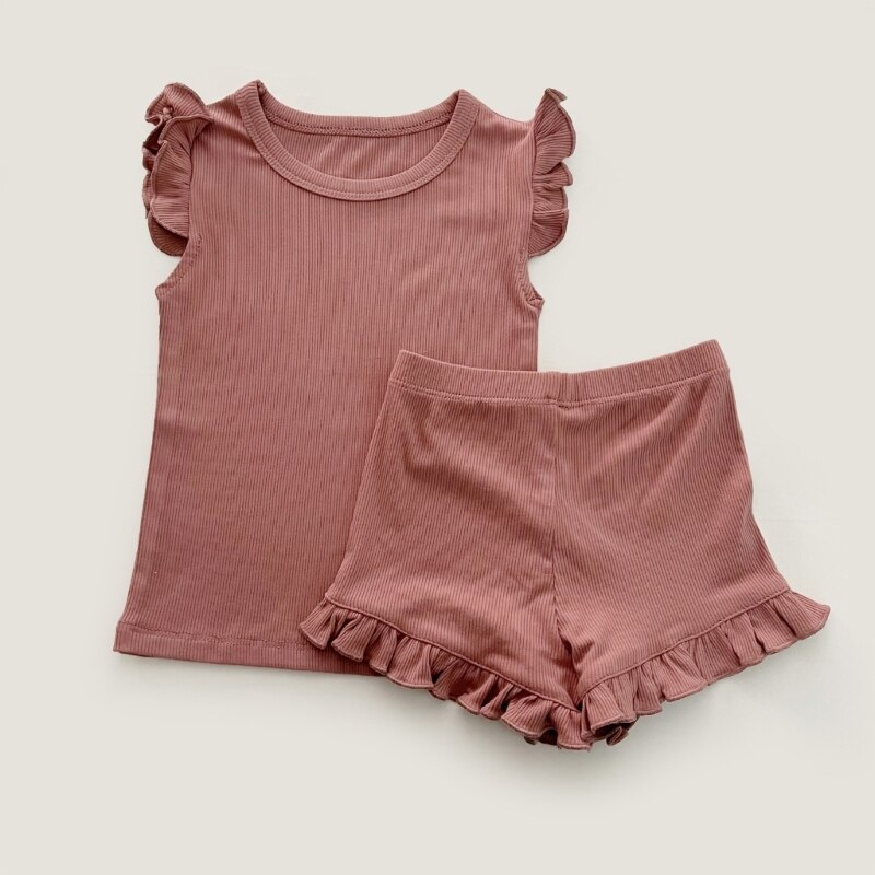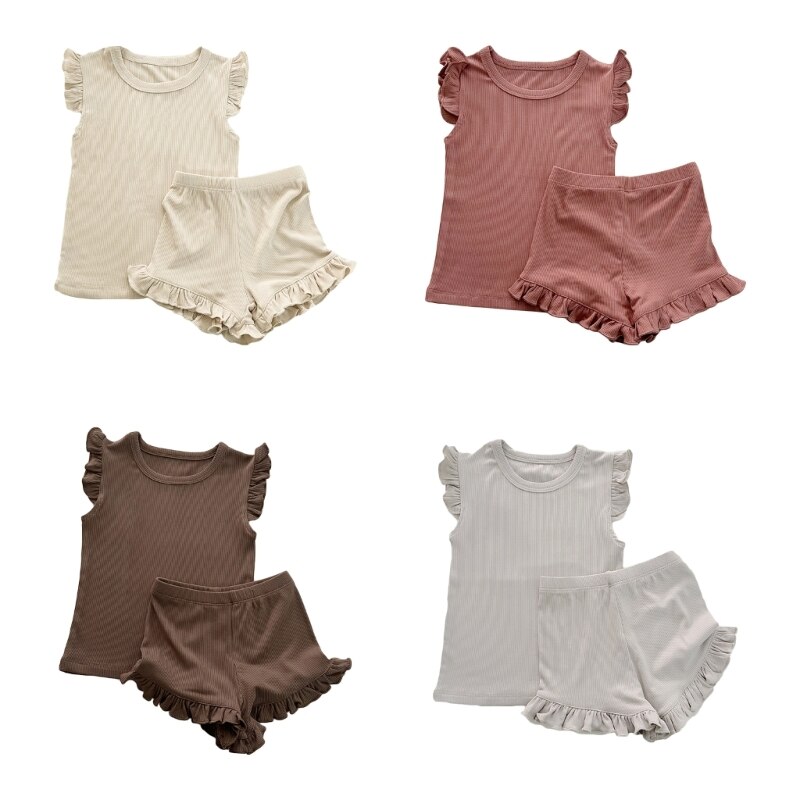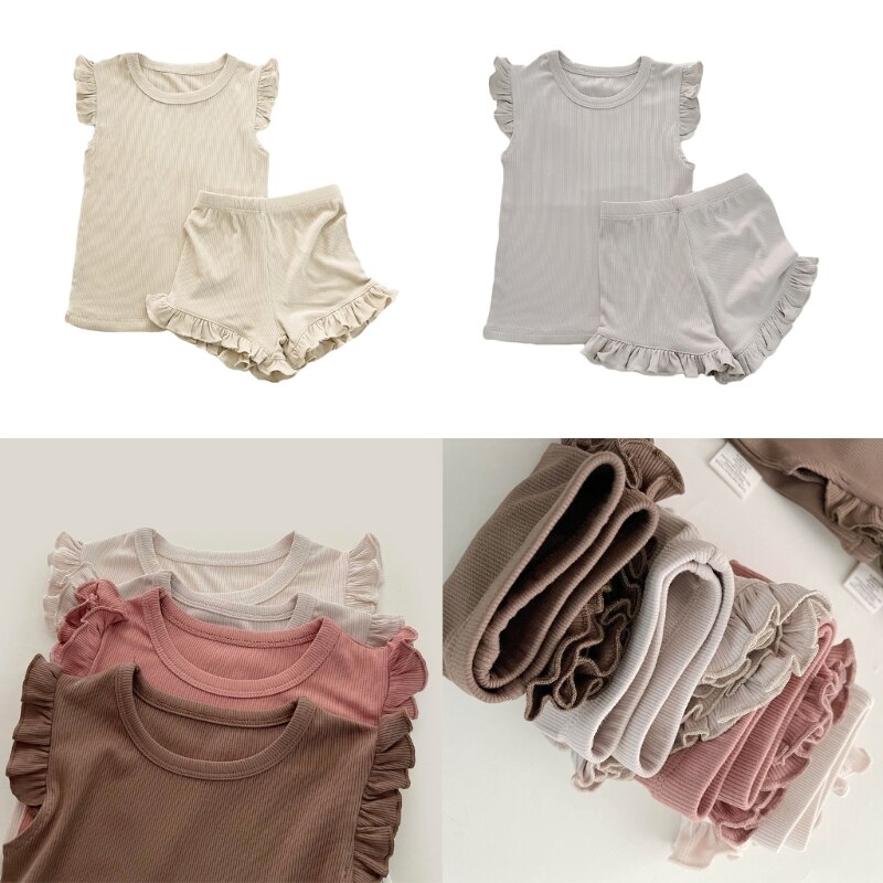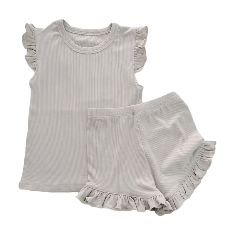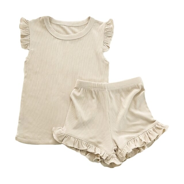 Модный летний детский костюм с короткими рукавами: Детский костюм с простым дизайном и рюшами на рукавах и краю ног, который модный и применимый для повседневной носки, подходит для домашней одежды малыша, популярной для ношения девочки.