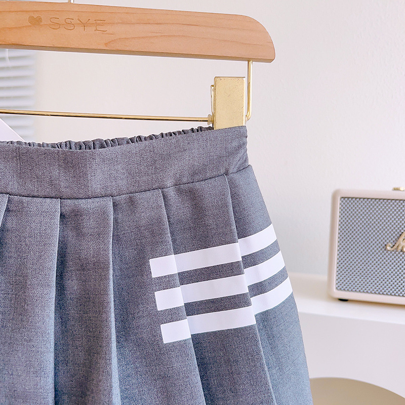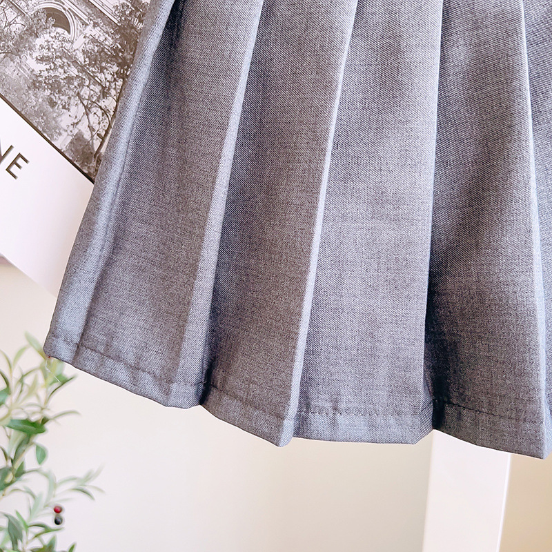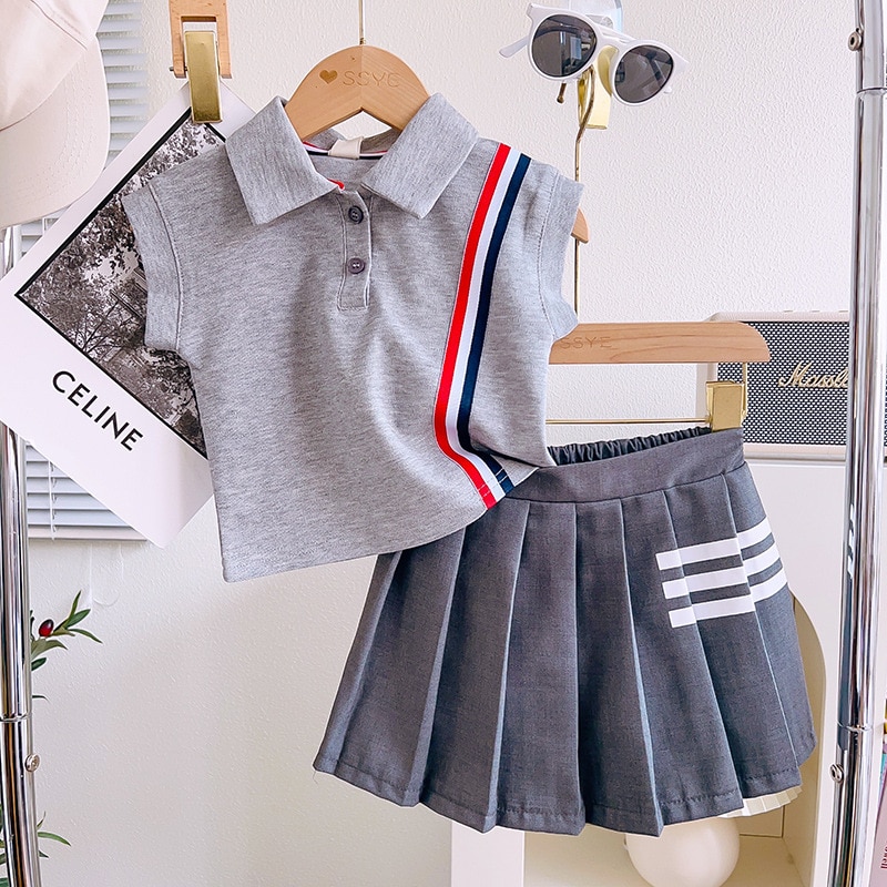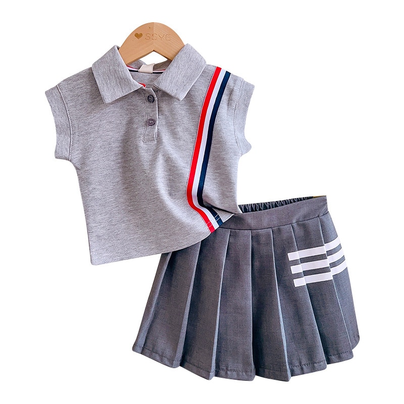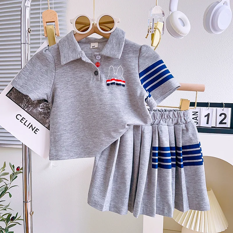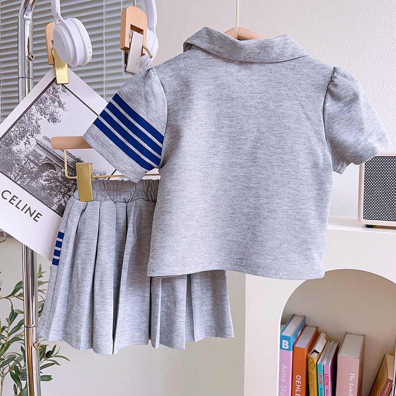 Детский летний костюм для девочек, однотонный костюм из двух предметов в английском студенческом стиле с отложным воротником и коротким рукавом + плиссированная юбка