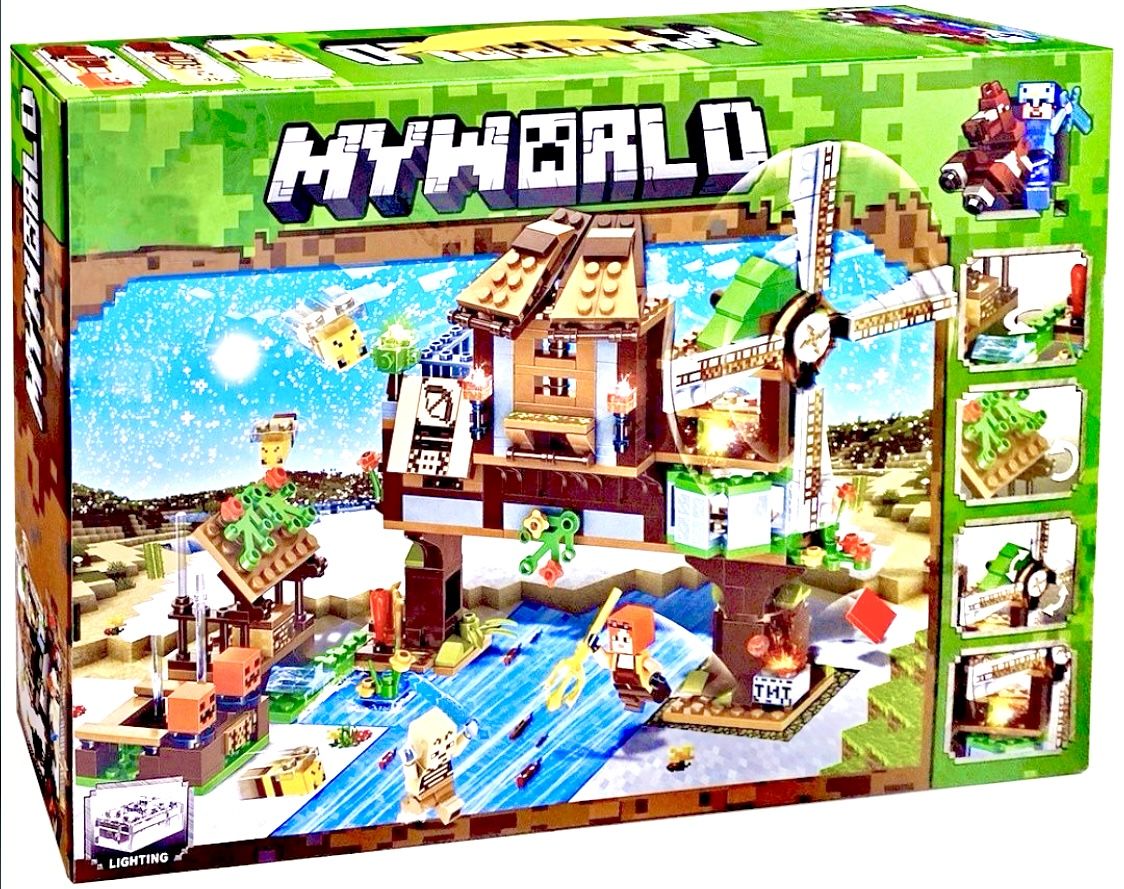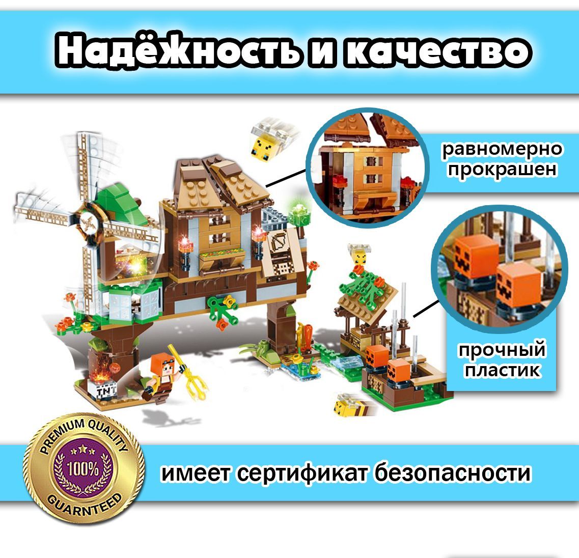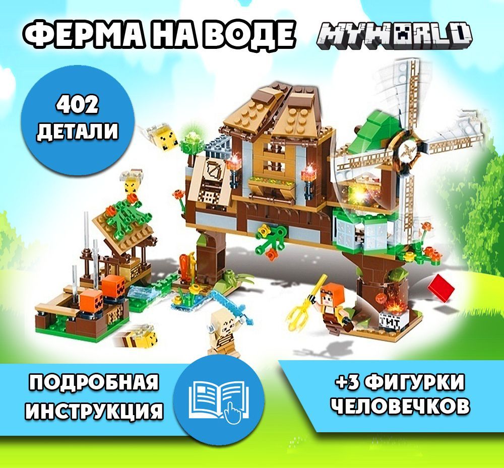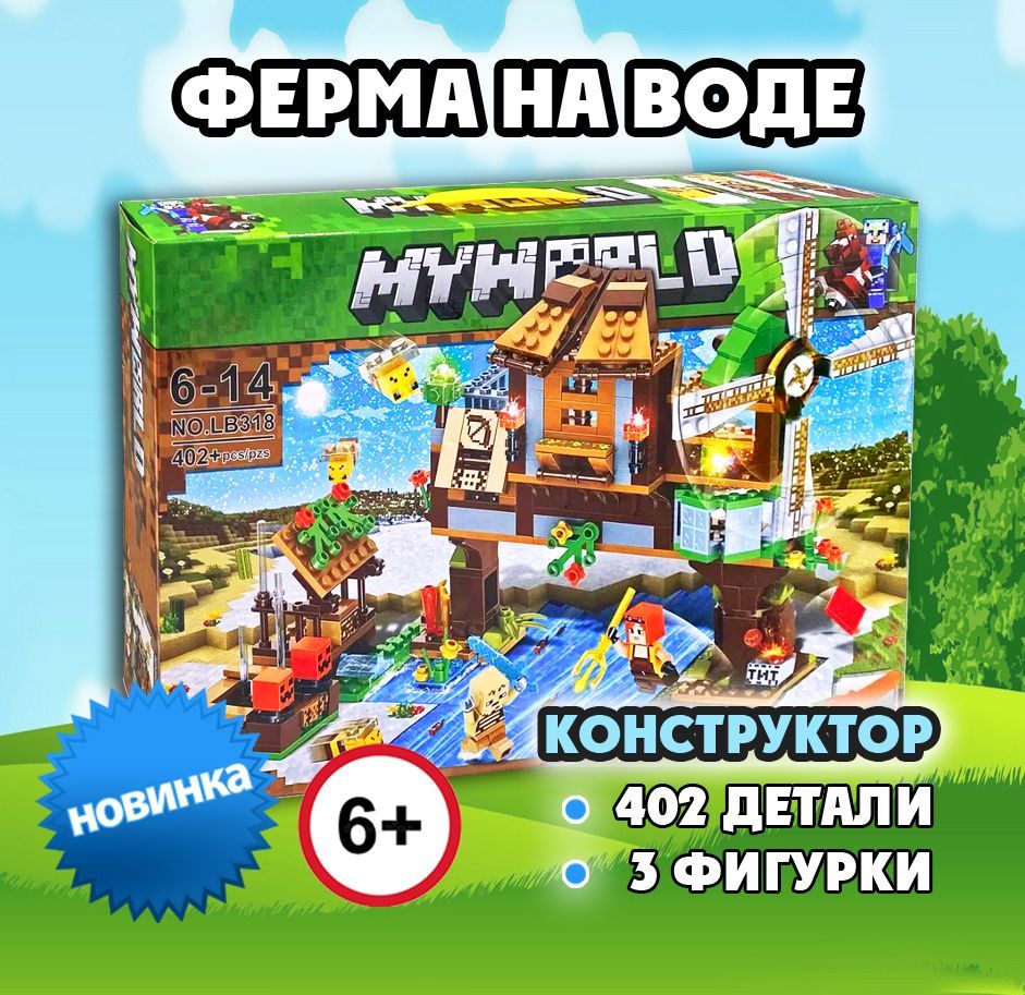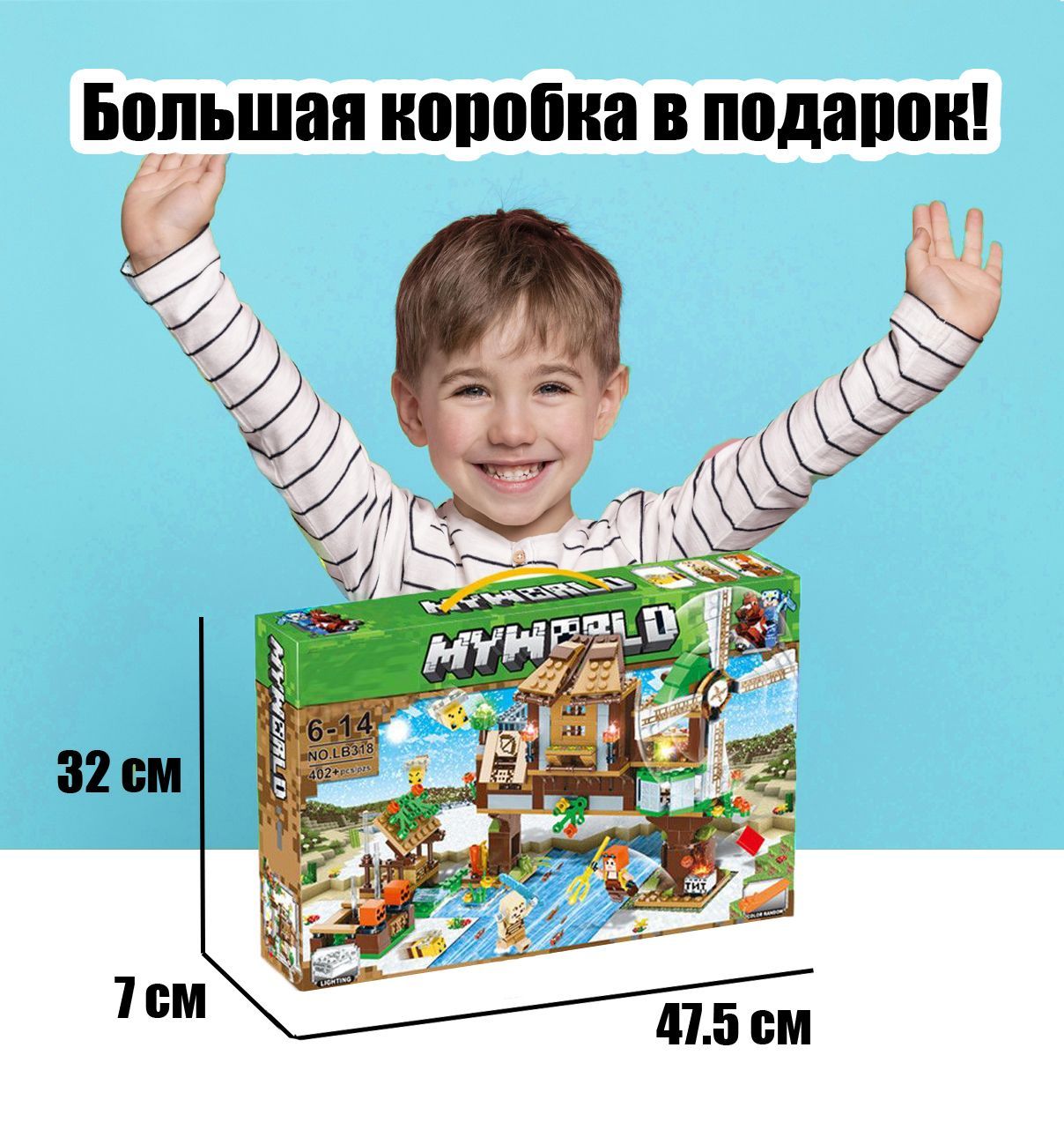 Детский пластиковый конструктор для мальчиков и девочек Майнкрафт. Большой игровой набор Ферма на воде 402 детали. Игрушка с фигурками и LED подсветкой в подарок для детей