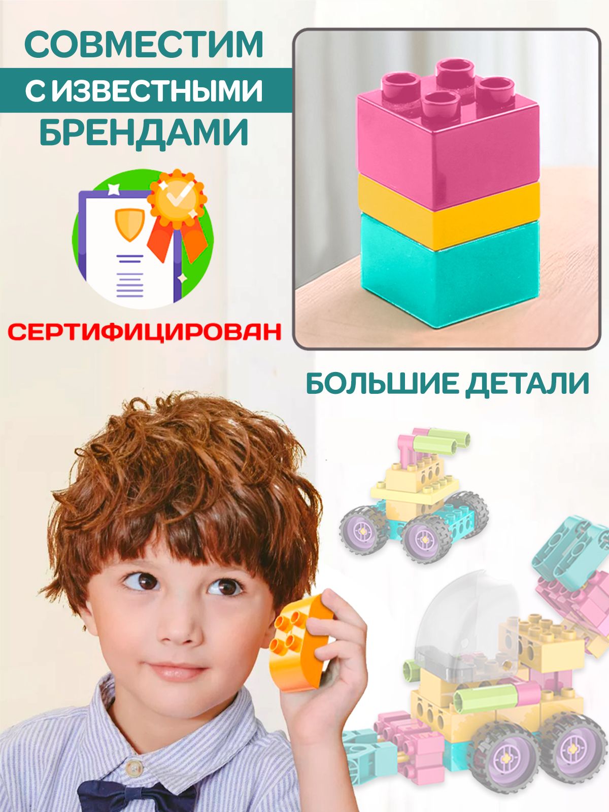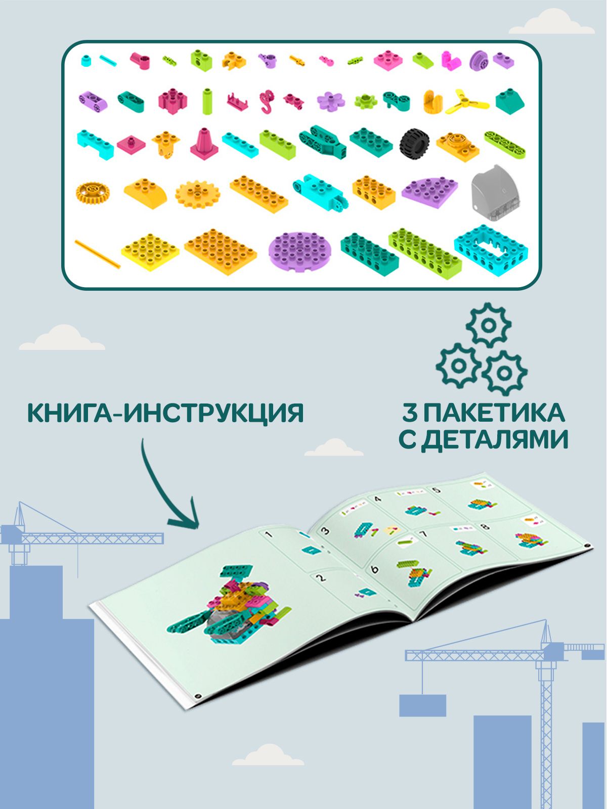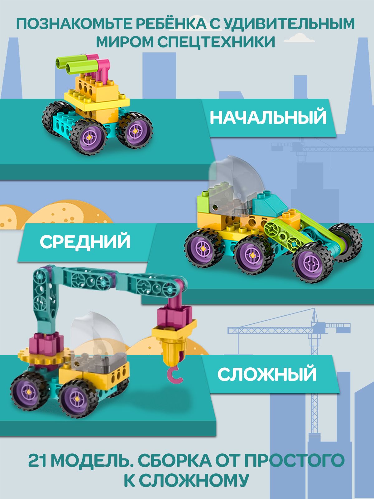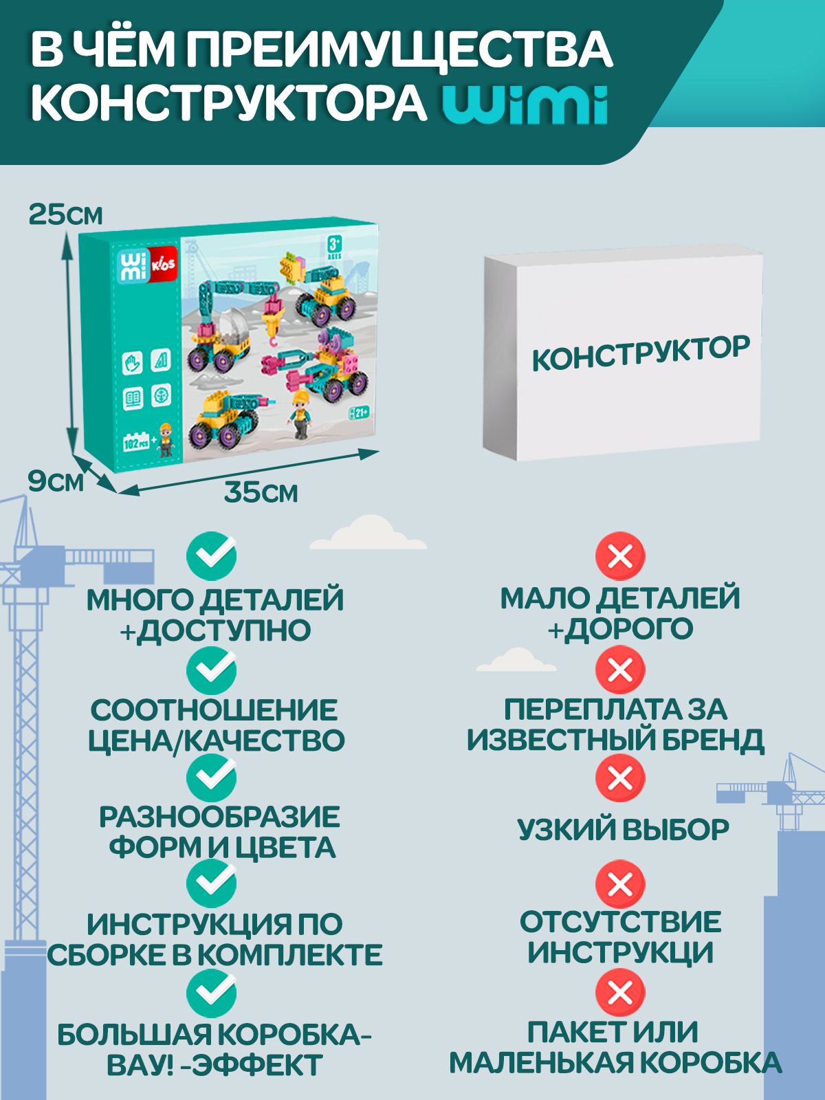 Описание: Детский пластиковый конструктор WiMi, развивающий набор строительной техники из крупных блоков с фигуркой рабочего для мальчиков от 3 лет, 102 деталиДетский пластиковый конструктор – это развивающий набор, который научит ребенка конструировать, моделировать и создавать. Конструктор для малышей – никогда не надоест ребенку, так как из него можно собирать самое разнообразное: дома, спецтехнику, трансформеров и много другое. Блочный конструктор развивает: Мелкую моторику. Модули конструктора небольшие и требуют четких действий - учит концентрироваться и улучшает координацию движений. Пространственное и логическое мышление. Объемная сборная модель помогает совершенствовать пространственное мышление. Воображение и зрительное восприятие. Игры с уже собранными машинками расширяют кругозор и дают возможность придумать новые сюжеты и сценарии для персонажей. Набор состоит из 102 крупных деталей с помощью которых можно создать разнообразные сооружения и транспорт с вращающимися элементами: экскаватор или подъемный кран. Собирая конструктор ребенок научится разбираться в механизмах и начнет понимать, как они работает. Чтобы сделать игру увлекательнее, вы можете купить дополнительные наборы блоков из серии. Они позволят создать целый город, придумывать захватывающие сюжетные истории из роботов и спецтехники со сложными механизмами. Большие детали конструктора без острых углов выполнены из качественного, безопасного для здоровья пластика. Для хранения предусмотрен пластмассовый бокс с крышкой и подробная книга инструкция по сборке в картинках. Развивающие игрушки в виде блочного конструктора станет идеальным подарком для ребенка на день рождения, новый год или любой праздник для мальчиков и девочек. Конструктор робототехника совместим с многофункциональным развивающим детским столиком для конструирования WiMi, который поможет воспитать у ребенка интерес к обучению, творчеству, инженерным и естественным наукам. Соберите всю серию конструкторов WiMi. Переходите в каталог и оформляйте заказ.Вам также понравится!В каталоге нашего бренда WiMi Вы найдете ещё больше интересных товаров!319251910615043752510546128491229147615051259798709274317563083317563708319247468687575106315201758317515436