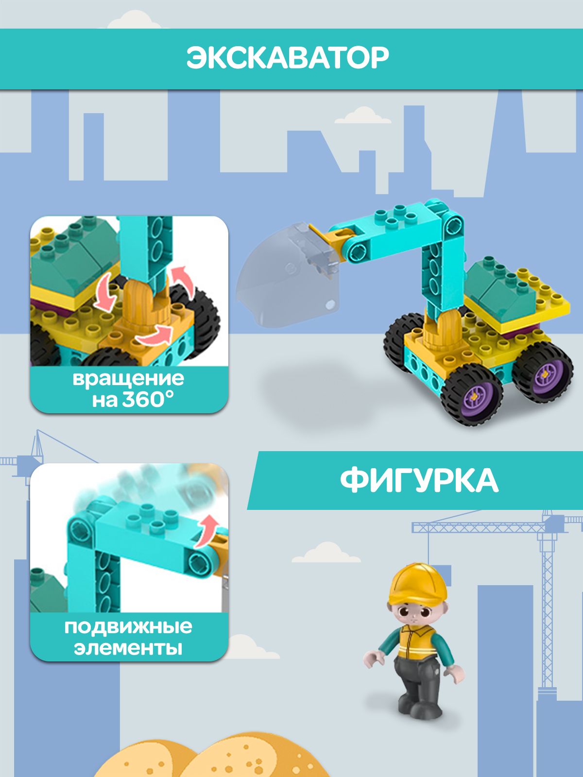 Детский пластиковый конструктор WiMi, развивающий набор строительной техники из крупных блоков с фигуркой рабочего для мальчиков от 3 лет, 102 детали