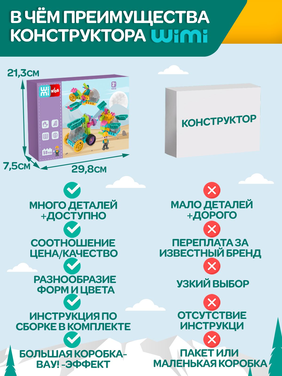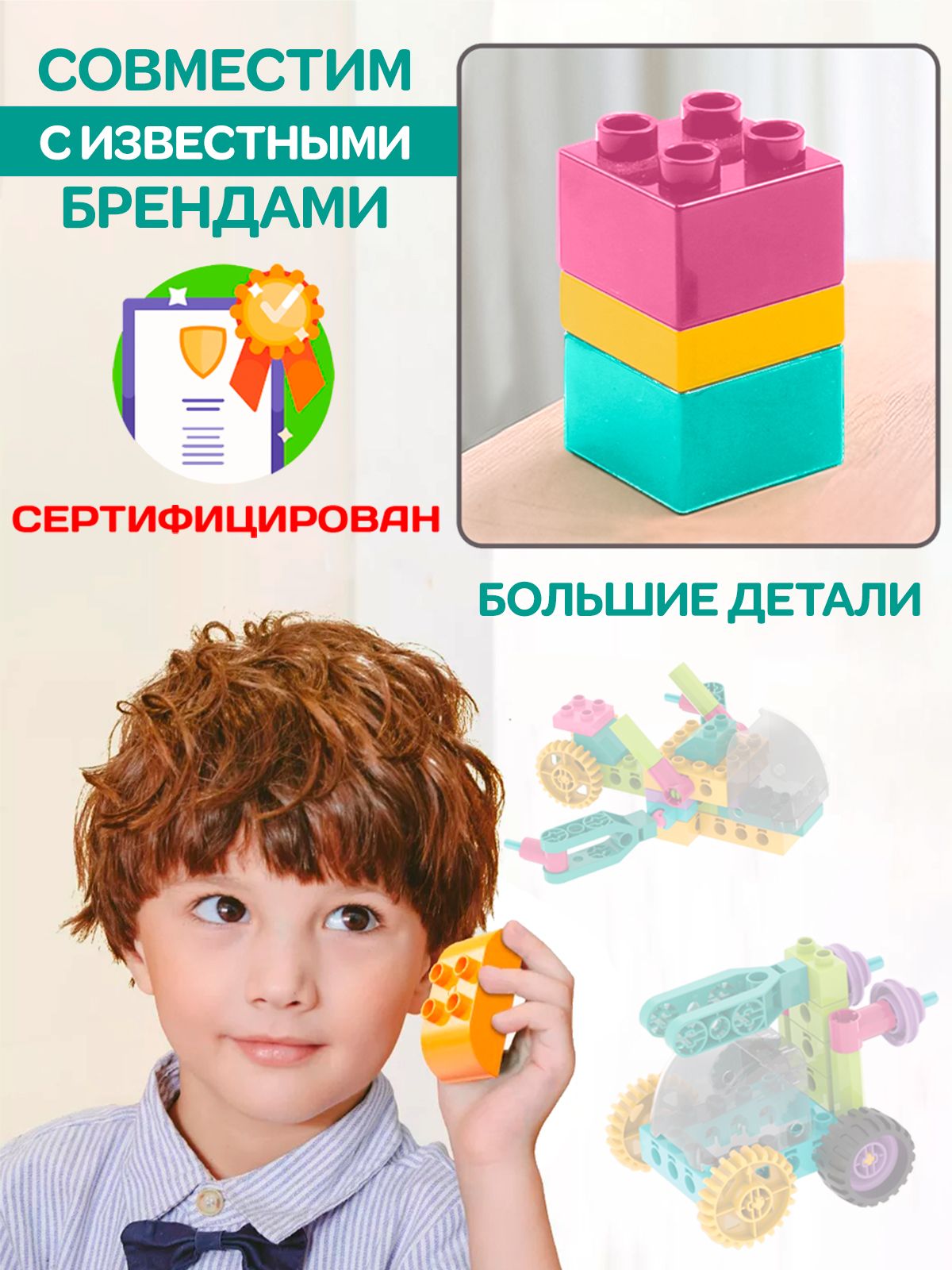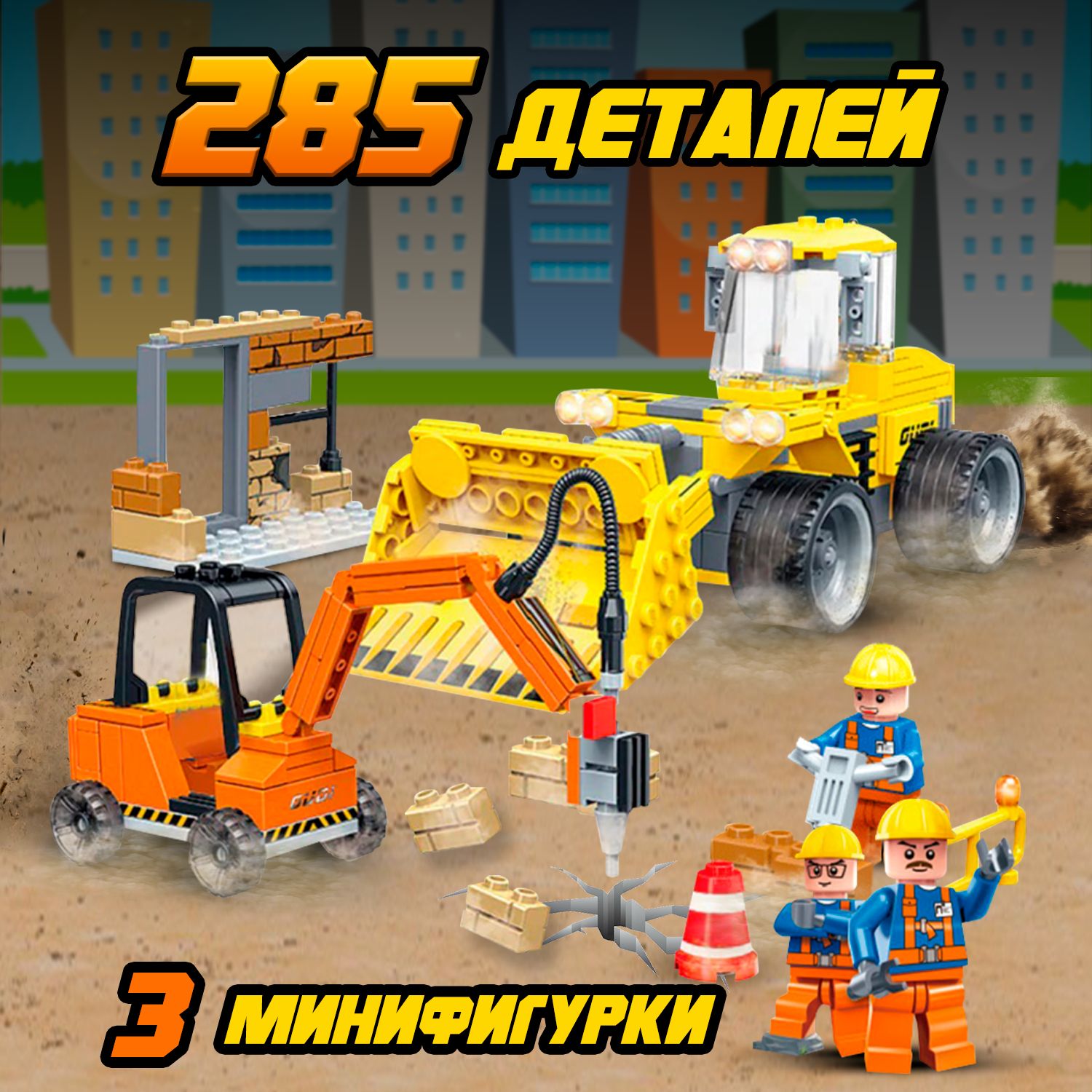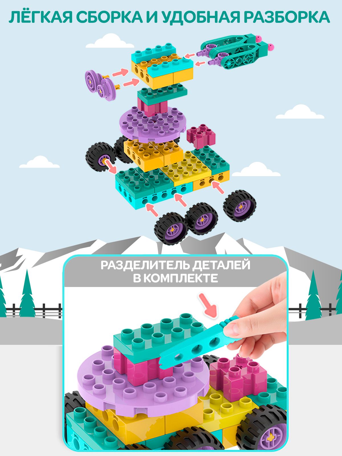 Описание: Детский пластиковый конструктор WiMi, развивающий набор строительной техники из крупных блоков с фигуркой рабочего для мальчиков от 3 лет, 59 деталейДетский пластиковый конструктор – это развивающий набор, который научит ребенка конструировать, моделировать и создавать. Конструктор для малышей – никогда не надоест ребенку, так как из него можно собирать самое разнообразное: дома, спецтехнику, трансформеров и много другое. Блочный конструктор развивает: Мелкую моторику. Модули конструктора небольшие и требуют четких действий - учит концентрироваться и улучшает координацию движений. Пространственное и логическое мышление. Объемная сборная модель помогает совершенствовать пространственное мышление. Воображение и зрительное восприятие. Игры с уже собранными машинками расширяют кругозор и дают возможность придумать новые сюжеты и сценарии для персонажей. Набор состоит из 59 крупных деталей с помощью которых можно создать разнообразные сооружения и транспорт с вращающимися элементами: вертолет или автомобиль с открывающейся кабиной. Собирая конструктор ребенок научится разбираться в механизмах и начнет понимать, как они работает. Чтобы сделать игру увлекательнее, вы можете купить дополнительные наборы блоков из серии. Они позволят создать целый город, придумывать захватывающие сюжетные истории из роботов и спецтехники со сложными механизмами. Большие детали конструктора без острых углов выполнены из качественного, безопасного для здоровья пластика. Для хранения предусмотрен пластмассовый бокс с крышкой и подробная книга инструкция по сборке в картинках. Развивающие игрушки в виде блочного конструктора станет идеальным подарком для ребенка на день рождения, новый год или любой праздник для мальчиков и девочек. Конструктор робототехника совместим с многофункциональным развивающим детским столиком для конструирования WiMi, который поможет воспитать у ребенка интерес к обучению, творчеству, инженерным и естественным наукам. Соберите всю серию конструкторов WiMi. Переходите в каталог и оформляйте заказ.Вам также понравится!В каталоге нашего бренда WiMi Вы найдете ещё больше интересных товаров!510358776563524118313516041523879541341244361732067067510358691799281606318640881615043752324220899564542373
