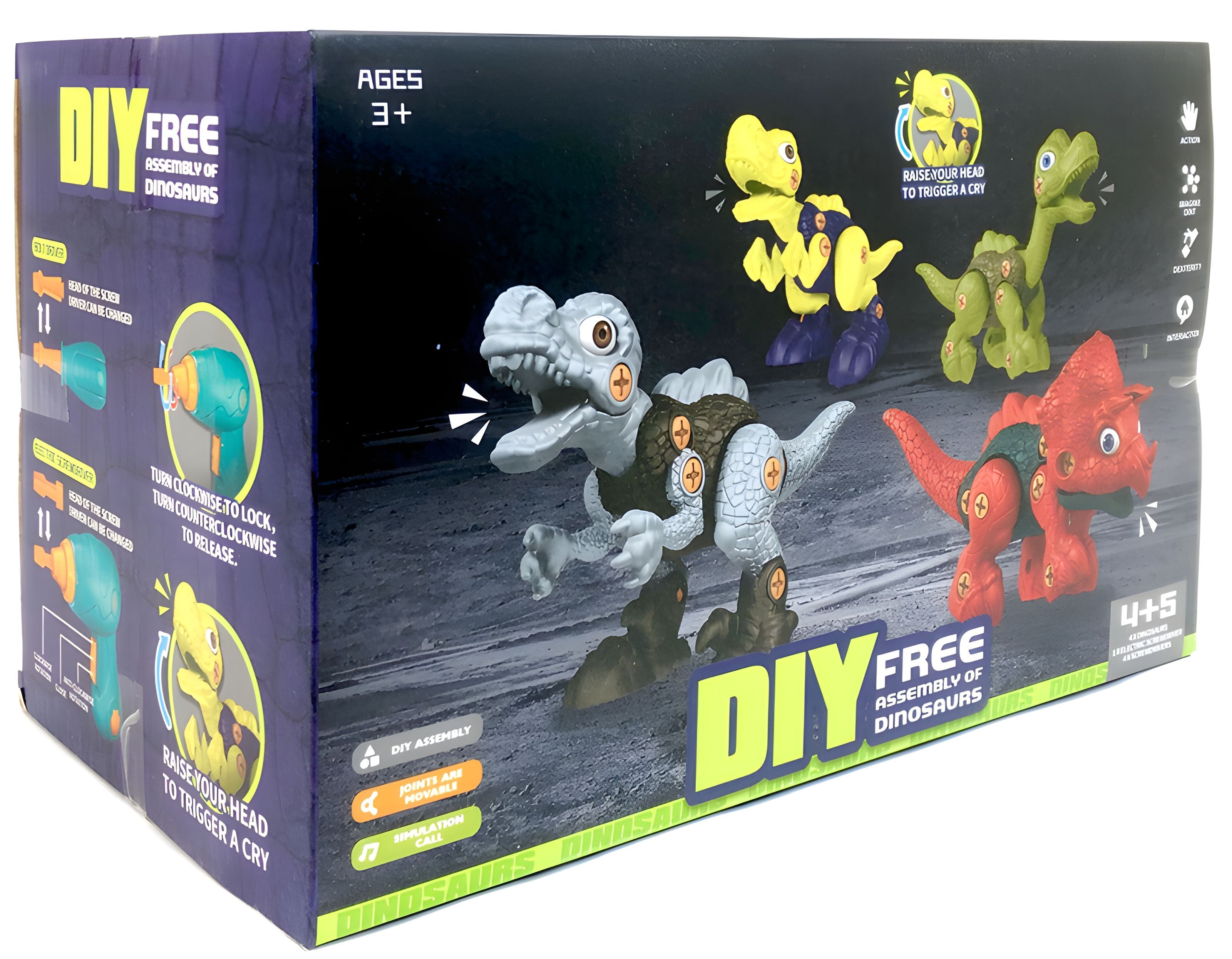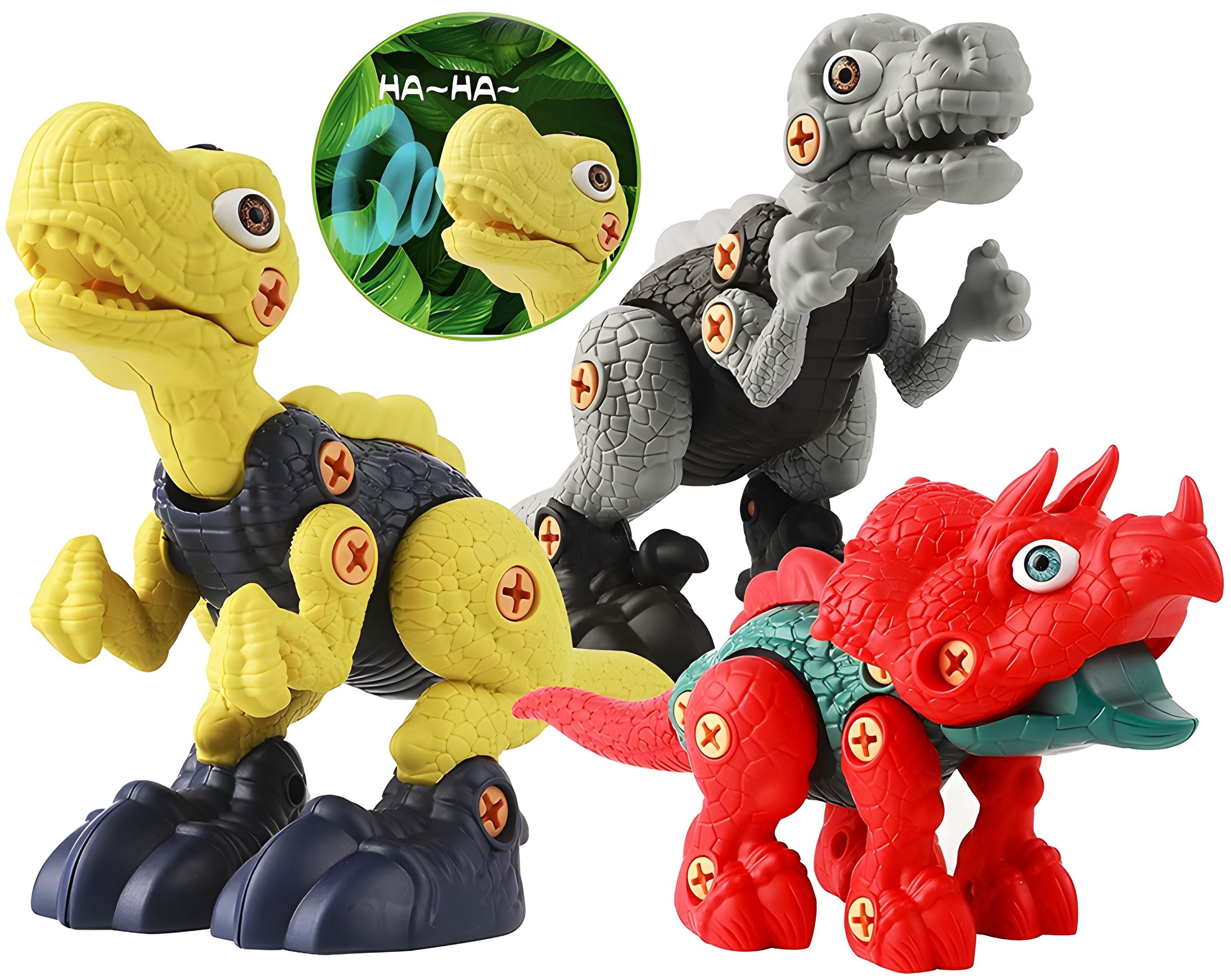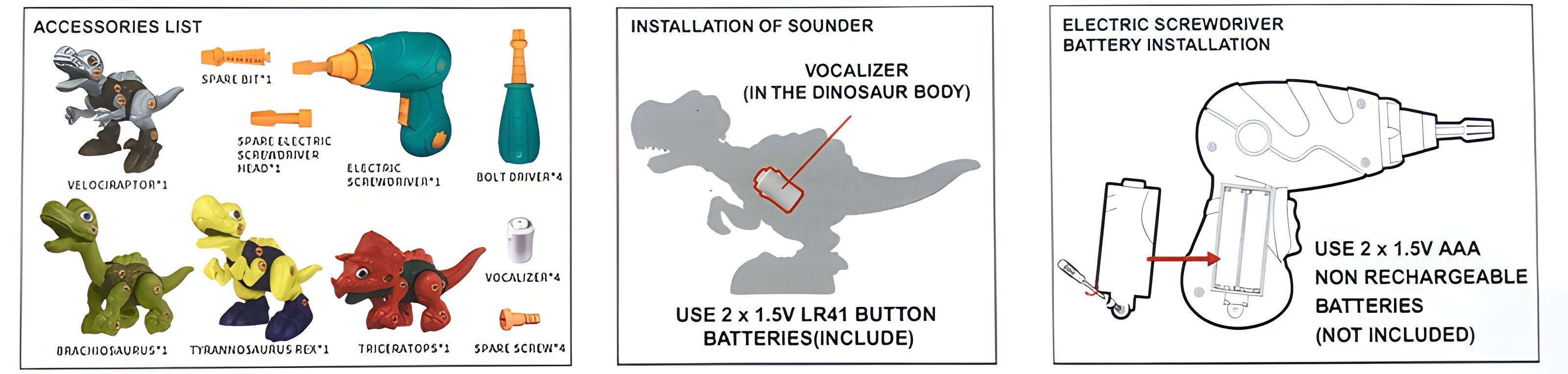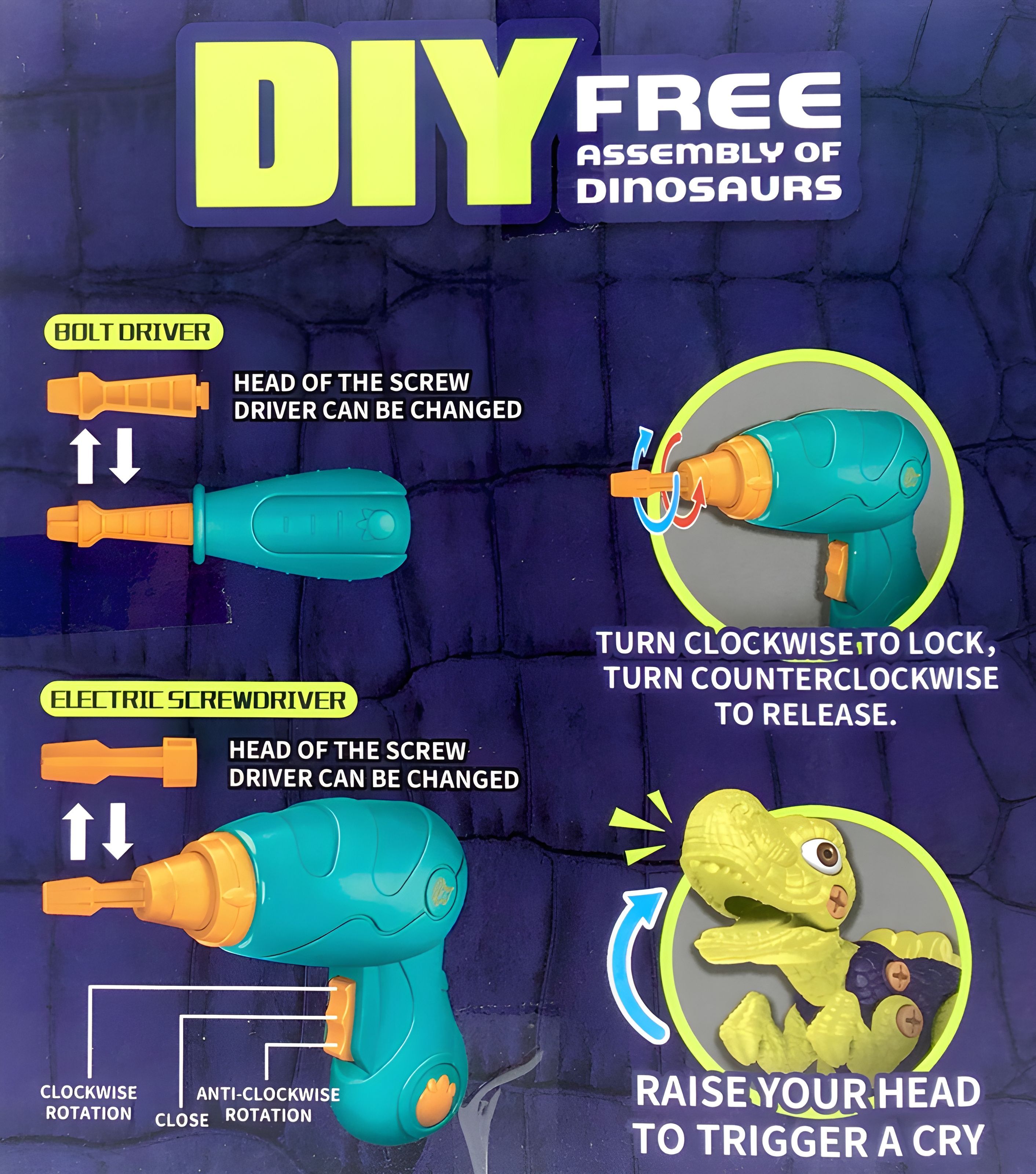 Динозавры собираются и разбираются при помощи шуруповёрта и отвёртки.