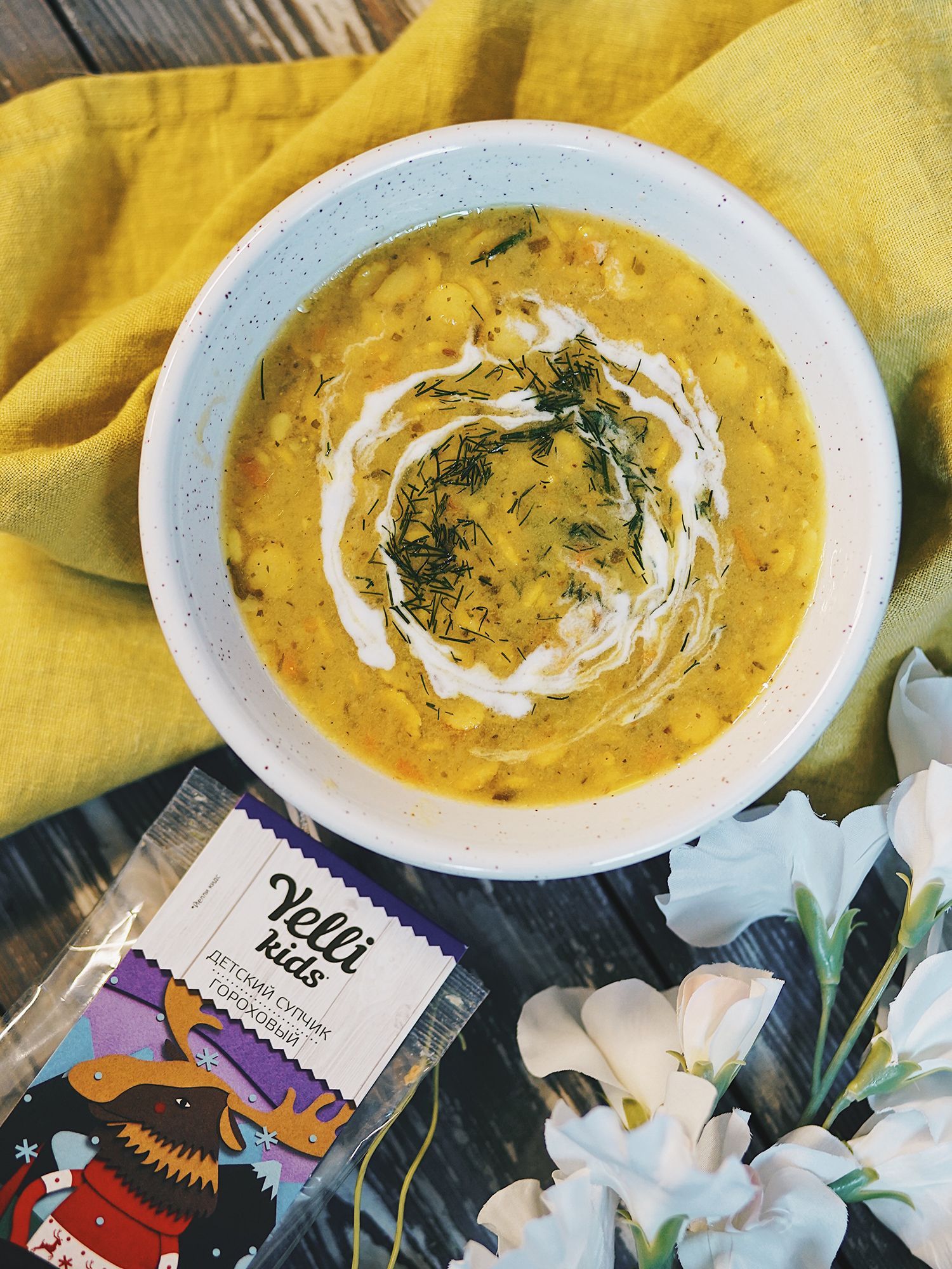 Гороховый супчик Yelli kids идеально дополнит и разнообразит детское меню. Он не только вкусный, но и полезный, непременно понравится каждому ребенку. Одна пачка рассчитана на 4 порции супа. На его приготовление потребуется всего 15 минут: в 1 литр кипящей подсоленной воды или бульона всыпать содержимое пакета и варить под крышкой на медленном огне в течение 15 минут. Первое обеденное блюдо готово! Подавать его рекомендуется со свежей зеленью. Его можно сделать еще более ароматным, если сварить с копчеными ребрышками и пряностями. При желании придать консистенцию супа-пюре можно с помощью блендера. Продукт является 100% натуральным, не содержит консервантов, ароматизаторов, глутамата натрия, ГМО. В его составе только полезные компоненты: гороховые хлопья, овощная смесь (сушеная морковь, чеснок, зеленый и репчатый лук). Ни колотый горошек, ни гороховая крупа не приготовятся в домашних условиях так быстро, как эти хлопья. Бобовая суповая смесь обладает насыщенным, концентрированным вкусом, но не содержит при этом острых приправ, за счет чего идеально подходит для детей. Блюдо идеально впишется в диетический рацион и соответствует нормам правильного питания (ПП).