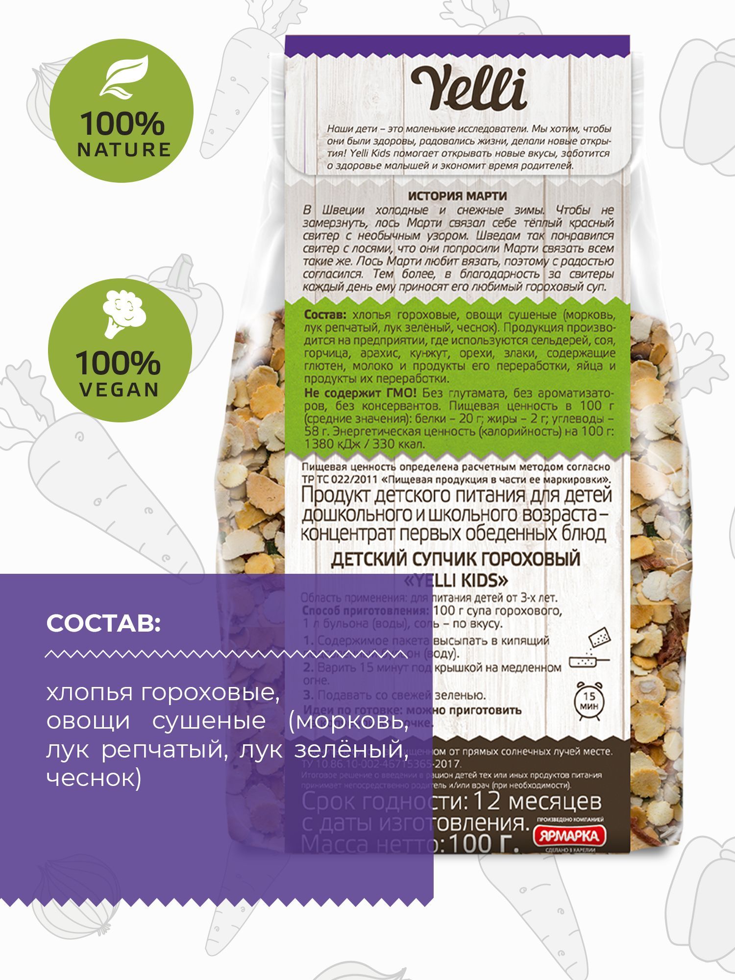 хлопья гороховые, овощи сушеные (морковь, лук репчатый, лук зеленый, чеснок). Продукция производится на предприятии, где используются сельдерей, соя, горчица, арахис, кунжут, орехи, злаки, содержащие глютен, молоко и продукты его переработки, яйца и продукты их переработки.