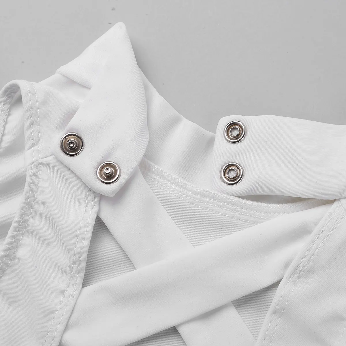 Без рукавов, с ложной горловиной и застежкой на пуговицы, с несколькими ремешками крест-накрест сзади.