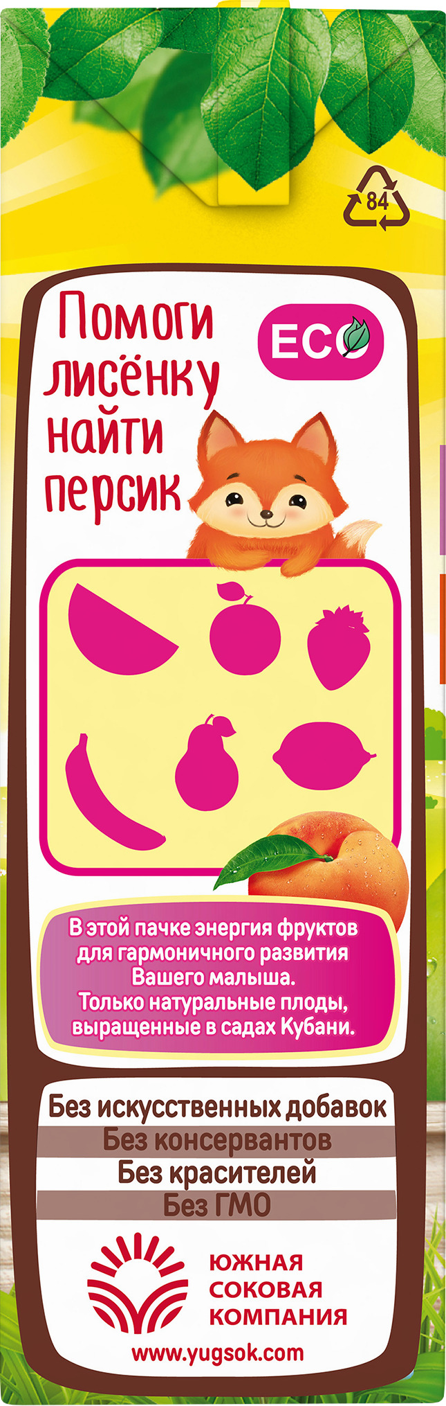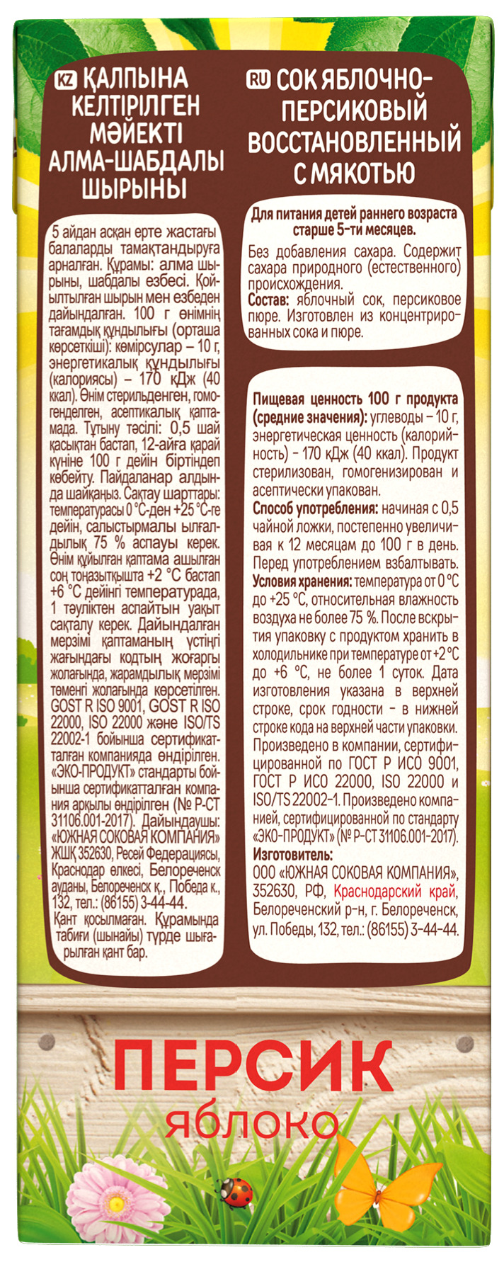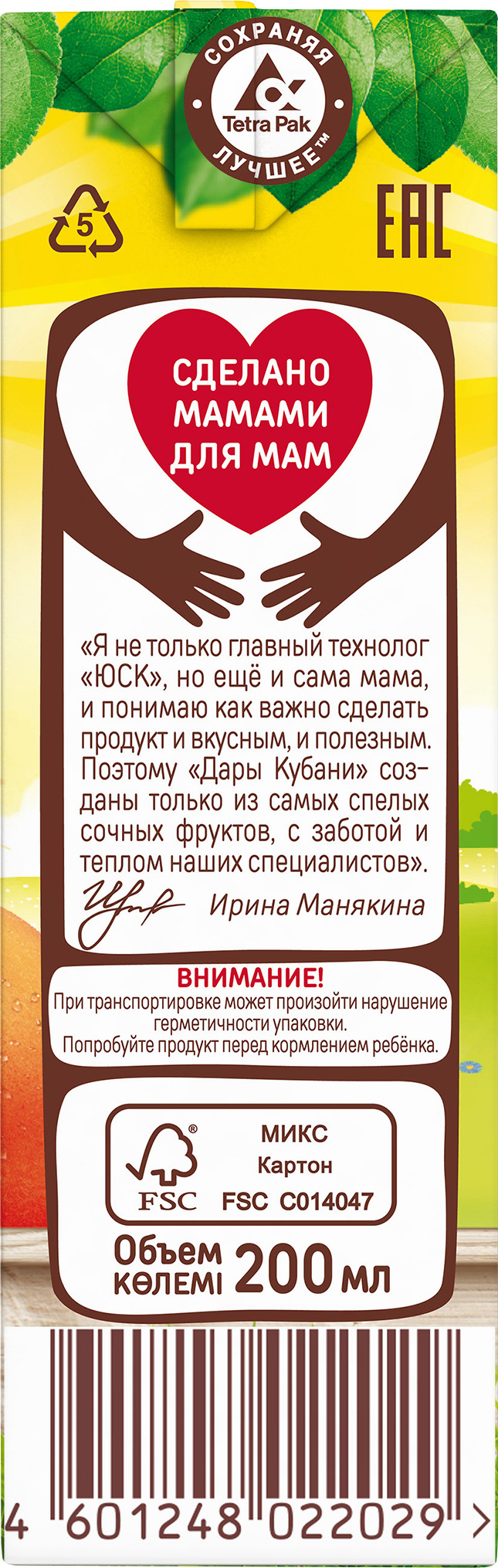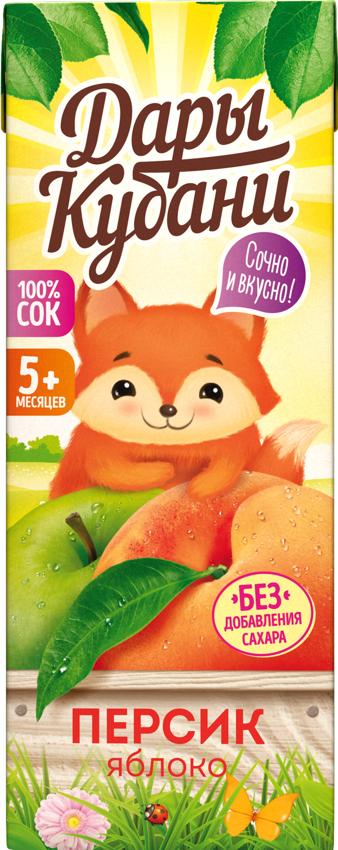 Описание: Детский сок из яблок и персиков Дары Кубани - натуральный продукт для детского питания Вашего малыша старше 5 месяцев. Без сахара, без консервантов, без ГМО, без красителей и искусственных добавок. В составе только 100% яблочный сок и фруктовое пюре из персика. Натуральные плоды выращены во фруктовых садах Кубани. Безопасность детей прежде всего, поэтому наши специалисты тщательно отбирают фрукты для производства соков малышам и строго контролируют процесс на всех этапах. Детский сок яблочно-персиковый имеет высокий стандарт качества и сертифицирован по системе эко-продукт. В соке содержатся полезные витамины и минеральные вещества, которые положительно влияют на развитие ребенка. Детское питание Дары Кубани непременно оценит малыш, мама, папа или няня. Упаковка Тетра Пак 0,2 л надежно сохранит пользу и вкус детского сока. Натуральный сок детский яблоко персик 200 мл без сахара можно купить для дома, детского сада, прогулок, школы или путешествия. Соки Дары Кубани для детей раннего возраста - сделано мамами для мам.