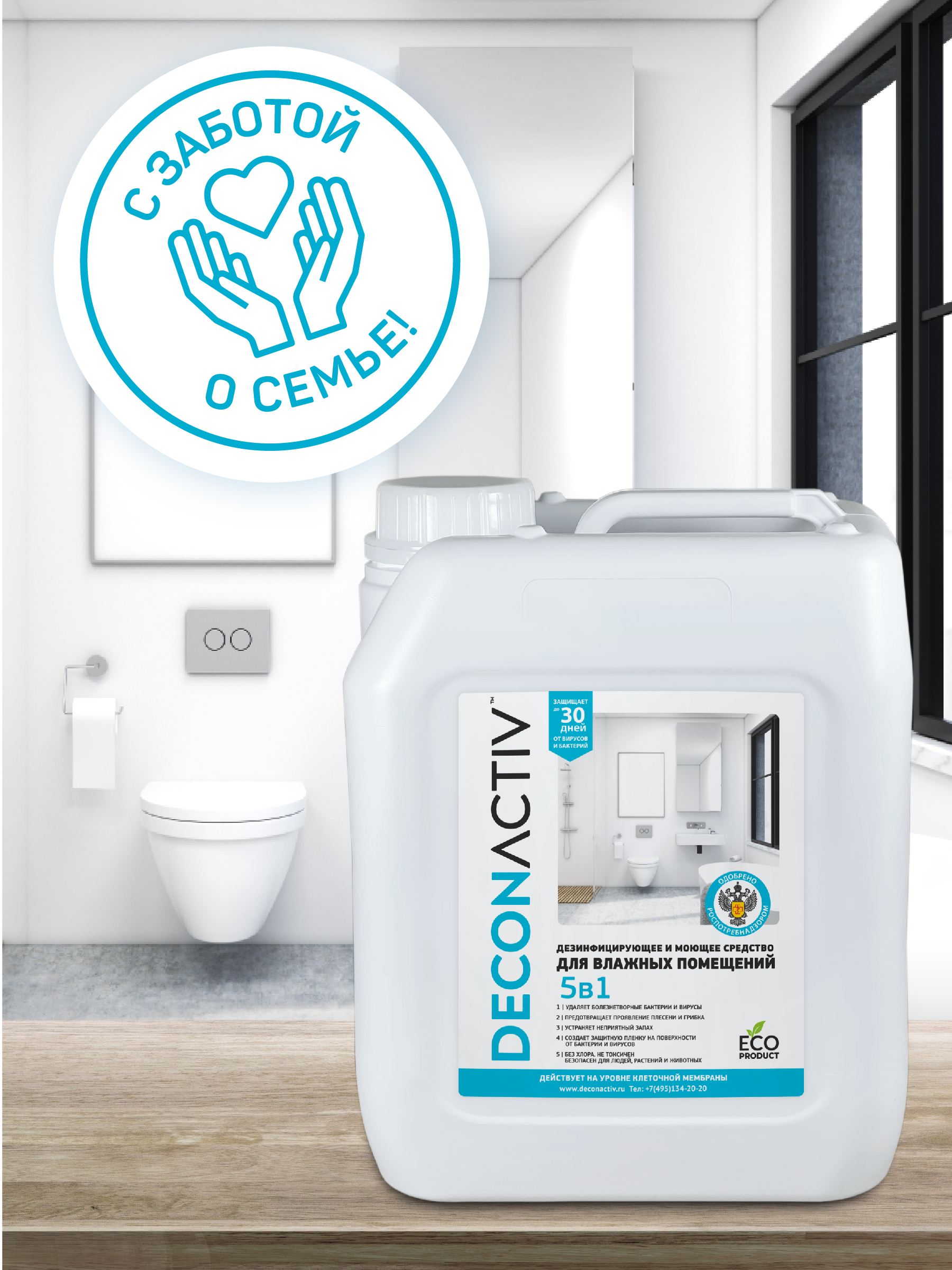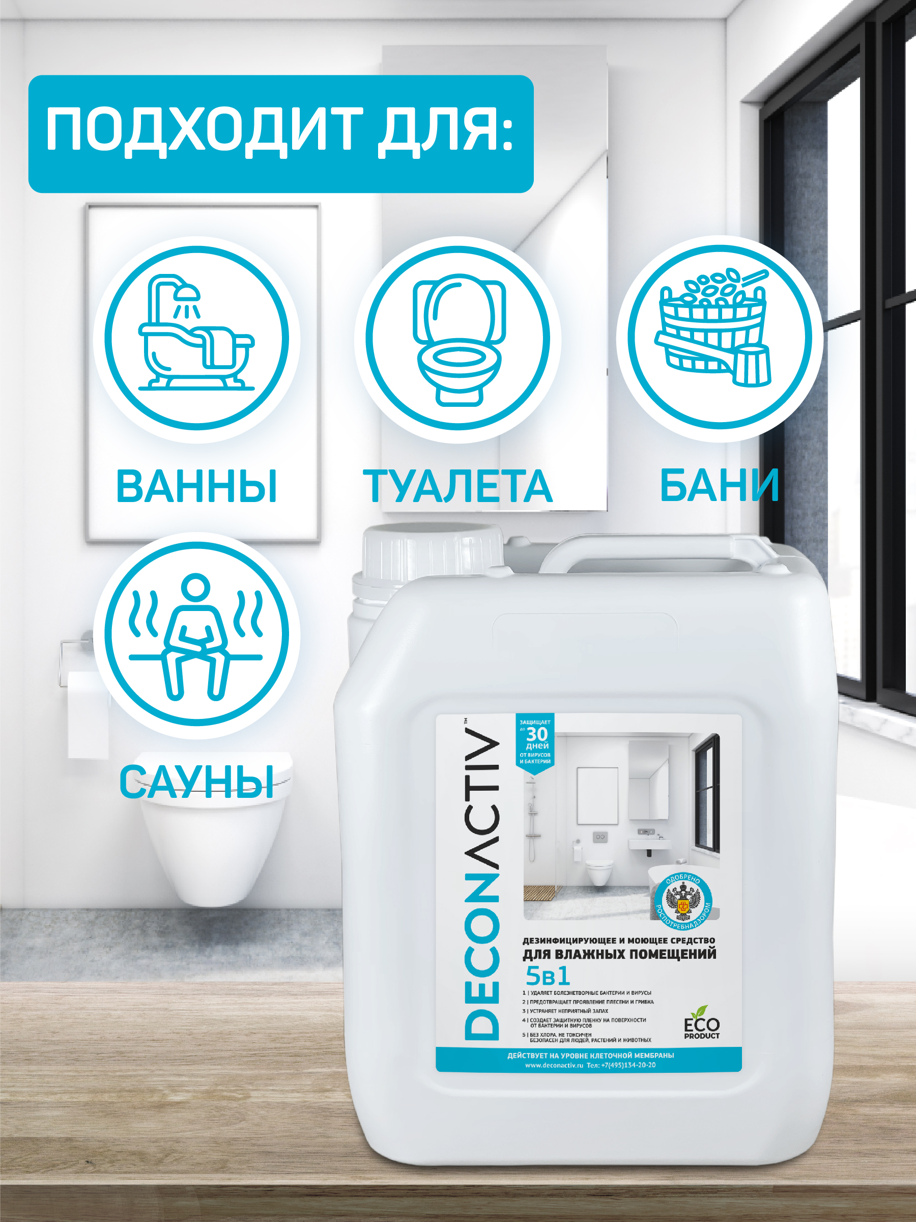 Описание: Текст при отключенной в браузере загрузке изображенийСредство для дезинфекции влажных помещений DECONACTIVСредство для дезинфекции и очистки помещений с повышенной влажностью: ванные комнаты, туалеты, сауны, бани, общественные душевые, бассейны и прочее. Эффективно устраняет неприятные запахи и обеззараживает поверхность, создаёт длительную защиту от бактерий и вирусов. Назначение: Обладает высокой биологической активностью против вегетативных бактерий, вирусов, патогенных грибов, плесени, обеспечивает быструю гибель до 99,9 % распространённых организмов. Устойчив к окружающей среде и имеет антимикробную активность увеличенного действия. Подтверждено испытаниями ФБУН ГНЦ ПМБ рег.номер RA.RU.21EБ03