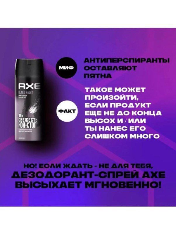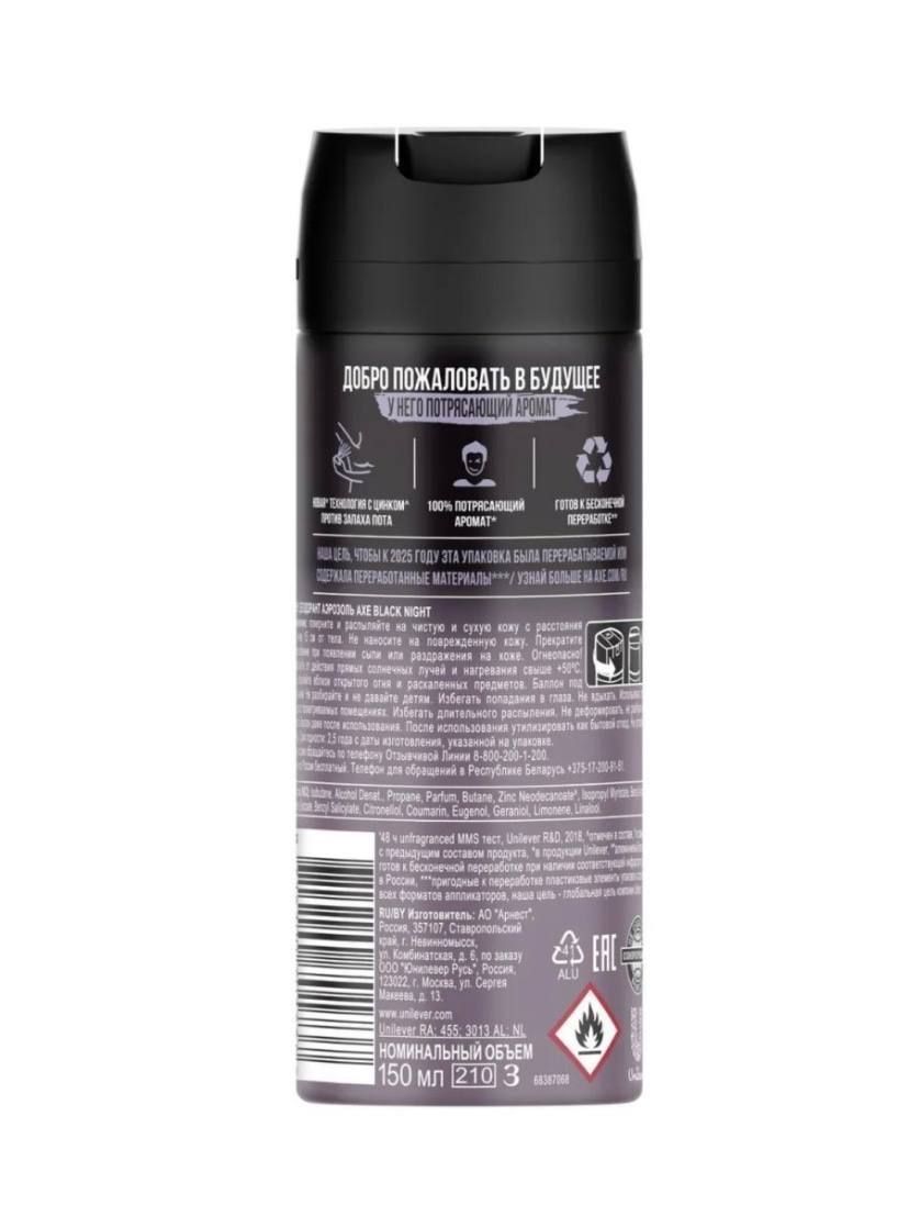 Описание: Пссс, бро… Взгляни, что у нас есть: идеально свежий и безукоризненно стильный аромат для мужчин AXE Black Night. Нам не важно, кто ты: тусовщик или денди, гуманитарий или технарь, за альянс или за орду. AXE обеспечит тебе уверенность в своем образе — и в своих силах!Дезодорант спрей AXE Black Night создан в сотрудничестве с лучшими мировыми парфюмерными командами. Впрочем, его суперспособность — это не только топовый аромат с настоящим мужским характером, но и целых 48 часов защиты против запаха пота для тебя . За счет цинка в составе AXE защитит твою кожу от бактерий, вызывающих неприятный запах при потоотделении. Формат аэрозоля идеален для мягкой ежедневной защиты. Наноси его на чистую, сухую кожу. Это будет классное начало дня! Ну, или ночи…Если ты всегда на движе, аромат мяты и благородного кедра освежит не только твой образ, но и твои мысли!