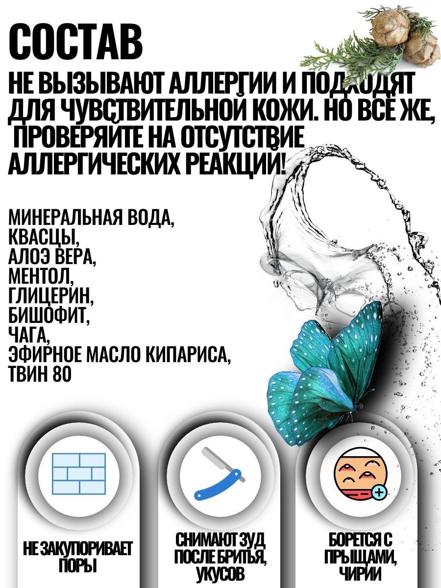 минеральная вода, квасцы, алоэ вера, ментол, глицерин, бишофит, чага, эфирное масло кипариса, твин 80.