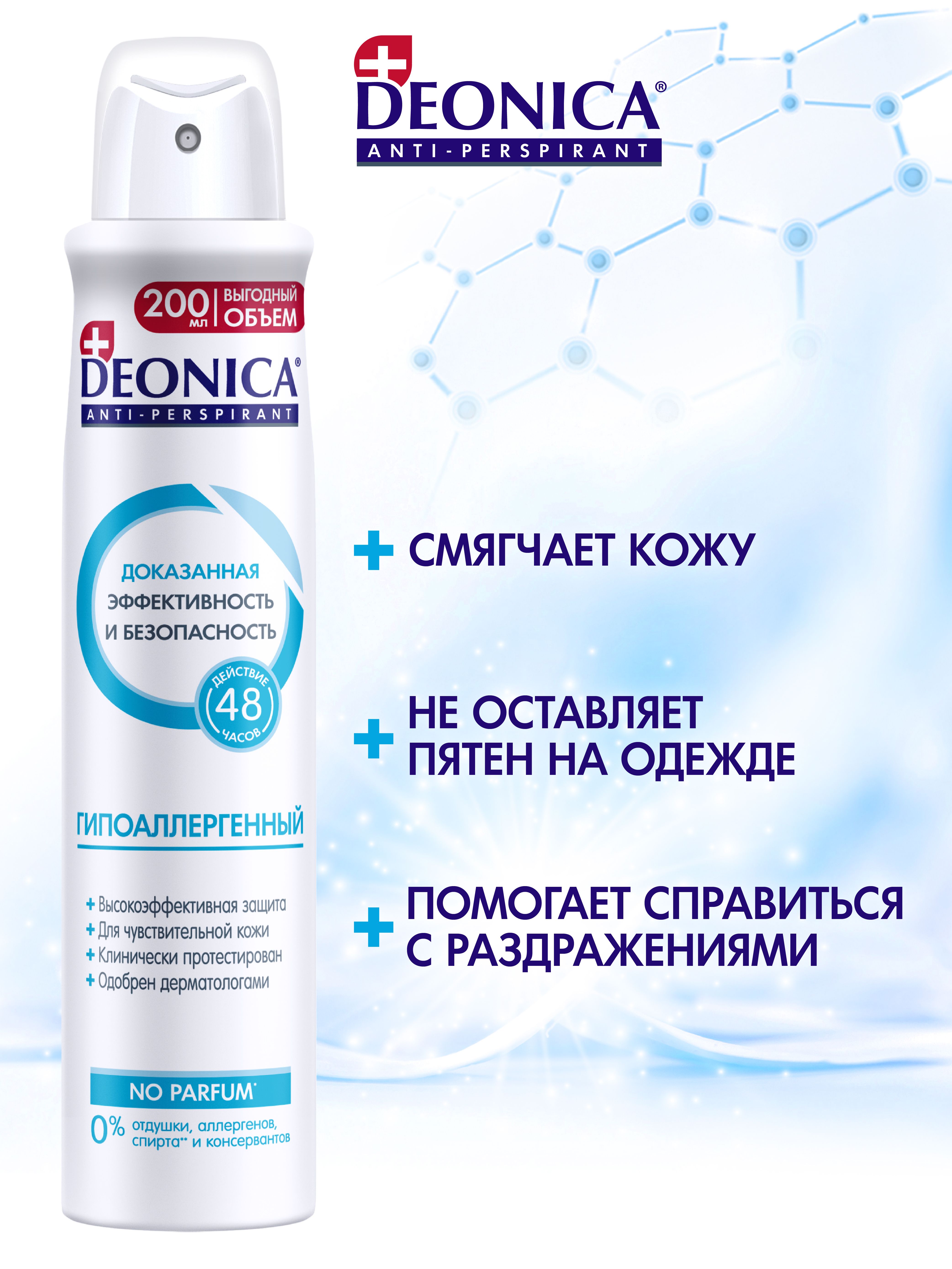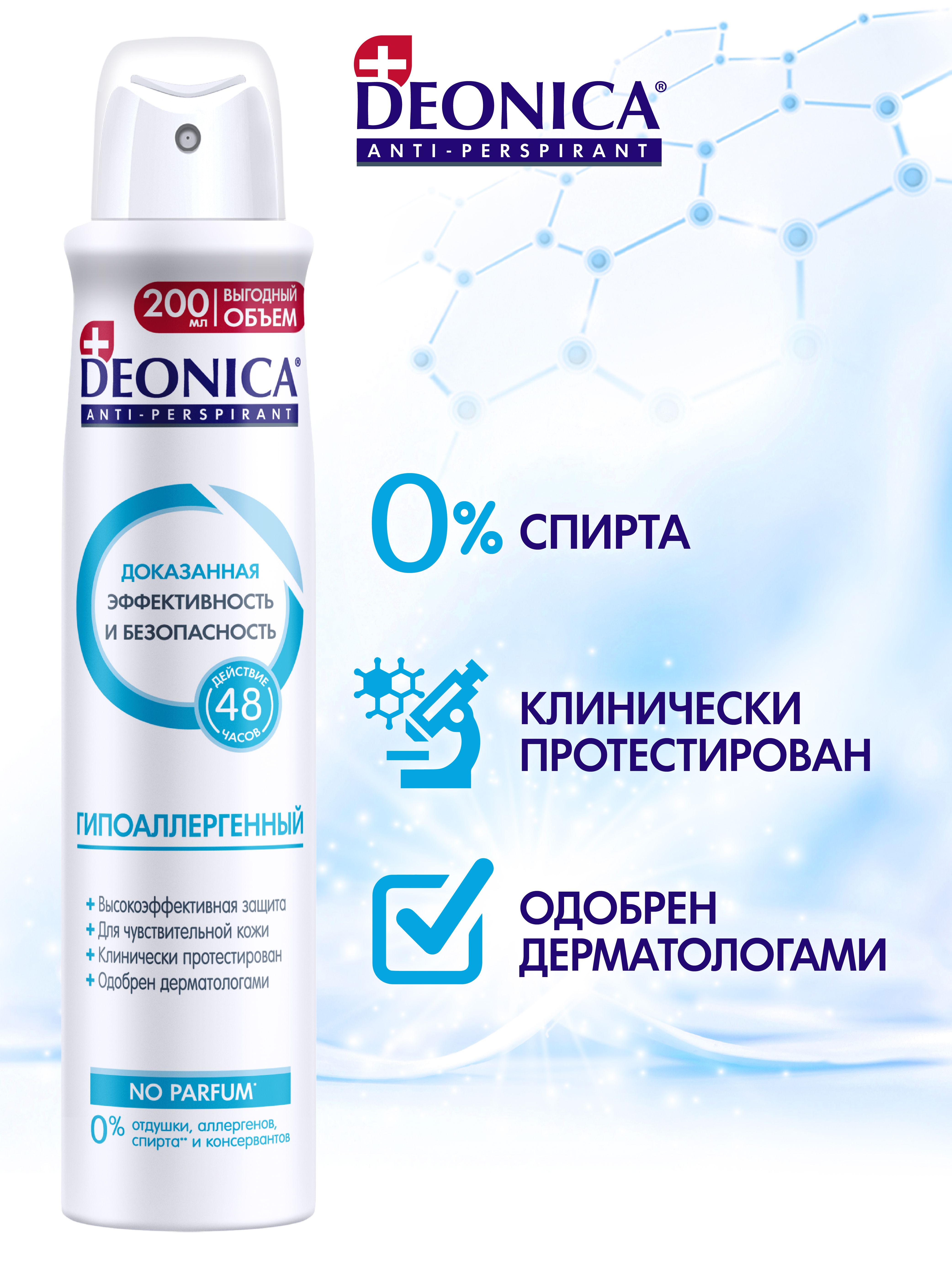 Дезодорант без запаха для женщин и мужчин Деоника Антиперспирант Гипоаллергенный, для чувствительной кожи, спрей - 200 мл