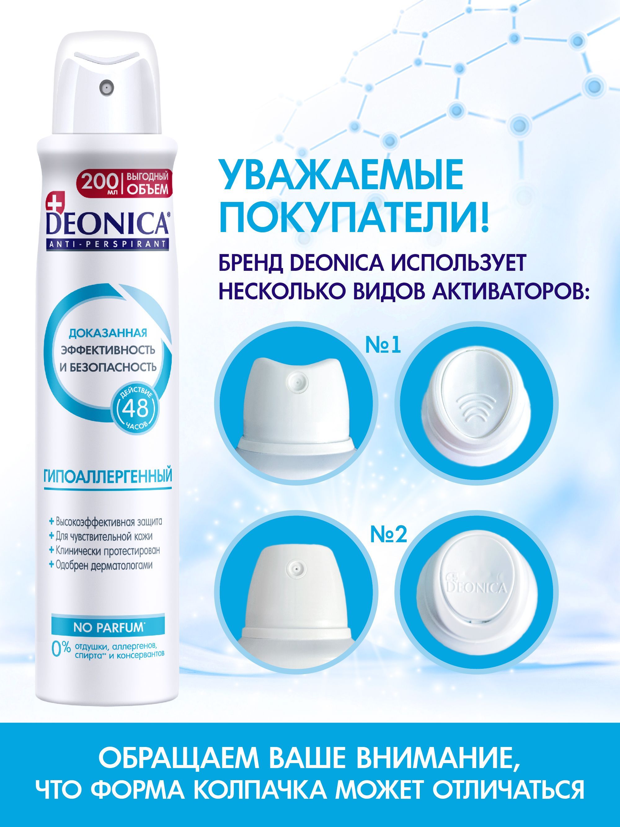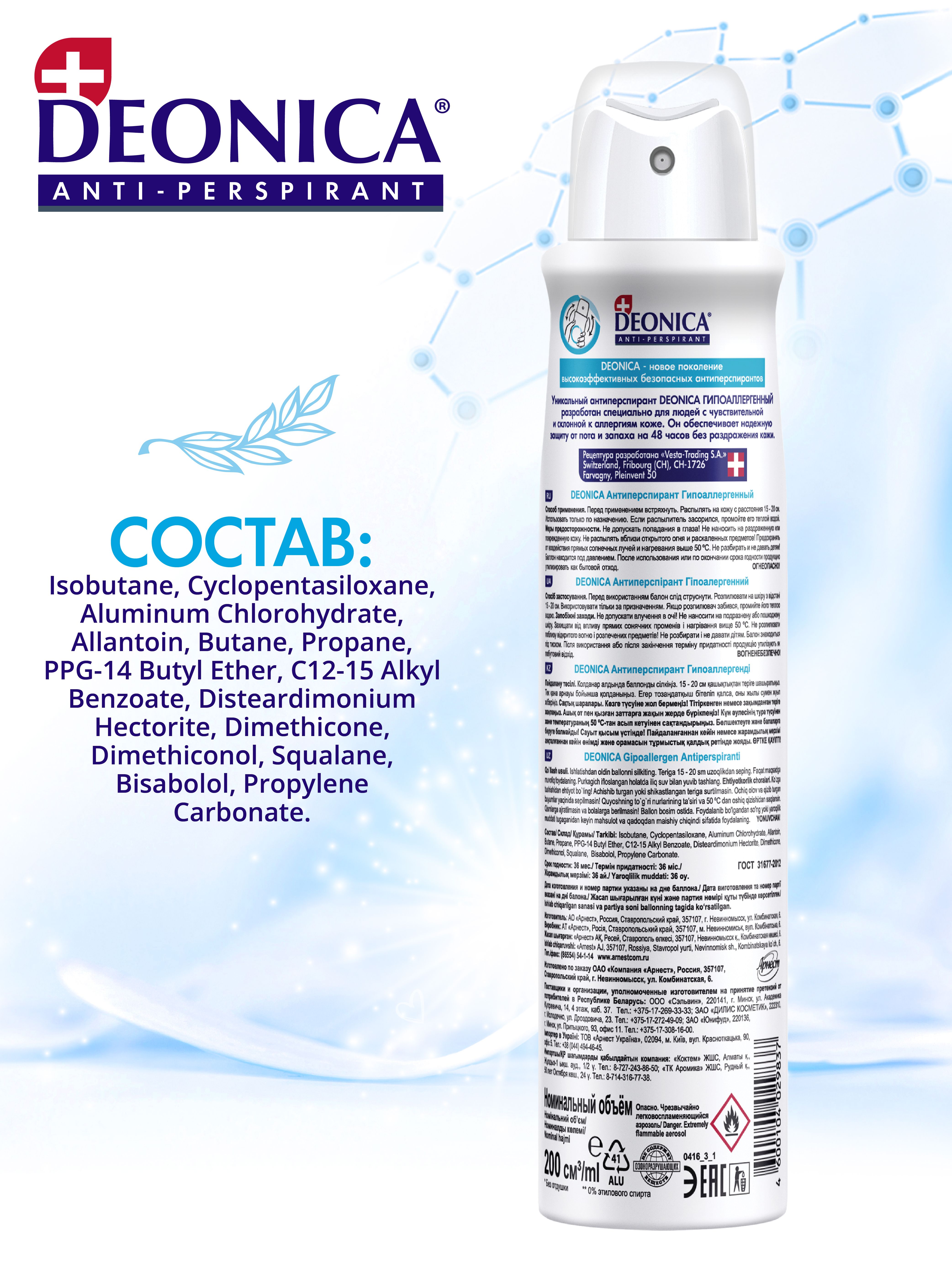 Описание: Текст при отключенной в браузере загрузке изображенийТвоя свежесть на 100%!Антиперспирант без запаха подходит для него и для нее! Deonica заботится не только о вашем комфорте, но и о вашей полке в ванной. Текст при отключенной в браузере загрузке изображенийУхаживай за кожей!Гипоаллергенный антиперспирант от Deonica - это надежная защита от пота и запаха, бережный уход за кожей и отсутствие пятен на одежде. Текст при отключенной в браузере загрузке изображенийБудь на высоте!С гипоаллергенным антиперспирантом можно быть уверенным в своем образе в течение всего дня. Текст при отключенной в браузере загрузке изображенийБережно и надежно!Антиперспирант не содержит спирта и консервантов, одобрен дерматологами для ежедневного применения.