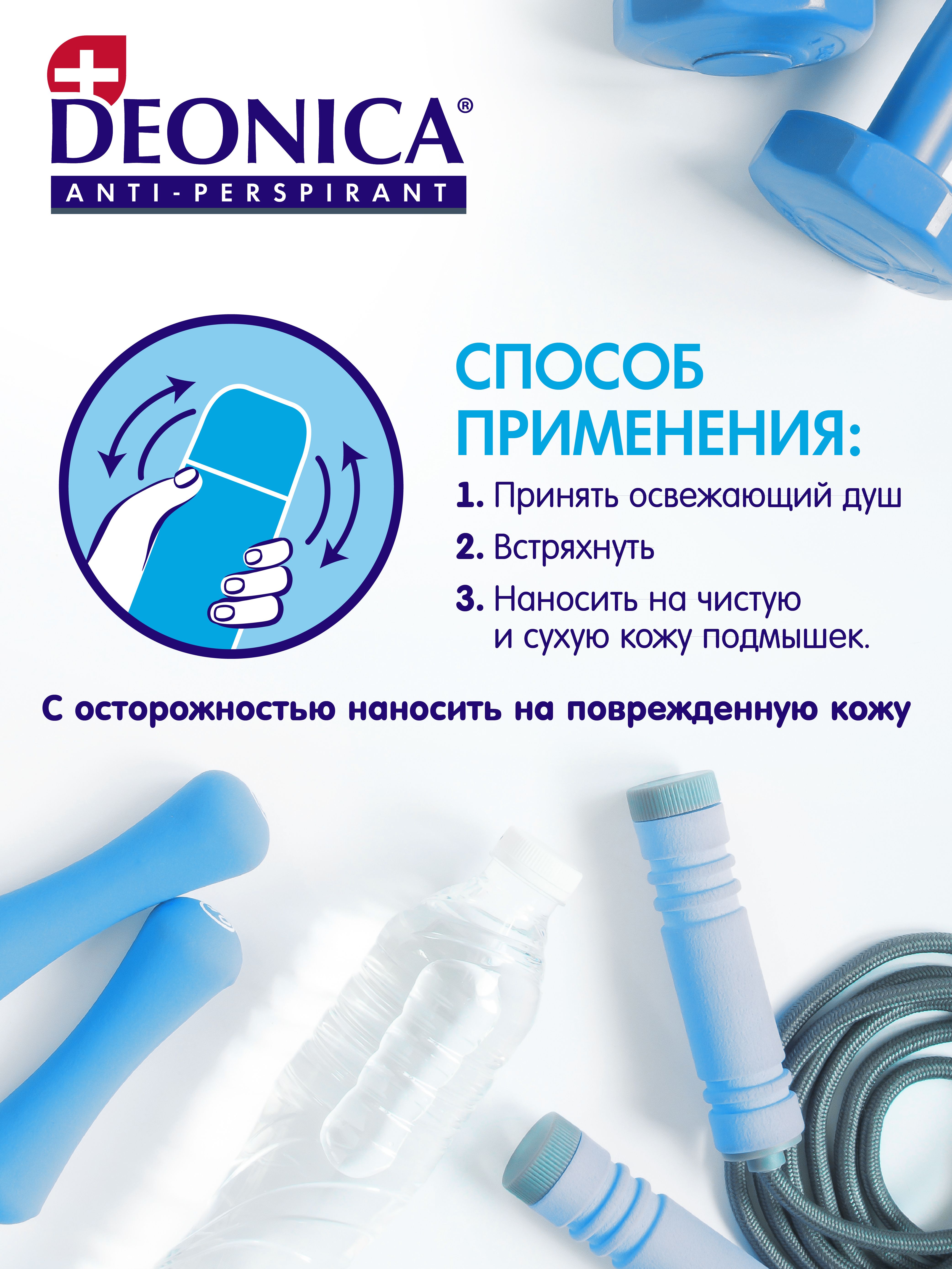 Описание: Текст при отключенной в браузере загрузке изображенийТвоя свежесть на 100%!Антиперспирант без запаха подходит для него и для нее! Deonica заботится не только о вашем комфорте, но и о вашей полке в ванной. Текст при отключенной в браузере загрузке изображенийУхаживай за кожей!Гипоаллергенный антиперспирант - это надежная защита от пота и запаха, бережный уход за кожей и отсутствие пятен на  одежде. Текст при отключенной в браузере загрузке изображенийБудь на высоте!С гипоаллергенным антиперспирантом можно быть уверенным в своем образе в течение всего дня до самого вечера. Текст при отключенной в браузере загрузке изображенийБережно и надежно!Антиперспирант не содержит спирта и консервантов, одобрен дерматологами для ежедневного применения.