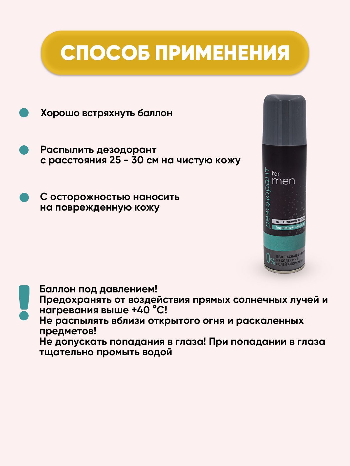 Способ применения: распылить дезодорант с расстояния 25 - 30 см на чистую кожу.