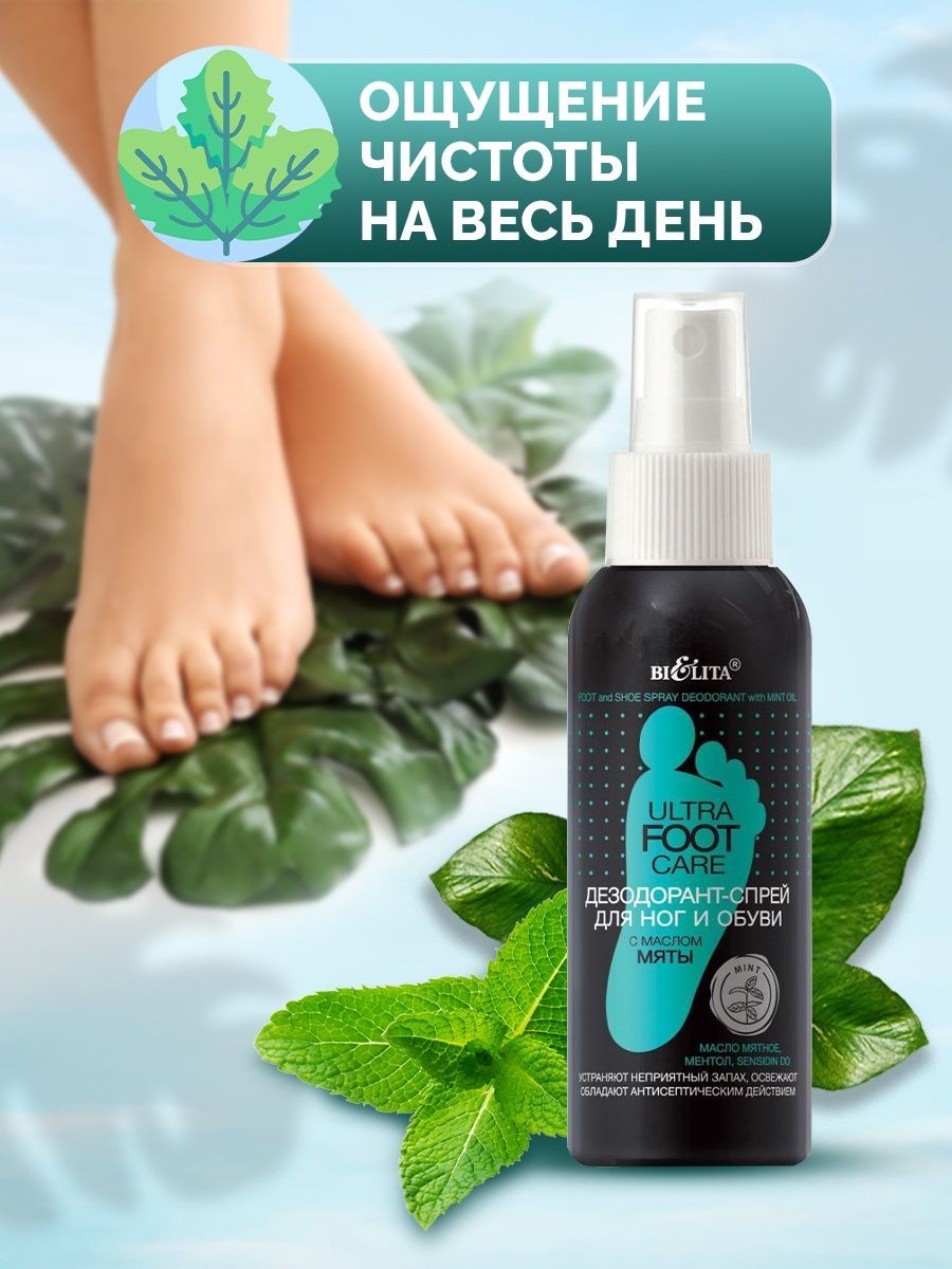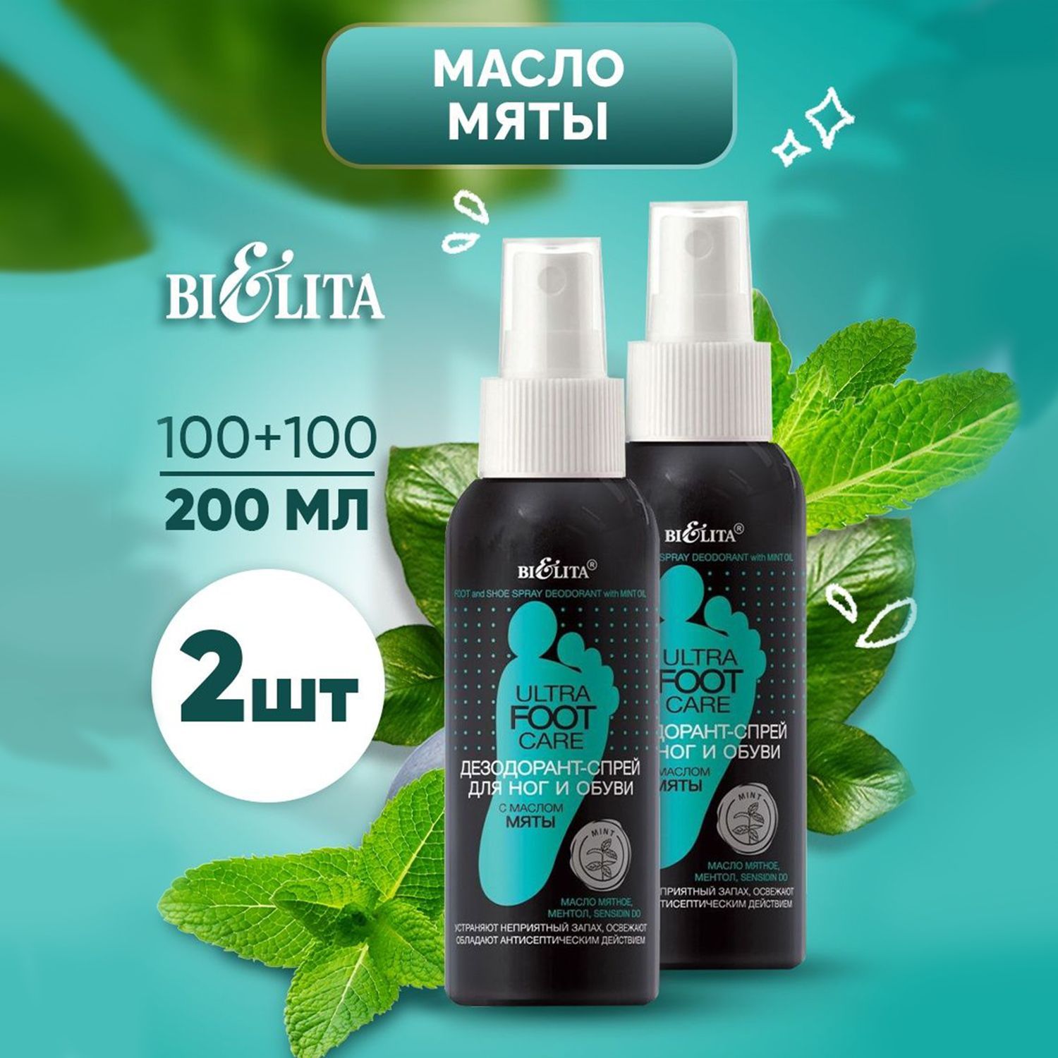Дезодорант для ног и обуви от запаха пота БЕЛИТА, антибактериальный успокаивающий спрей нейтрализатор с маслом МЯТЫ, поглотитель запахов / защита стоп и ногтей, 200 мл (2 шт по 100 мл)