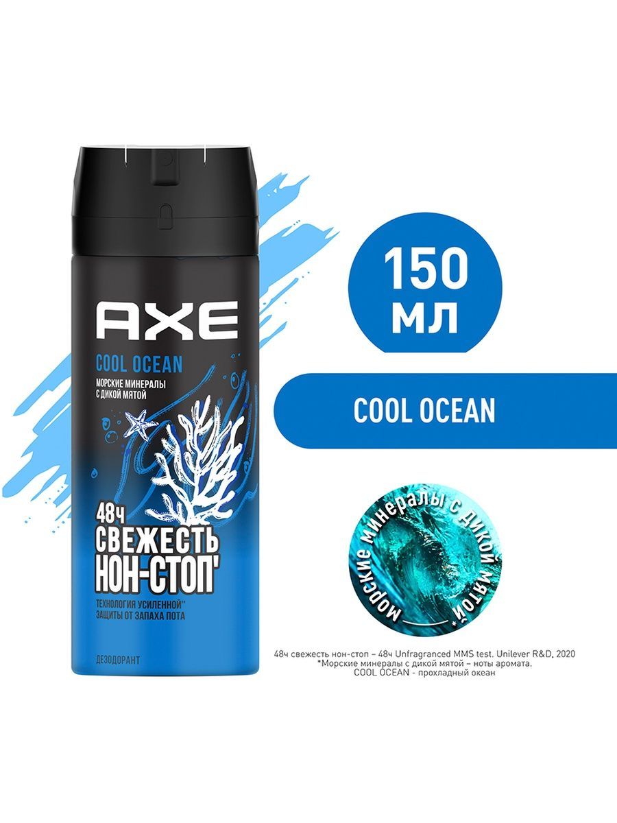 Описание: Дезодорант-спрей мужской AXE Cool ocean Морские минералы с дикой мятой, 150мл, Россия, 150 млДезодорант-спрей мужской AXE Cool ocean Морские минералы с дикой мятой – уверенность в защите на весь день и удовольствие при каждом использовании. 100% топовый аромат, как всегда, разработанный в сотрудничестве с одним из лучших парфюмерных домов, на этот раз раскрывается мощными акватическими аккордами в сочетании с дерзкой свежестью дикой мяты. В основе формулы – антибактериальная технология на основе цинка – усиленная защита от неприятного запаха до 48 часов. Она препятствует появлению неприятного запаха, при этом не содержит солей алюминия и позволяет коже дышать. Забудь про следы на одежде и неприятный запах. Только ощущение свежести, и крутой современный аромат.
