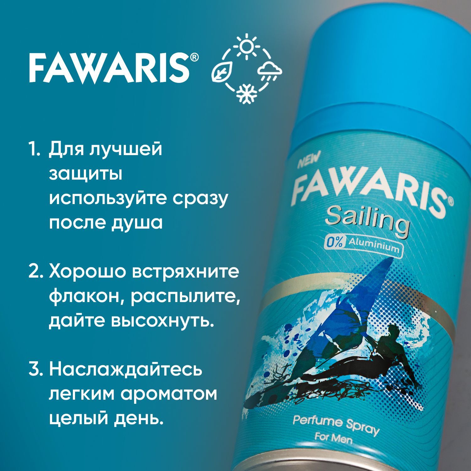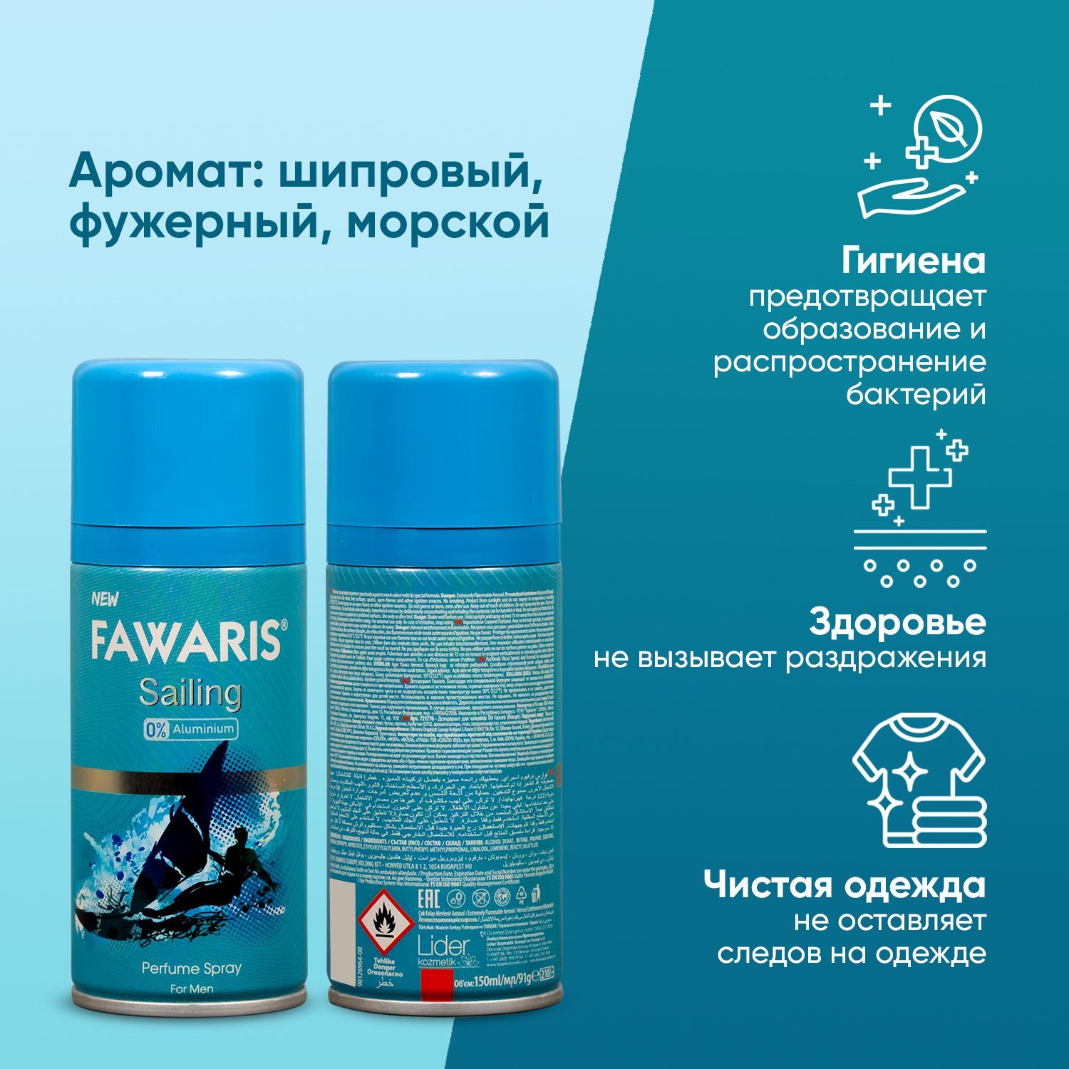 Sailing– мужской аромат в линейке популярных и недорогих турецких парфюмированных спрей-дезодорантов Fawaris. Отлично справляется с неприятными запахами, подходит любому типу кожи, в том числе и чувствительной. Защитит от неприятного запаха на 24 часа.