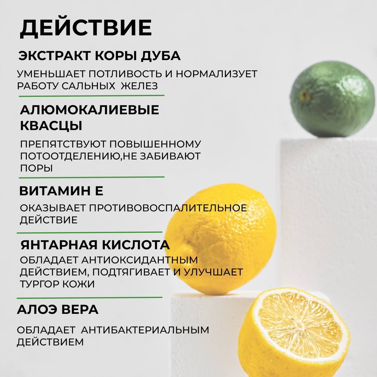 вода, алюмокалиевые квасцы, алоэ вера гель, глицерин, экстракт коры дуба, янтарная кислота, витамин Е, парфюм