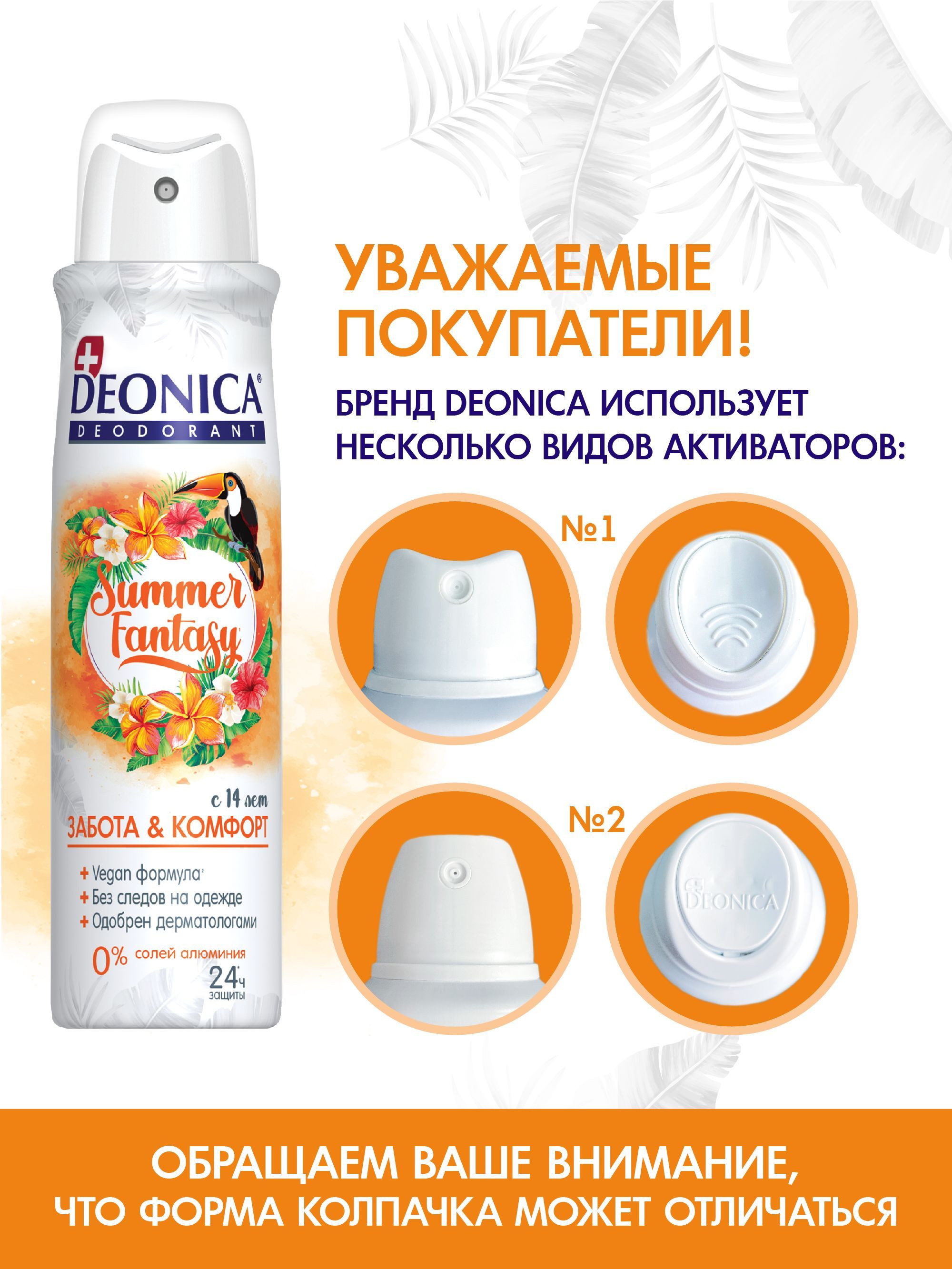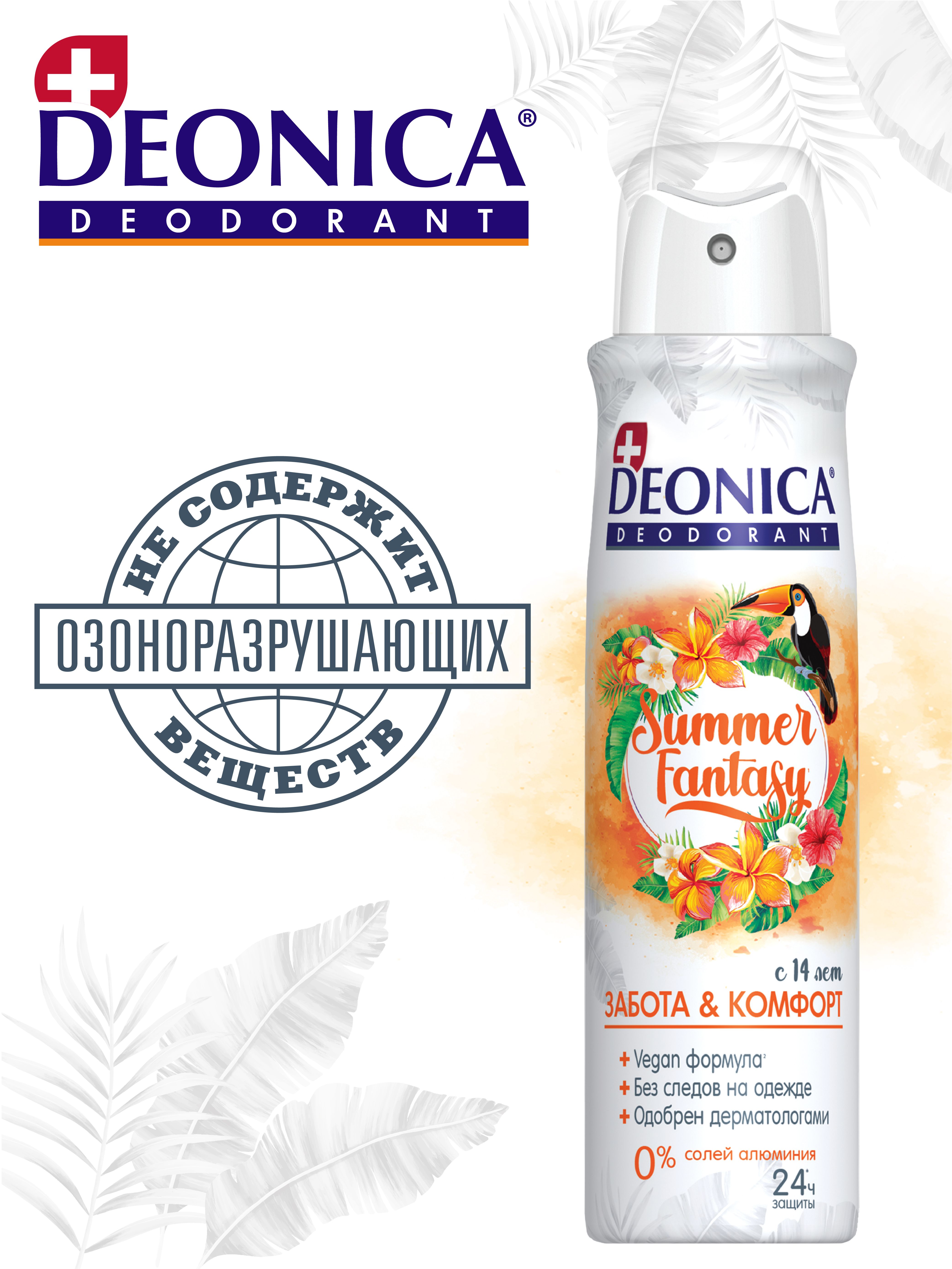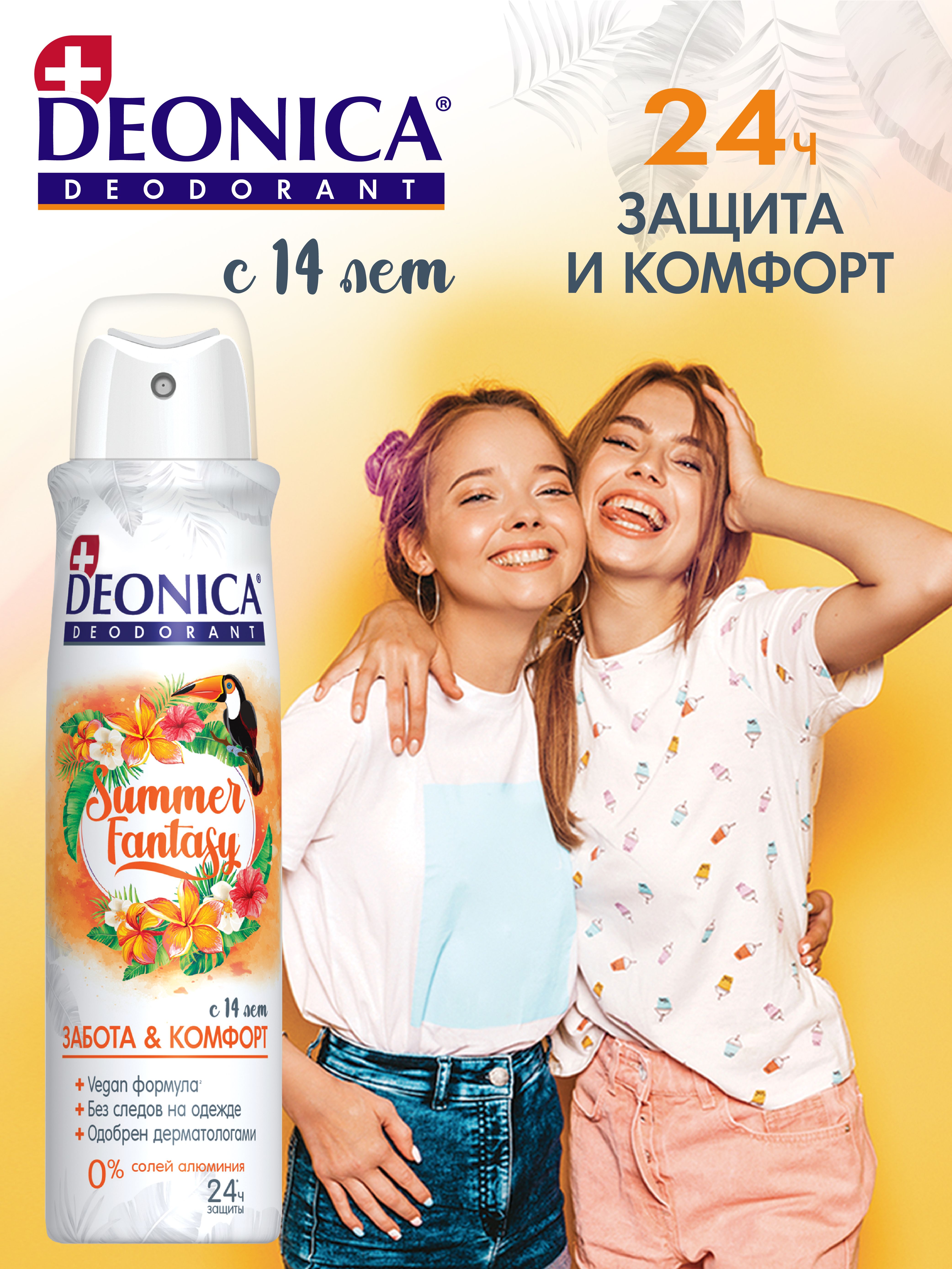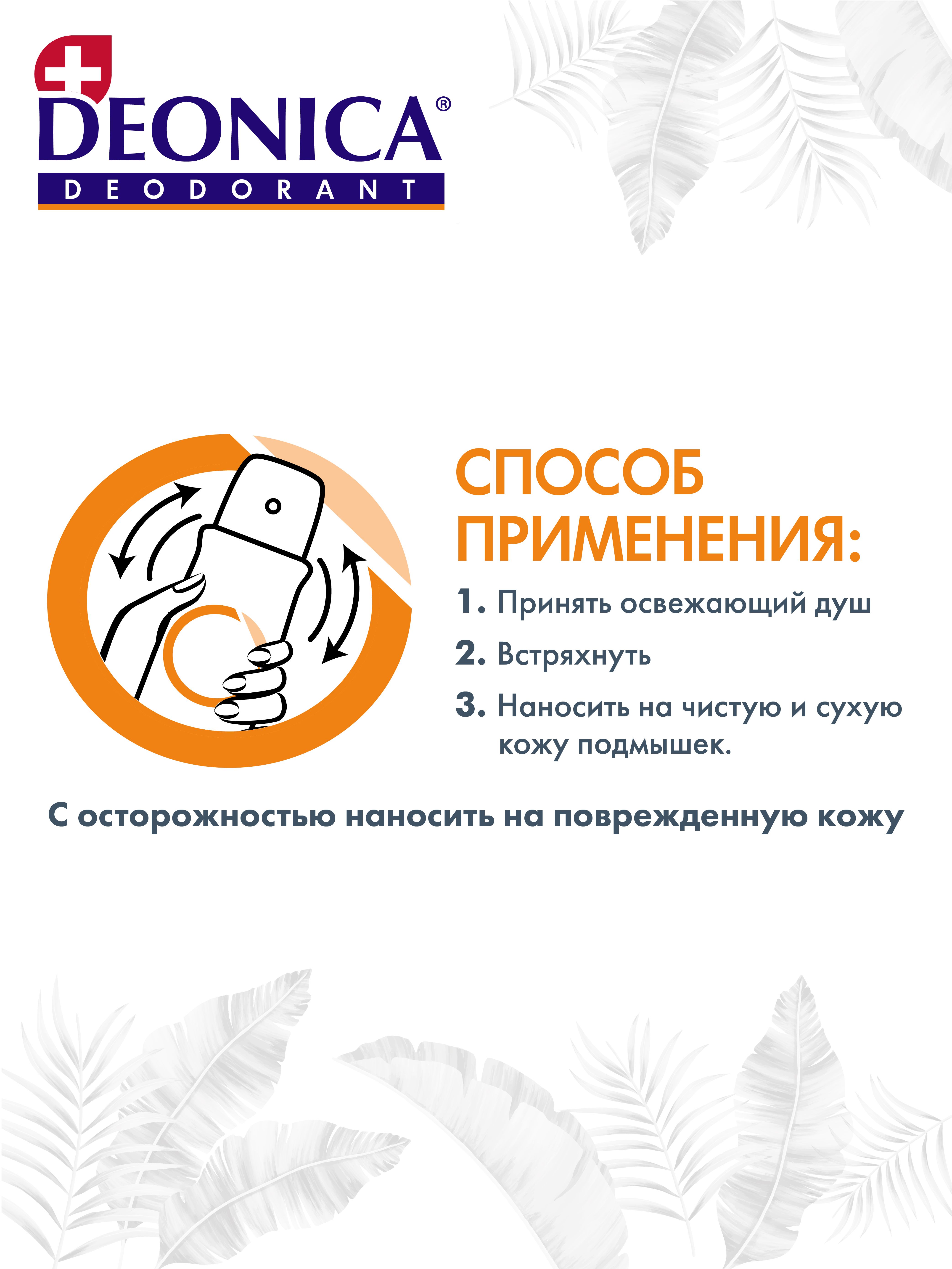 Описание: Текст при отключенной в браузере загрузке изображенийЗащита и комфорт на 24 часа!Уникальный, яркий и крутой дезодорант с веган формулой. Яркий дизайн и сложный аромат, который раскрывается в течение дня и меняется вместе с тобой! Текст при отключенной в браузере загрузке изображений100% контроль свежести!Дезодорант с веган формулой - это забота и комфорт в течение всего дня!Текст при отключенной в браузере загрузке изображенийБез пятен и без раздраженияДезодорант  не оставляет пятен на одежде и не вызывает раздражения на коже. Текст при отключенной в браузере загрузке изображенийБезопасно и надежноДезодорант для женщин и девушек, одобрен дерматологами.Текст при отключенной в браузере загрузке изображенийПробуй их все и выбери свой!Попробуйте дезодоранты и антиперспиранты летней серии от Deonica и выберите свой уникальный аромат!