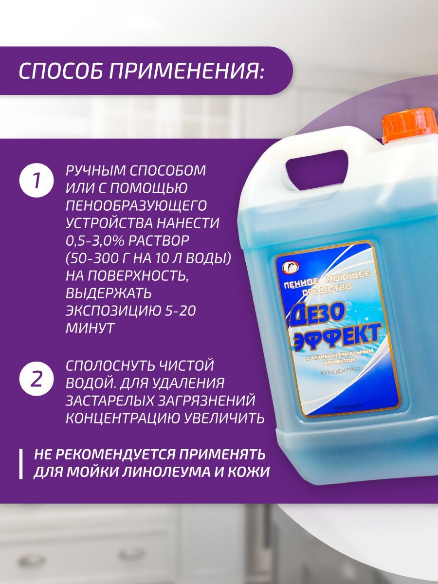 Описание: «Дезоэффект» - это универсальное дезинфицирующее моющее средство, которое подходит для использования на различных поверхностях, включая акриловые ванны, холодильники, инструменты, тару, полы и стены на предприятиях пищевой промышленностии в быту. Дезинфицирующее средство для поверхностей отлично моет в холодной воде и придает блеск, также может использоваться для удаления неприятных запахов. Средство для дезинфекции инструментов«Дезоэффект» обладает выраженными антибактериальными свойствами и эффективно обеззараживает технологическое оборудование, емкости, резервуары, разделочные столы и другие поверхности. Средство дезинфицирующее 1л может использоваться для ручной мойки или с помощью пенообразующих устройство: пенных станций, пеногенераторов, пенопистолетов. Дезинфицирующее средство для поверхностей«Дезоэффект» также эффективно в отношении различных микроорганизмов и вирусов, включая кишечную палочку, золотистый стафилококк, синегнойную палочку, кандиду, вирус герпеса. Это делает средство для дезинфекции поверхностей подходящим для обработки в комнатах личной гигиены и для дезодорации санитарно-технического оборудования в столовых, больницах, госпиталях, санаториях. Средство для уборки отличается экономичностью при использовании и подходит для уборки поверхностей на предприятиях пищевой промышленности и в других коммерческих организациях.