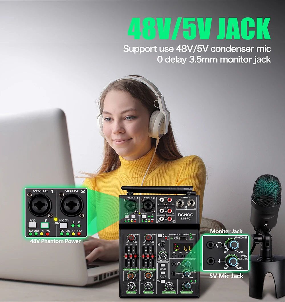 Built-in 2-channel wireless microphone】DGNOG R4-RRO Mixer Console with 2 UHF Frequency handheld microphones. A collection of microphones and mixers,microphone powered from 2 AA batteries and can work for 3-5 hours,and more convenient to use.CHA 576.1-590.1Mhz,CHB 560.1-574.1Mhz