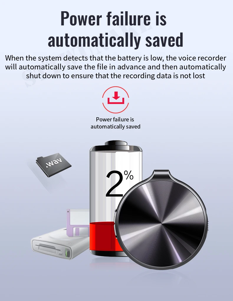 Когда система обнаруживает, что батарея разряжена, диктофон автоматически сохраняет файл заранее, а затем автоматически отключается, чтобы гарантировать, что данные записи не потеряны.