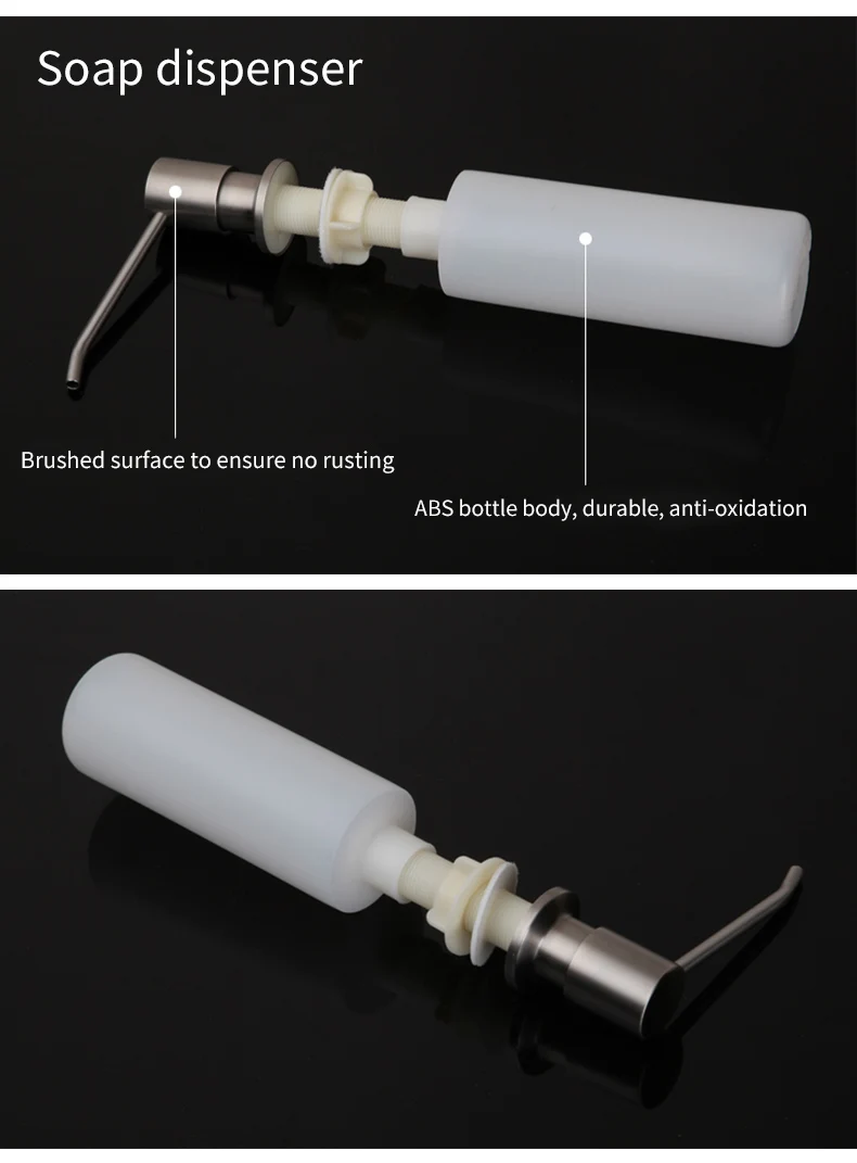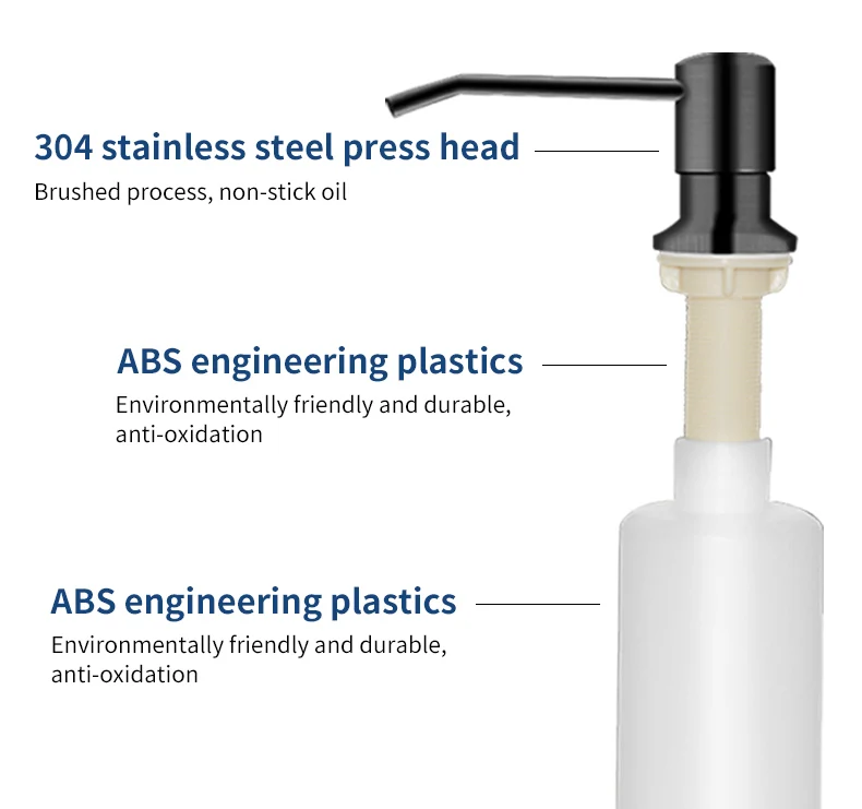 Дозатор мыла изготовлен из прижимной головки из нержавеющей стали 304 (окрашенная поверхность) + корпус бутылки из полипропилена (емкость 300 мл) и новый материал ABS, а отверстия для раковины 25-36 мм можно использовать универсально.