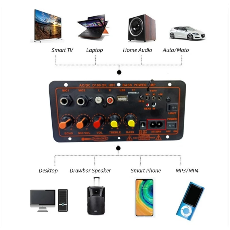 DIY цифровой Bluetooth 5,0 Плата усилителя 220 В 12 В 24 В сабвуфер Двойной микрофонный усилитель для автомобиля Домашнее аудио USB FM радио TF плеер