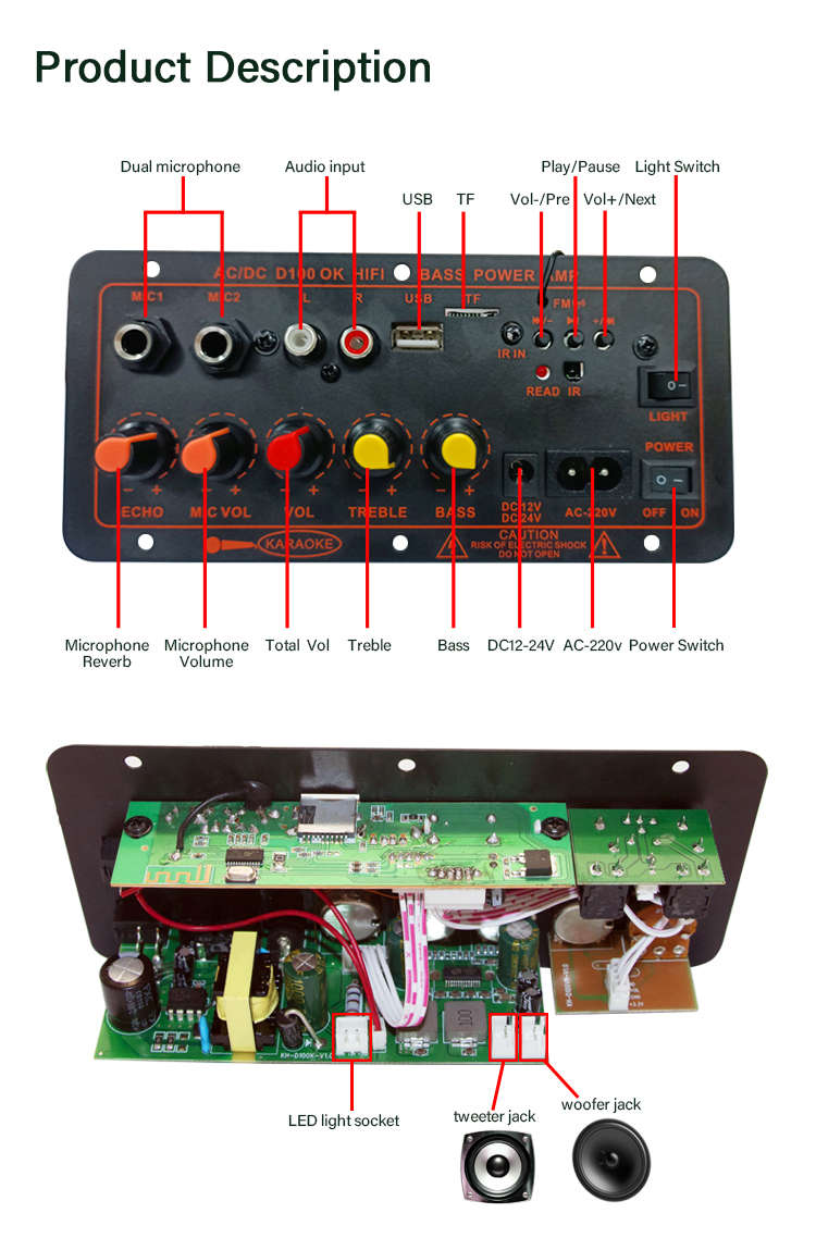 -Двойной микрофонный вход, регулируемая реверберация, с Bluetooth и FM-радио.