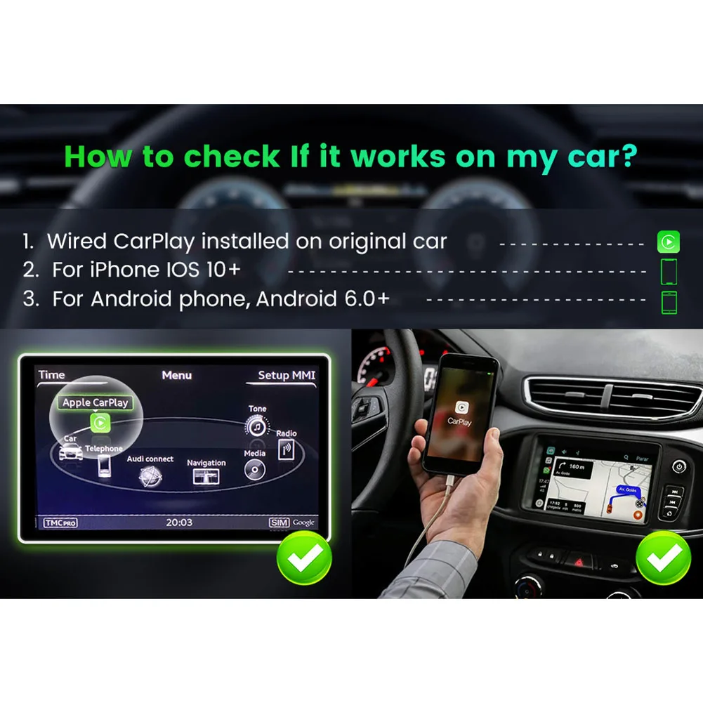 Оригинальная Автомобильная машина подтверждает, что она поддерживает проводную функцию Carplay, прежде чем функция беспроводной Carplay может быть реализована путем установки этого устройства.