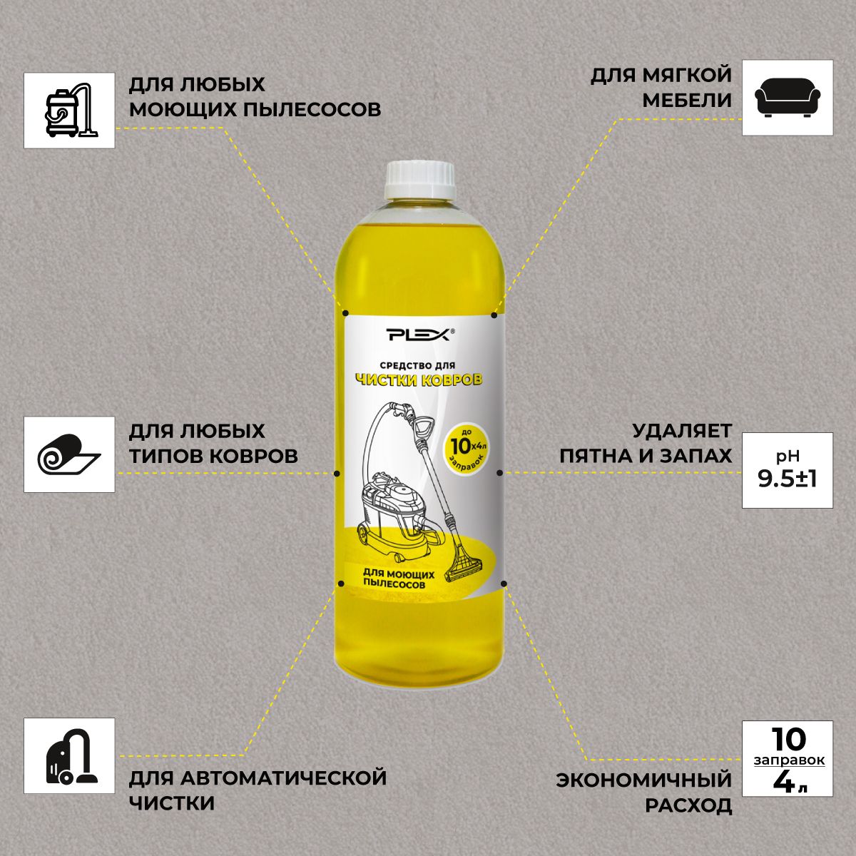 Высокоэффективное средствоКачественная бытовая химия PLEX для чистки ковров предназначена для удаления пятен, загрязнений и неприятного запаха с любых видов ковров и ковровых покрытий из шерсти, хлопка, синтетических и других материалов. Универсальное моющее средство подходит для обивки мягкой мебели, автомобильных кресел и других изделий с тканевой обивкой, глубоко проникает в волокна материалов и очищает от загрязнений, не причиняя вреда. Освежает цвет изделий, не портит структуру волокон и защищает от неблагоприятного воздействия окружающей среды.СРЕДСТВО ДЛЯ АВТОМАТИЧЕСКОЙ ЧИСТКИ КОВРОВ PLEX LIGHTЖидкое моющее средство эффективно удаляет трудные пятна с пола, ковров и текстильной обивки мебели, оставляя после себя приятный аромат. Освежает изделия и ковровые покрытия, быстро высыхает и не портит структуру волокон.