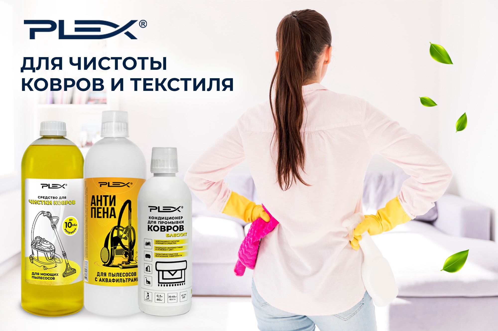 Бытовая химия для чистки текстиля и ковровых покрытий PLEX не только удаляет бытовые загрязнений и неприятные запахи, но и служит для улучшения внешнего вида изделия, придания мягкость ворсу, предотвращает излишнее налипание пыли. После чистки важным этапом является обработка Кондиционером для промывки текстиля, ковров и мягкой мебели PLEX - это улучшает качество чистки, смягчает ворс ковровых покрытий, ускоряет сушку.