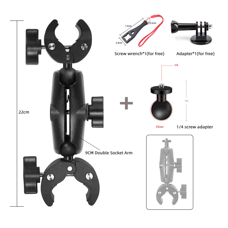 • Двойная шаровая Головка с вращением на 360 градусов】 Это велосипедное крепление для камеры имеет конструкцию с двойной шаровой головкой, верхнюю и нижнюю части можно регулировать на 360 градусов по своему усмотрению, чтобы отрегулировать направление съемки, зажим более стабильный, и не будет смещен или ослаблен. Нет необходимости беспокоиться о стабильности даже при длительных движениях, езде или статическом зажиме.