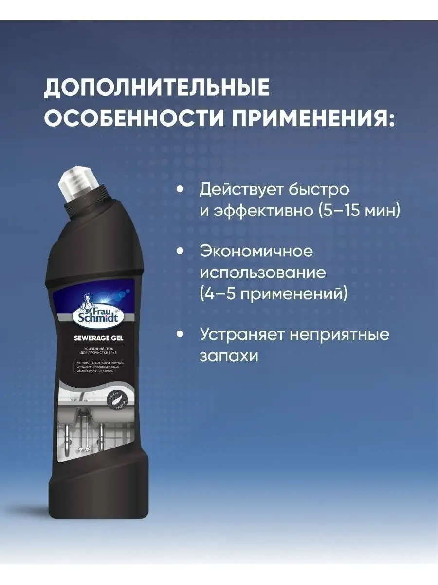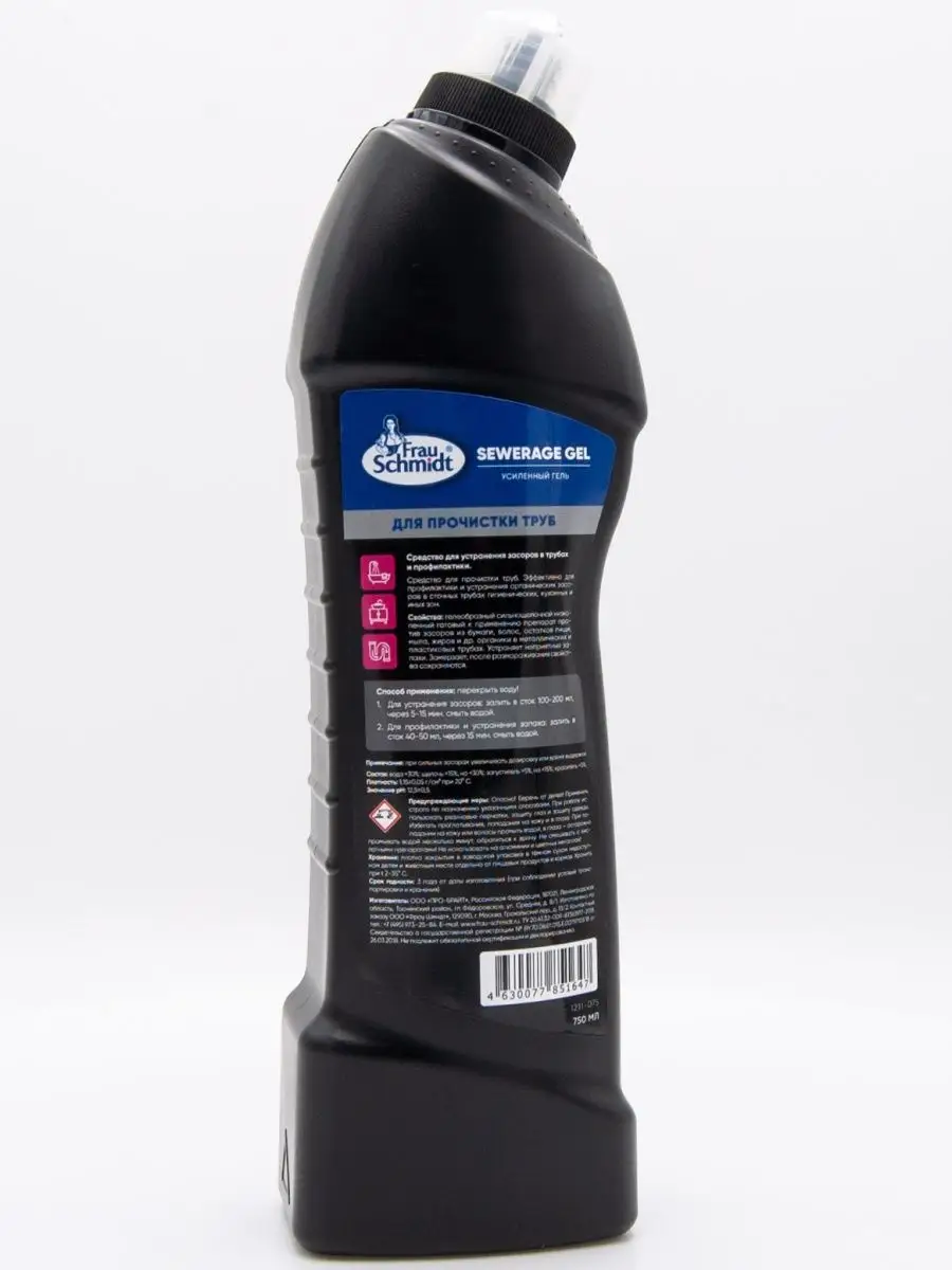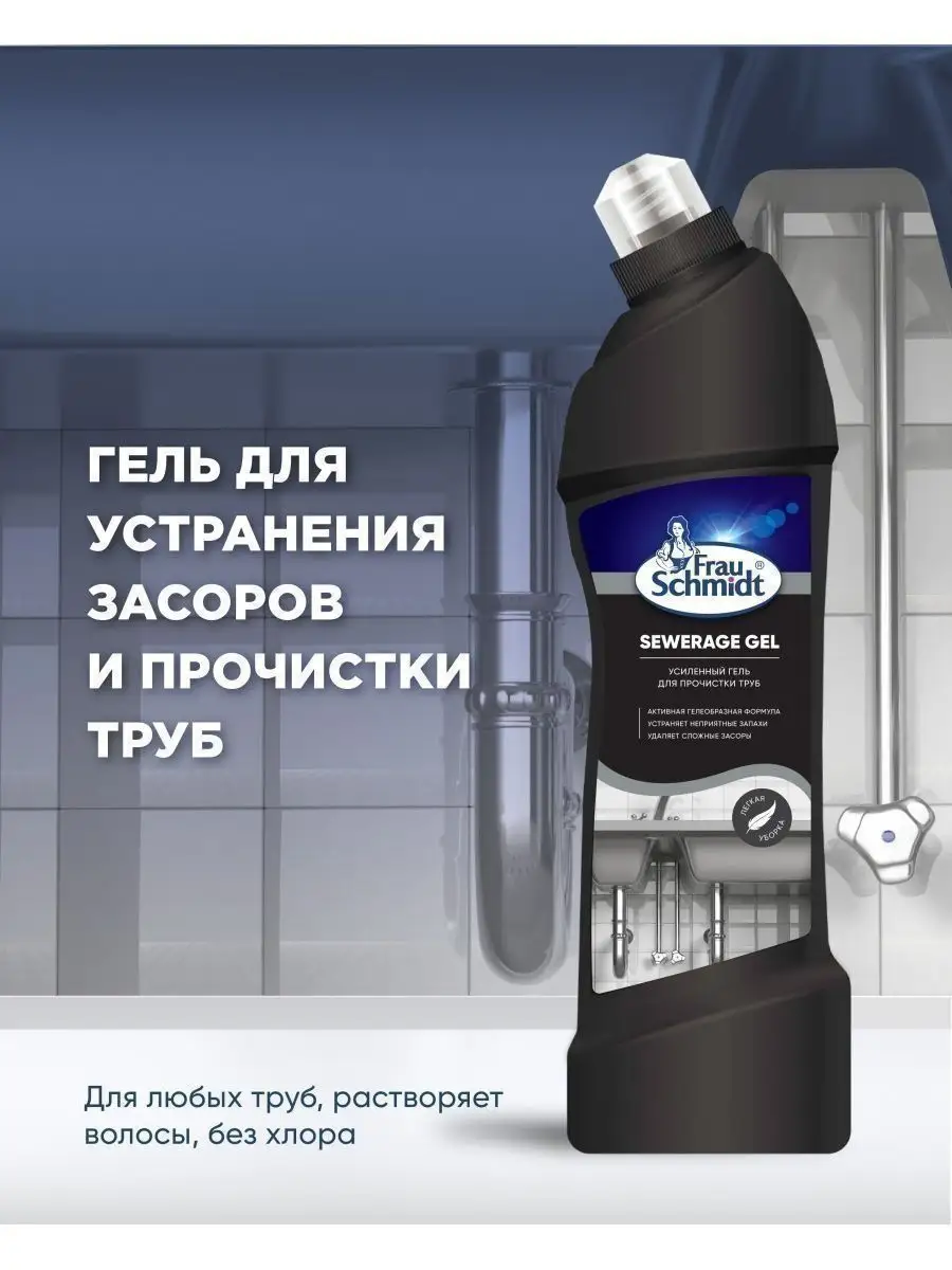 Описание: Frau Schmidt Усиленный гель для прочистки труб – это специальное средство для прочистки труб профилактики и устранения всех типов засоров в сточных трубах. Мощное средство подходит для дома и кухни, ванной и туалета. Гелеобразный сильнощелочной низкопенный готовый к применению препарат против засоров из бумаги и волос, остатков пищи, мыла, белков и жиров и др. органики в металлических и пластиковых трубах. Устраняет неприятные запахи в трубах и канализации и придает кухне или туалетной комнате свежий аромат. Гель Фрау Шмидт безопасен для пластика и легко прочистит сифон. Средство как крот проникает в самые глубокие засоры и тщательно вычищает загрязнение не оставляя никаких повреждений и неприятных запахов. Форма бутылки обеспечивает удобное применение и дозирование средства. Густая формула геля обеспечивает экономичный расход. Средство эффективно в том числе и в стоячей воде. Не содержит хлор. Устраняет засоры в течении 10-15 минут. Способ применения: перекрыть воду! 1. Для устранения засоров: залить в сток 100-200 мл, через 5-15 мин. смыть водой. 2. Для профилактики и устранения запаха: залить в сток 40-50 мл, через 15 мин. смыть водой.