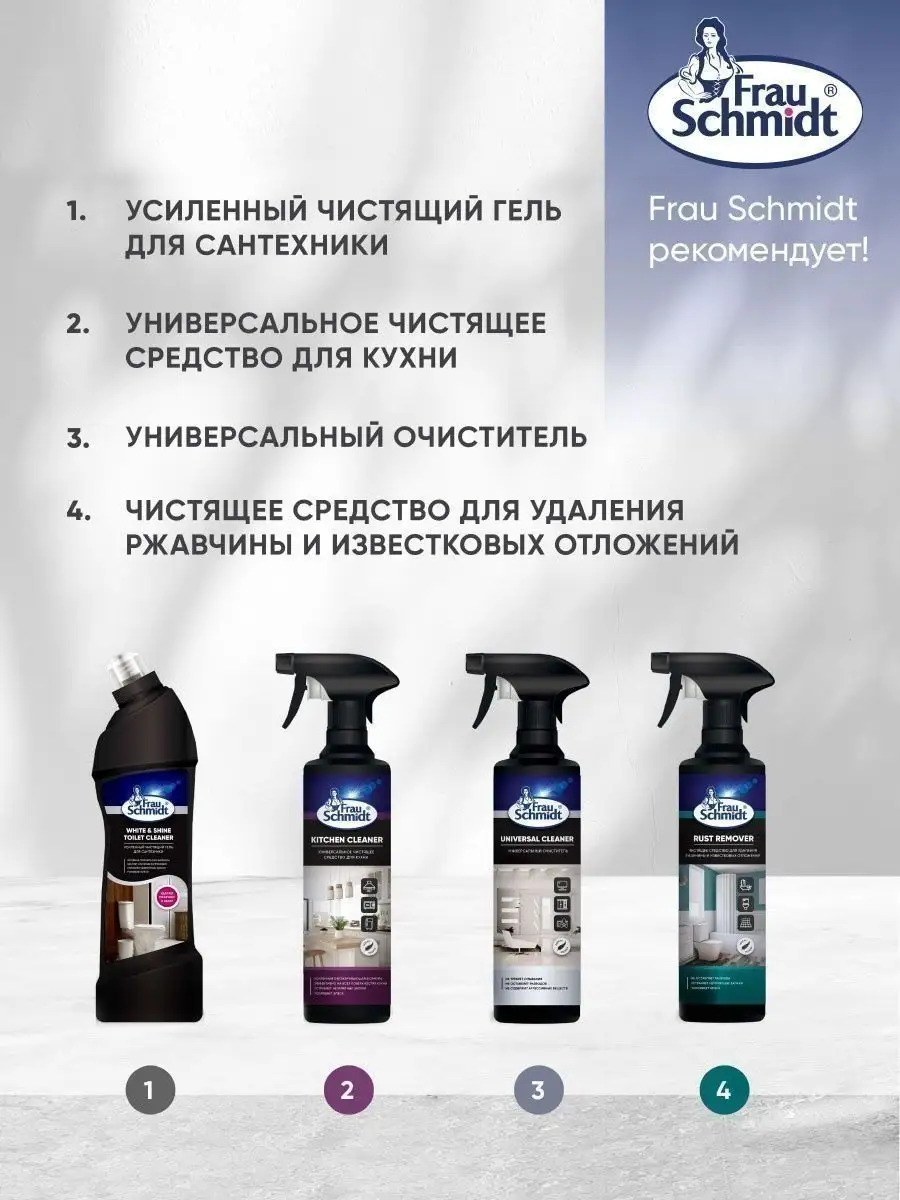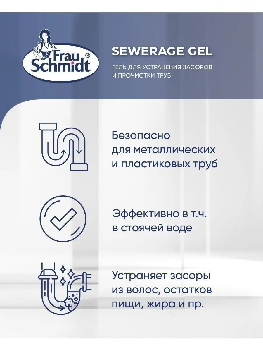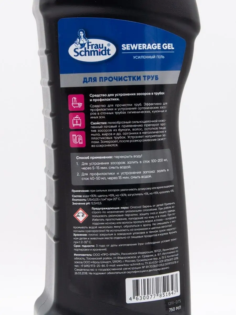 Описание: Frau Schmidt Усиленный гель для прочистки труб – это специальное средство для прочистки труб профилактики и устранения всех типов засоров в сточных трубах. Мощное средство подходит для дома и кухни, ванной и туалета. Гелеобразный сильнощелочной низкопенный готовый к применению препарат против засоров из бумаги и волос, остатков пищи, мыла, белков и жиров и др. органики в металлических и пластиковых трубах. Устраняет неприятные запахи в трубах и канализации и придает кухне или туалетной комнате свежий аромат. Гель Фрау Шмидт безопасен для пластика и легко прочистит сифон. Средство как крот проникает в самые глубокие засоры и тщательно вычищает загрязнение не оставляя никаких повреждений и неприятных запахов. Форма бутылки обеспечивает удобное применение и дозирование средства. Густая формула геля обеспечивает экономичный расход. Средство эффективно в том числе и в стоячей воде. Не содержит хлор. Устраняет засоры в течении 10-15 минут. Способ применения: перекрыть воду! 1. Для устранения засоров: залить в сток 100-200 мл, через 5-15 мин. смыть водой. 2. Для профилактики и устранения запаха: залить в сток 40-50 мл, через 15 мин. смыть водой.