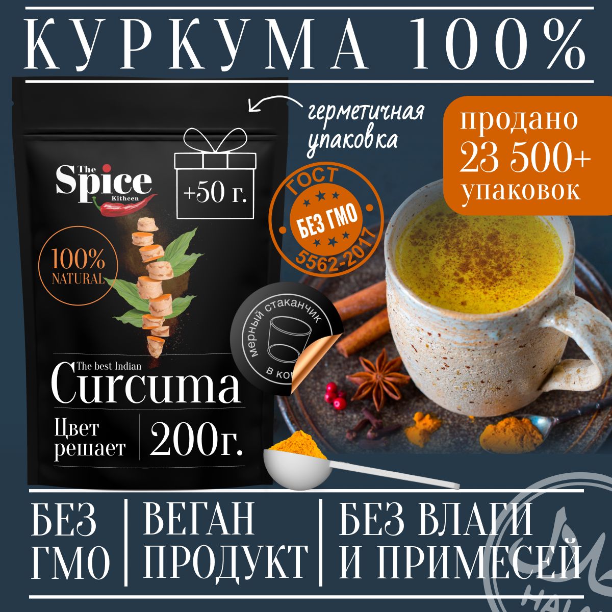 Описание: Куркума - солнечная пряность, которая повысит иммунитет и усилит яркость ваших блюд. Наша куркума изготовлена по ГОСТу без красителей, примесей и усилителей вкуса. Куркумин - мощный антиоксидант с богатым витаминно-минеральным составом. Куркума это уникальная специя из Индии без которой на Востоке не обходится ни одно блюдо. Добавлять в пищу надо небольшие порции приправы, чтобы насытить вкус и цвет продукта. Простые блюда в дуэте с куркумой получаются вкусными. Например: рис, картофель, рыба, мясо, сыры, овощи, крупы, фрукты, ягоды, макаронные изделия. Добавляют в чай, выпечку, супы, салаты. Мелкий помол без комочков и посторонних примесей имеет рассыпчатую текстуру и равномерный оранжево-желтый оттенок. Аромат схож с миксом запаха имбиря и апельсина, имеет свежий пряно-древесный подтон. Выбирайте фасовку на любой случай: компактную или большую, чтобы хватило надолго. Герметичная упаковка на 100% сохранит все свойства приправы и защитит от влаги и солнечного света. На выбор различная фасовка и упаковка