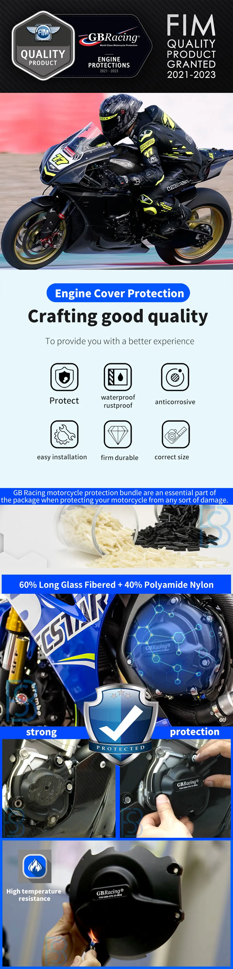 Революционно новый прочный ударопрочный композитный материал GB Racing, изготовленный из 60% длинного стекловолокна и нейлона, обеспечивает максимальную защиту вашей машины! Прочный длинный нейлон из стекловолокна-это устойчивый к ударам и истиранию материал, который предназначен для поглощения энергии без растрескивания в большинстве ситуаций для многократного использования. Разработан с учетом эстетики и может быть установлен поверх существующей крышки двигателя OEM. Это болт на продукте, позволяющий быстро и легко снимать и/или заменять без необходимости снимать оригинальную крышку.