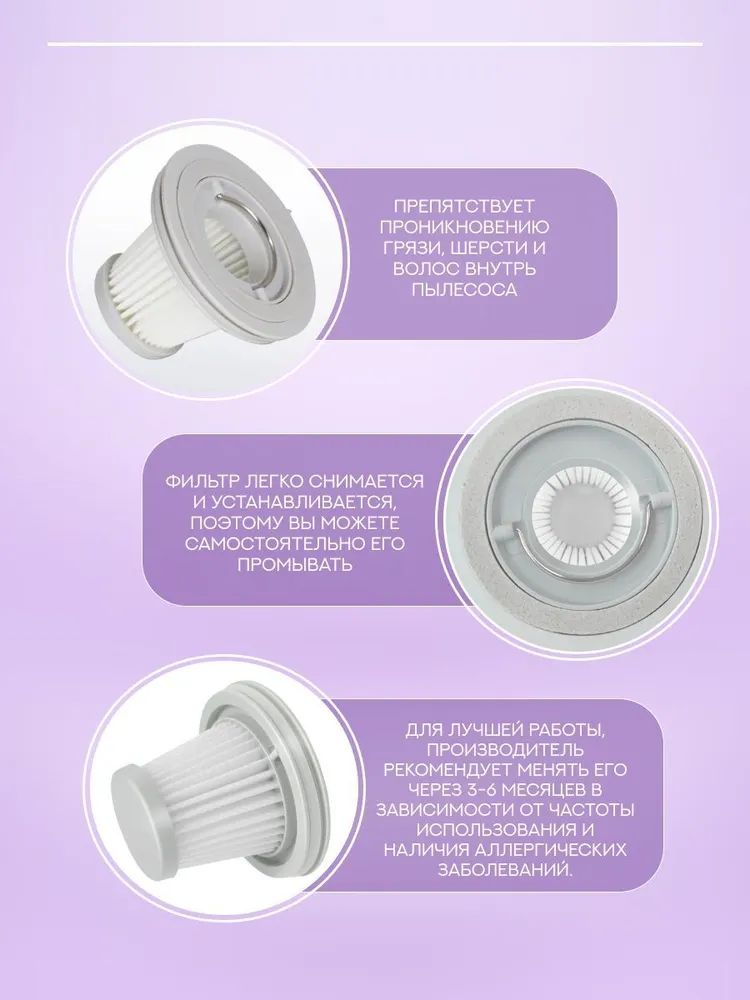 НЕРА-фильтр очень хорошо очищает воздух, удерживает почти всю пыль и аллергены. Фильтр для ручного беспроводного мини-пылесоса очищает выходящий из пылесоса воздух. Активно удаляет из него пыль и грязь.Фильтр для ручного беспроводного мини-пылесоса Xiaomi препятствует проникновению грязи, шерсти и волос внутрь пылесоса. Удаляет до 99,9% твердых и микроскопических частиц пыли из воздуха. Сменный фильтр для ручного беспроводного мини-пылесоса можно мыть. Фильтр легко снимается и устанавливается, поэтому вы можете самостоятельно его промывать. Воздушный фильтр может использоваться в течение длительного времени за счет периодического мытья. Для лучшей работы производитель рекомендует менять его через 3-6 месяцев в зависимости от частоты использования и наличия аллергических заболеваний.Фильтр HEPA изготовлен из высококачественных материалов. Обладает высокими удерживающими свойствами, обеспечивает качественную уборку.